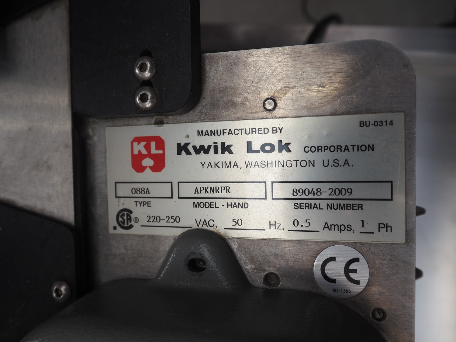 Kwik Lok bag clipper, type: 088A, model: APKNRPR, serial number: 89048-2009, 220-250 V, 1 Ph, 50 Hz, 0.5 A, dimensions: 700 mm x 330 mm x 900 mm.