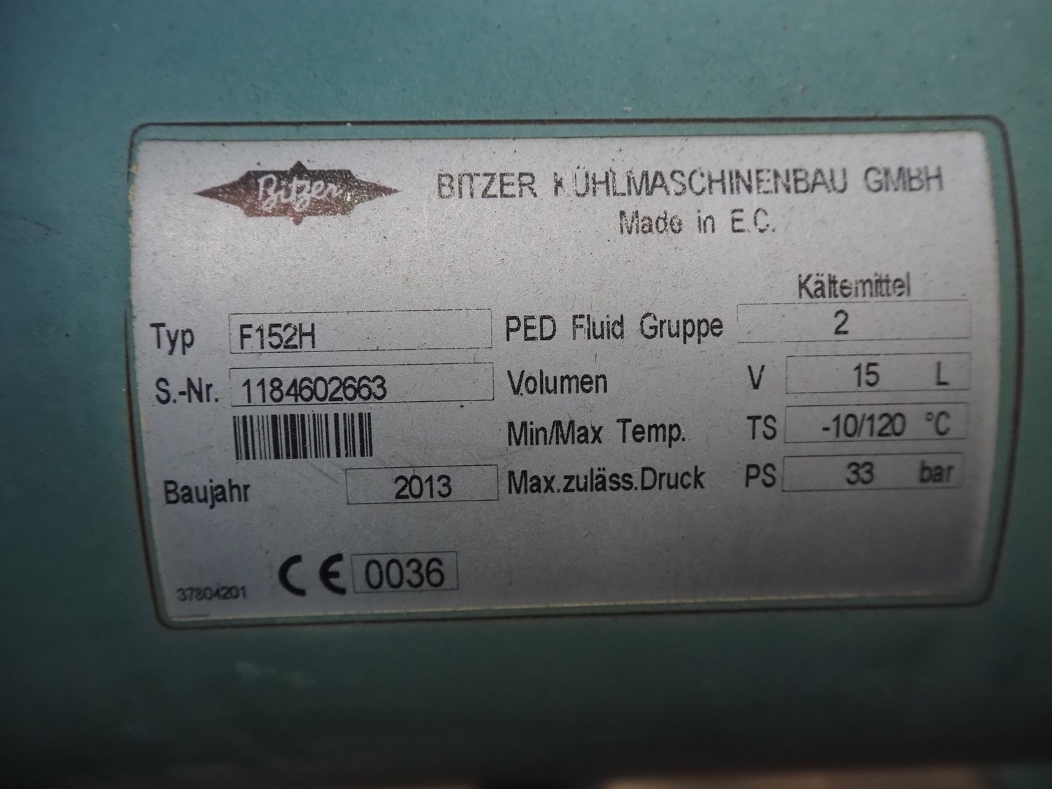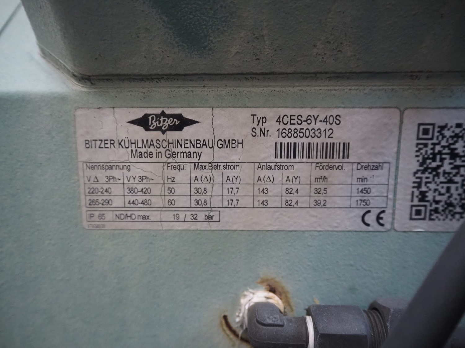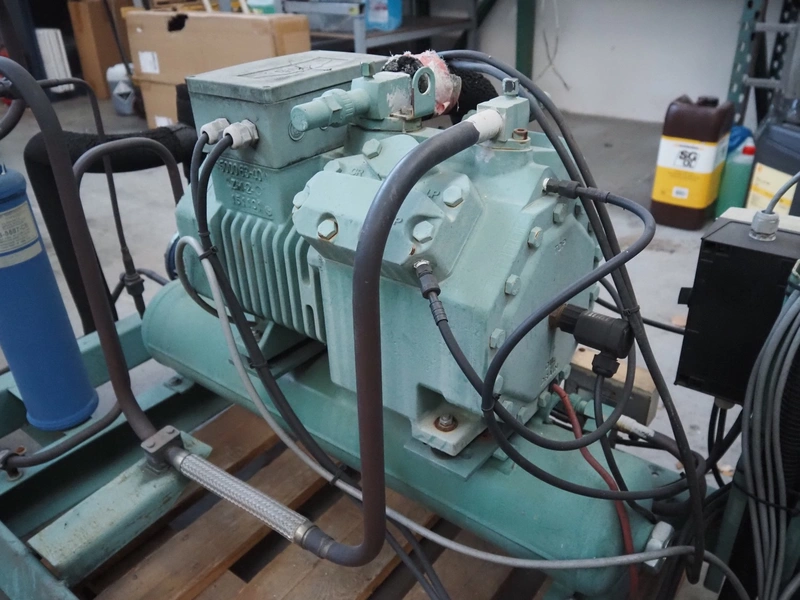 Bitzer Kühlmaschinenbau GmbH cooling compressor, type: 4CES-6Y-40S, serial number: 1688503312, 220-240 V, 50 Hz, 30.8 A, capacity: 32.5 / 39.2 m³ per hour, dimensions: 1500 mm x 1200 mm x 1000 mm.