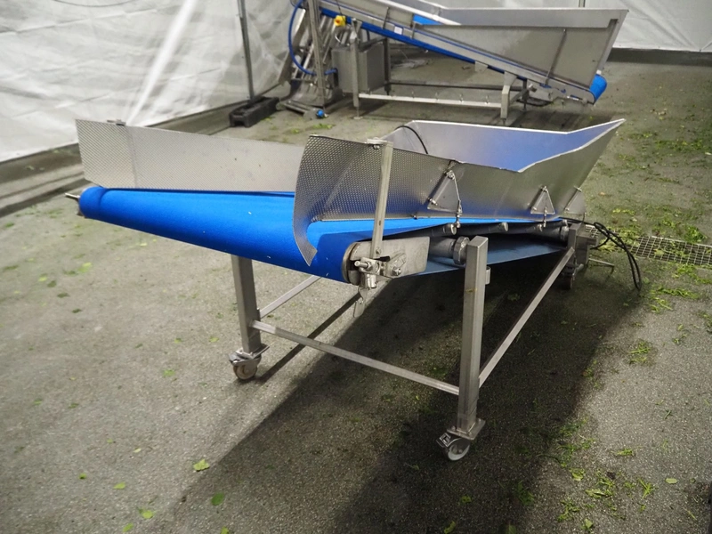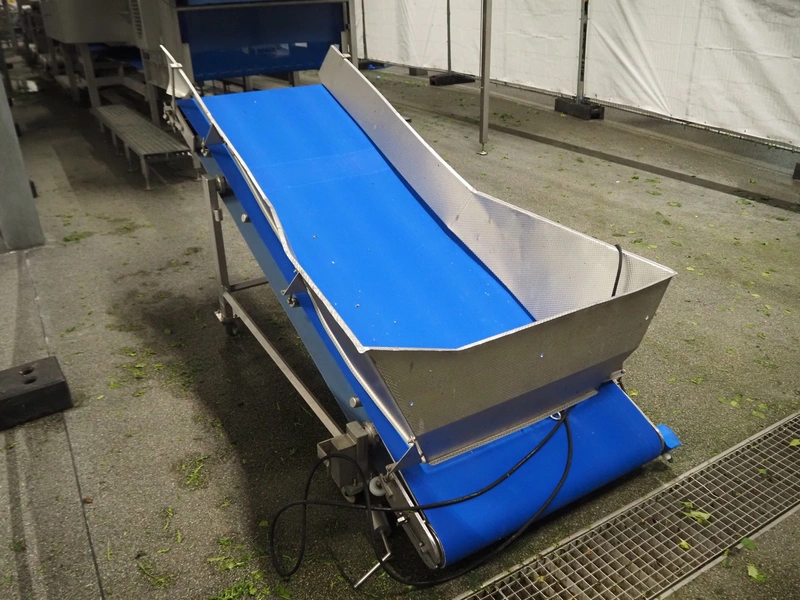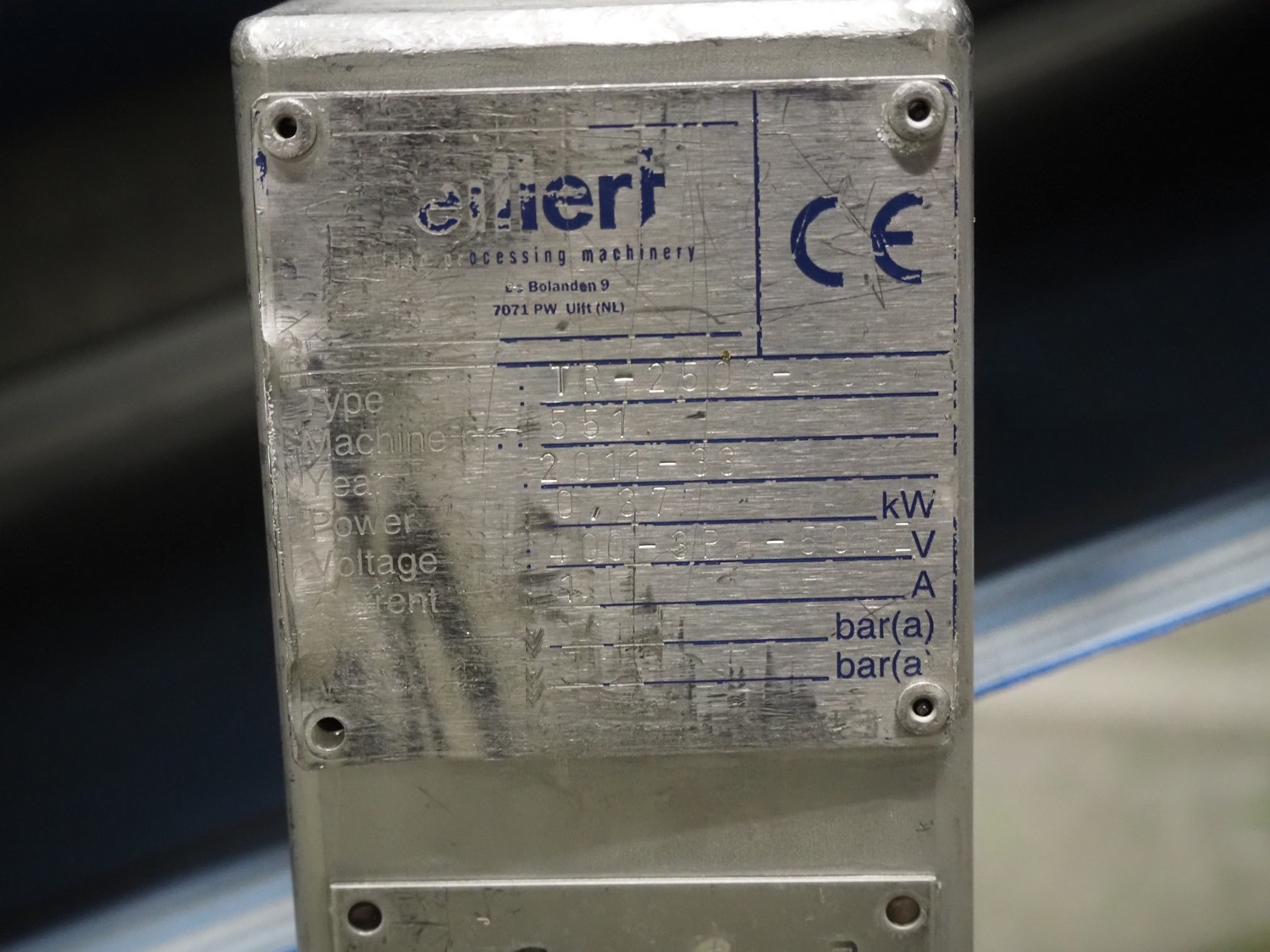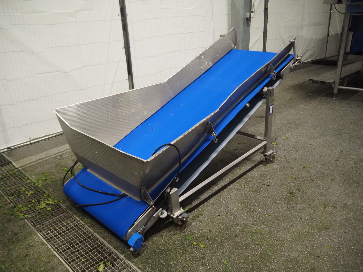 Eilert B.V. elevating belt, type: TR-2500, machine number: 551, year of construction: 2011, 400 V, 3 Ph, 50 Hz, 0.37 kW, plastic belt, belt width: 880 mm, elevating height: 1100 mm, total dimensions: 2500 mm x 1100 mm x 1300 mm.