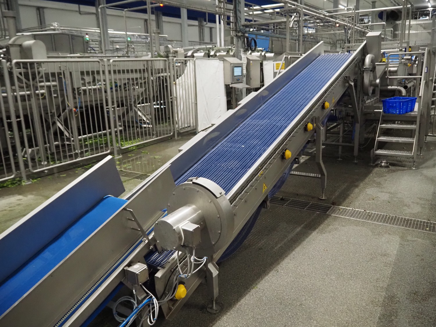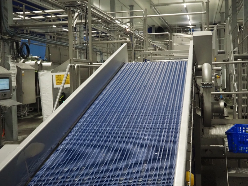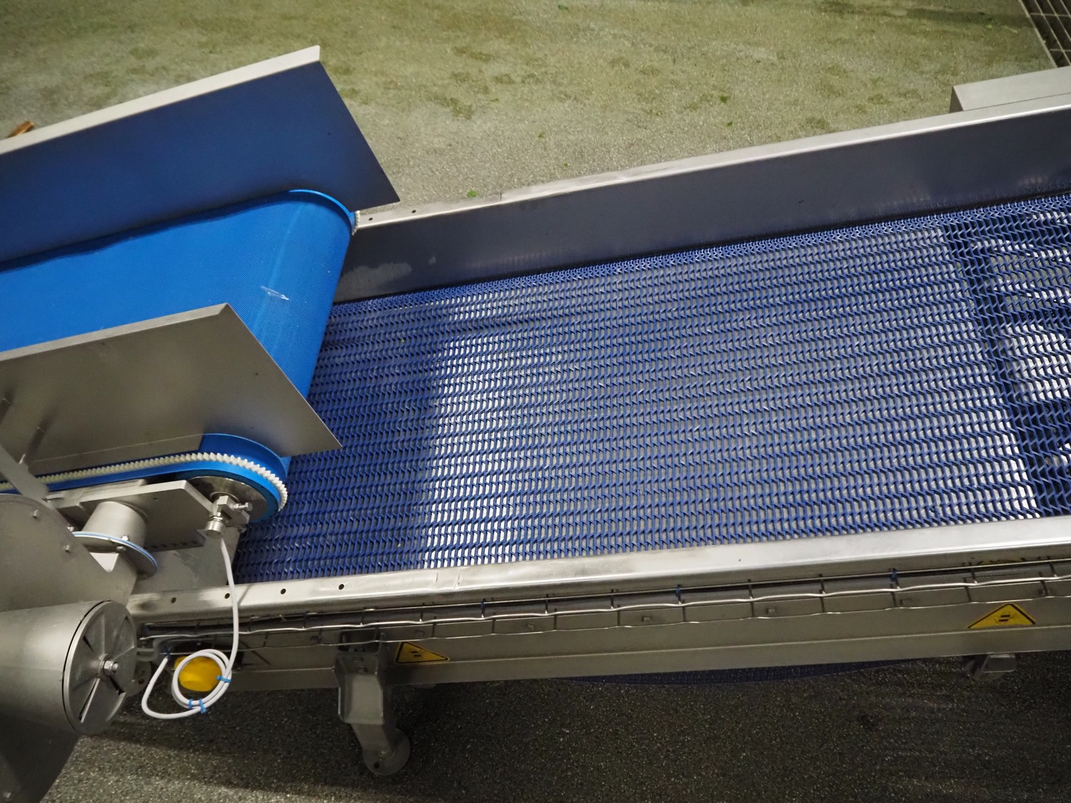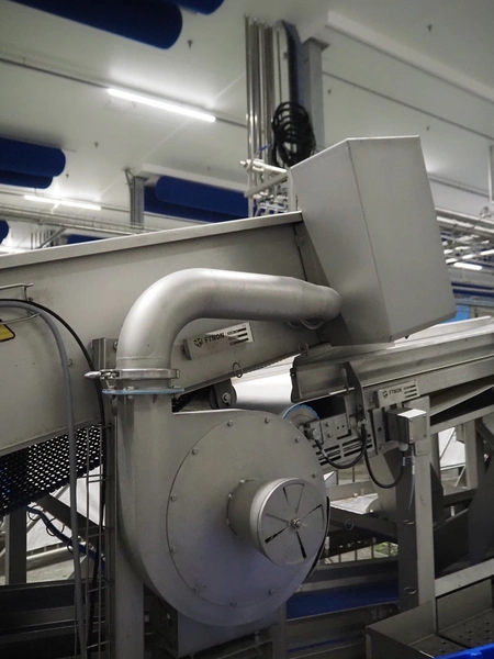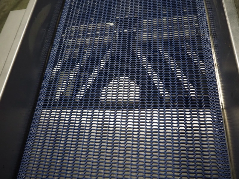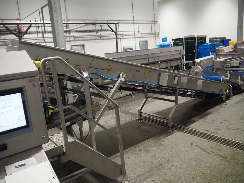 JBT FTNON B.V. vibrating elevating belt for removing small dirt particles, machine number: 16H0952000, year of construction: 2018, plastic mesh belt, belt width: 800 mm, elevating height: 1800 mm, total dimensions: 6500 mm x 1200 mm x 2150 mm.