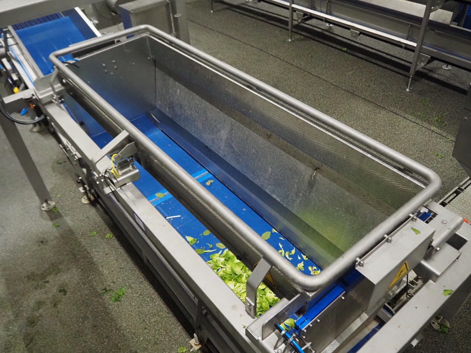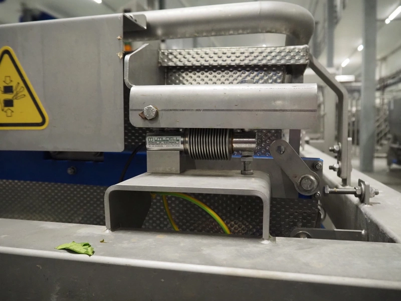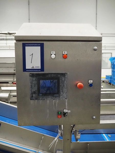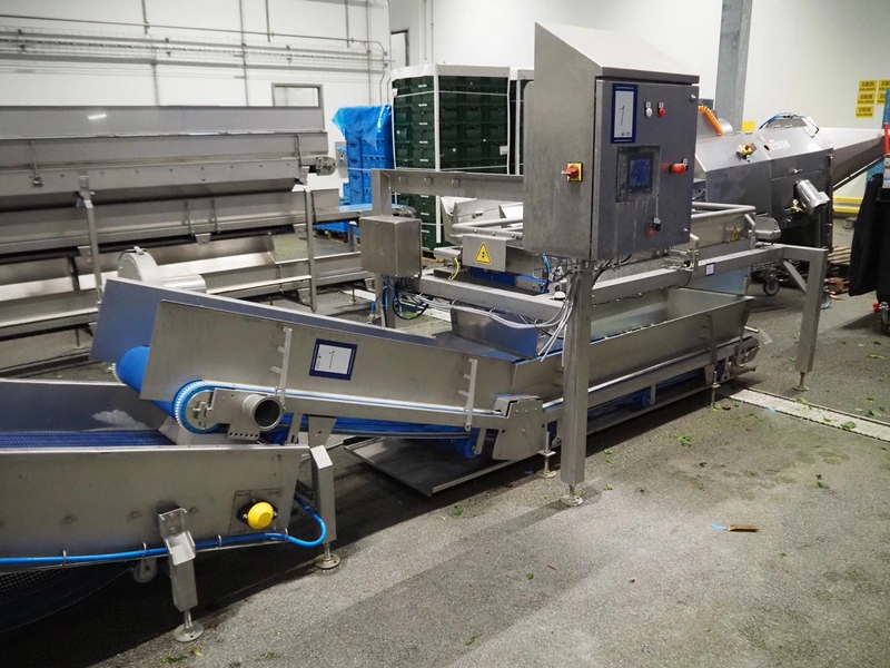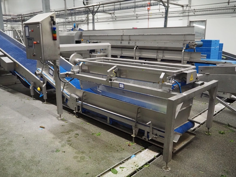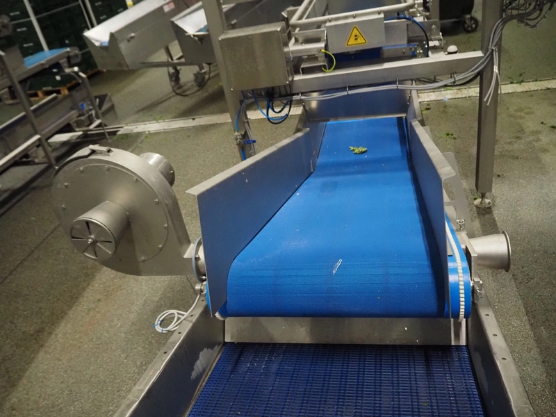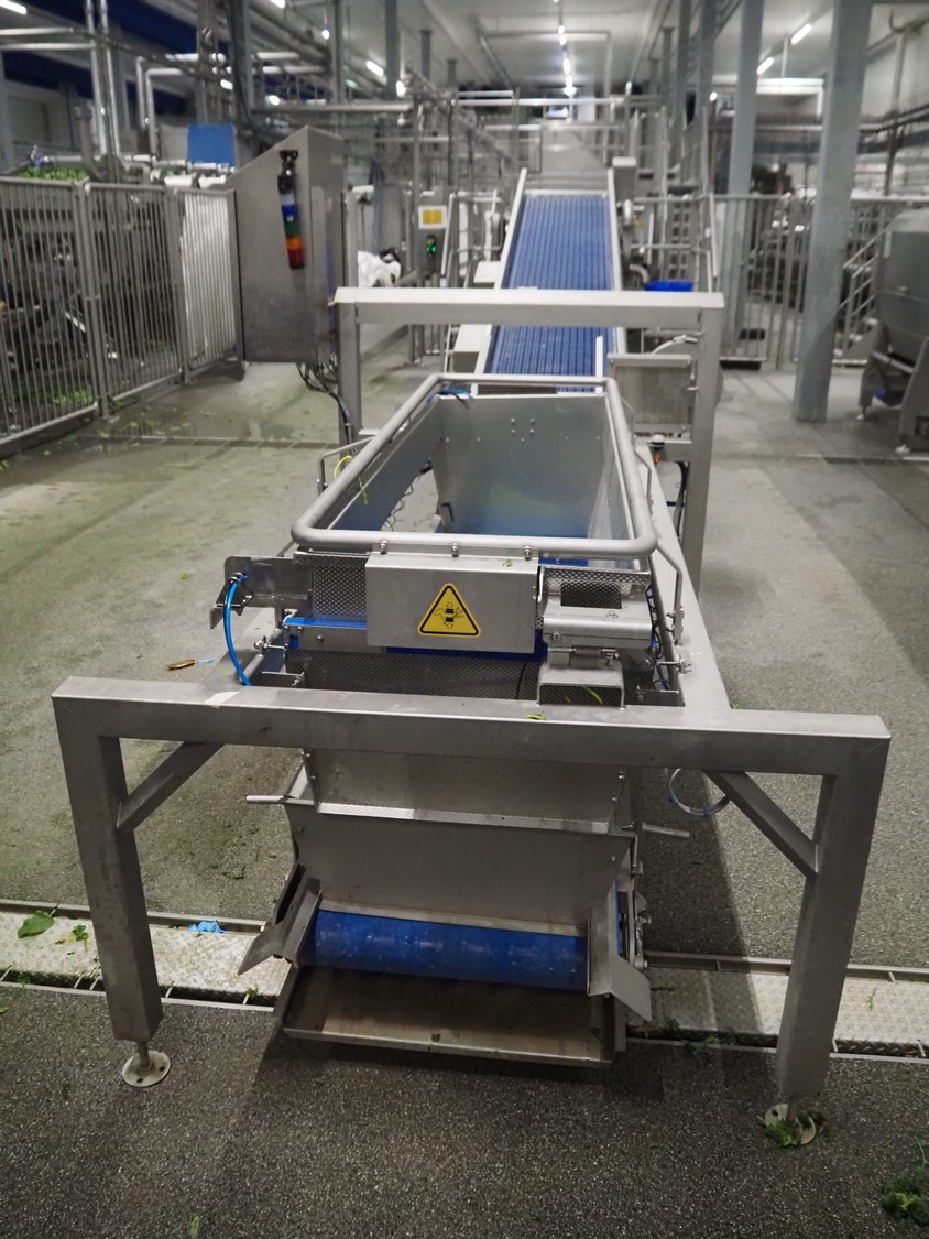 JBT FTNON B.V. weighing hopper with outfeed belt, dimensions hopper: 2500 mm x 1800 mm x 2000 mm, plastic mesh belt, belt width: 600 mm, elevating height: 800 mm, total dimensions outfeed belt: 4000 mm x 1300 mm x 950 mm. Incomplete, technical condition unknown.