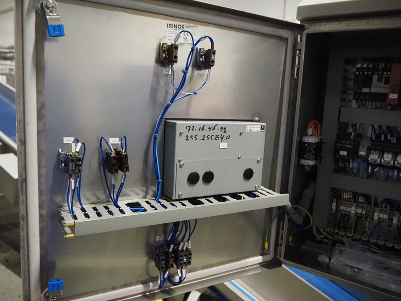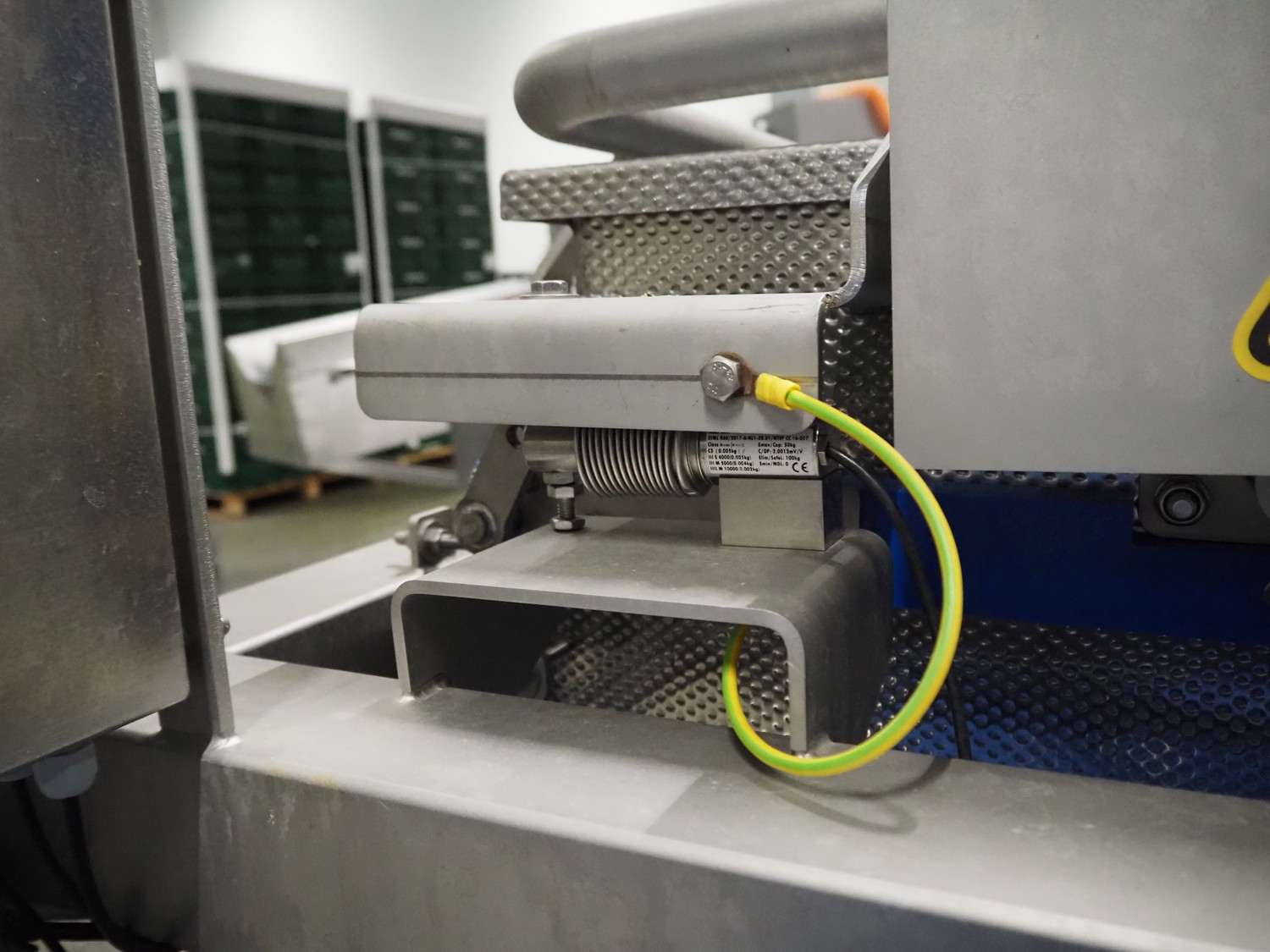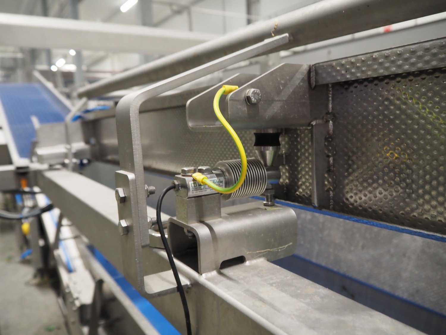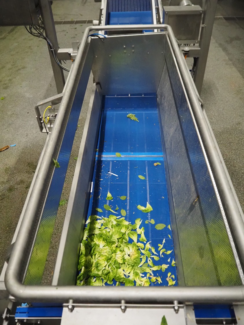 JBT FTNON B.V. weighing hopper with outfeed belt, dimensions hopper: 2500 mm x 1800 mm x 2000 mm, plastic mesh belt, belt width: 600 mm, elevating height: 800 mm, total dimensions outfeed belt: 4000 mm x 1300 mm x 950 mm. Incomplete, technical condition unknown.