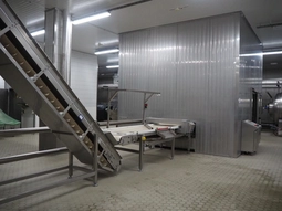 Sorting, weighing and packaging line for frozen fruit consisting of: 3 ATIS GmbH elevating belts with dividers BEST n.v. optical…