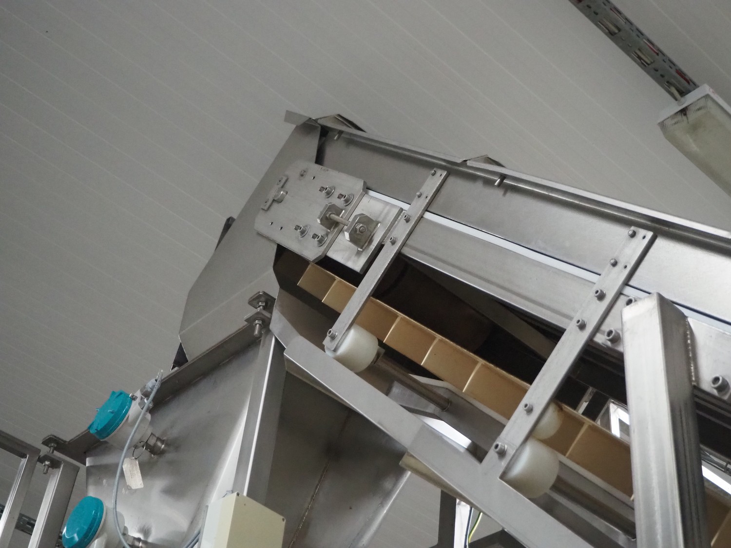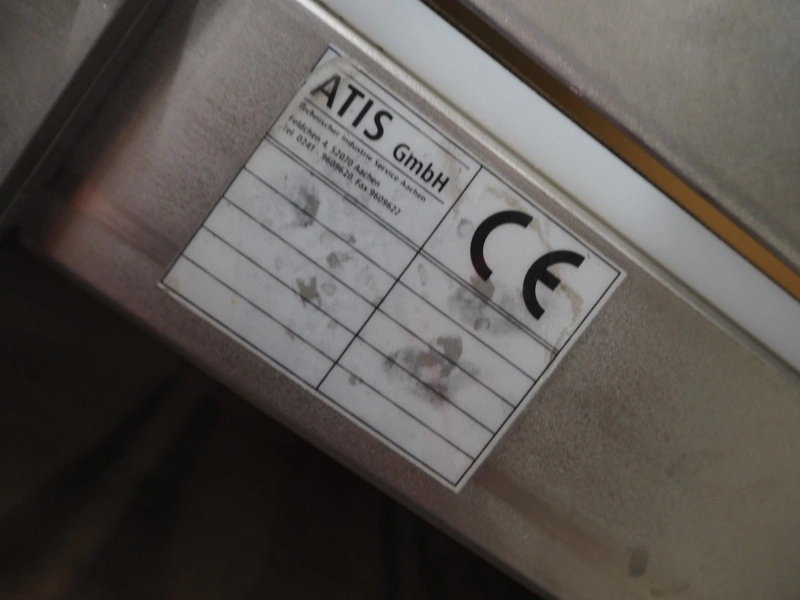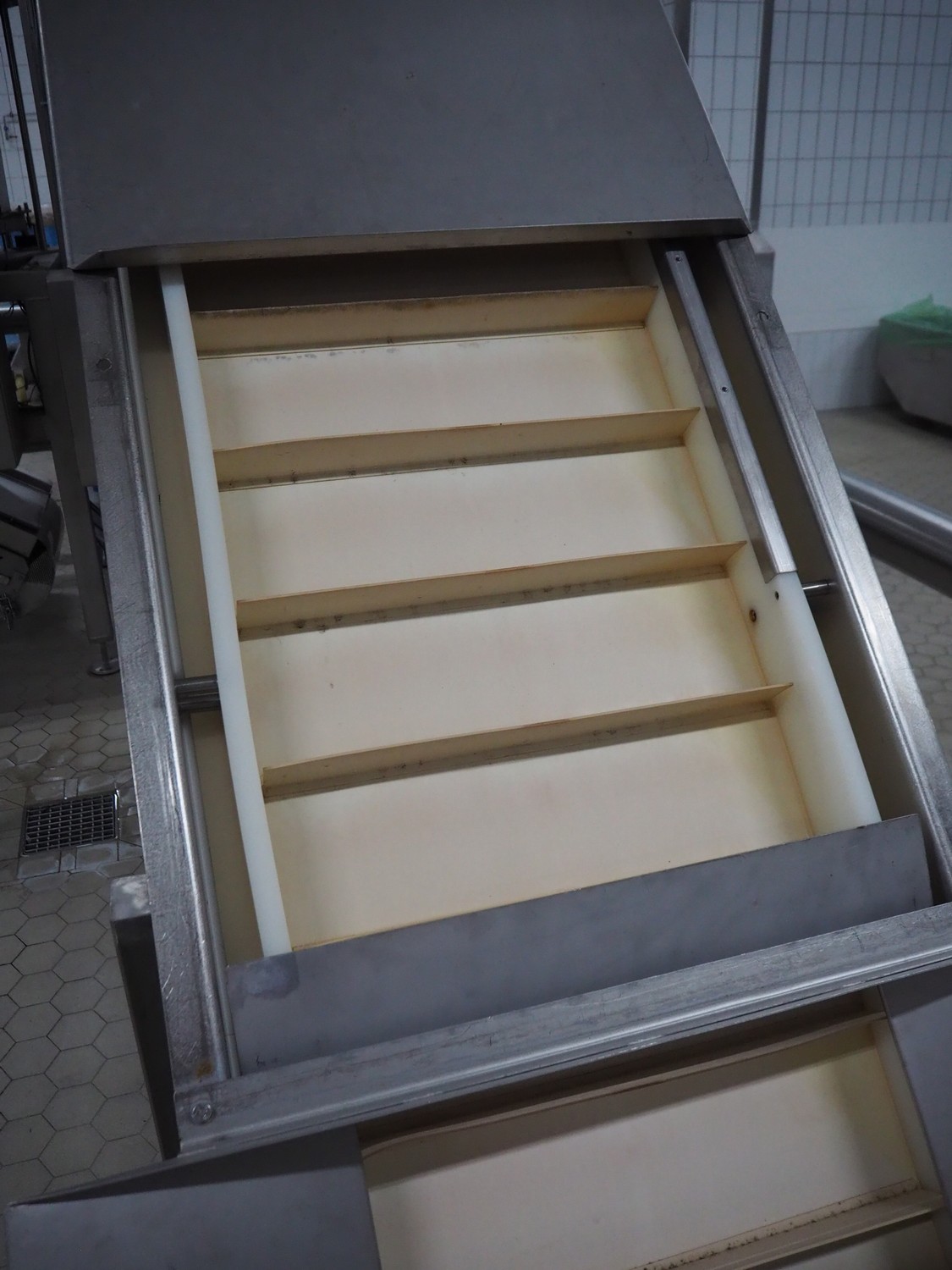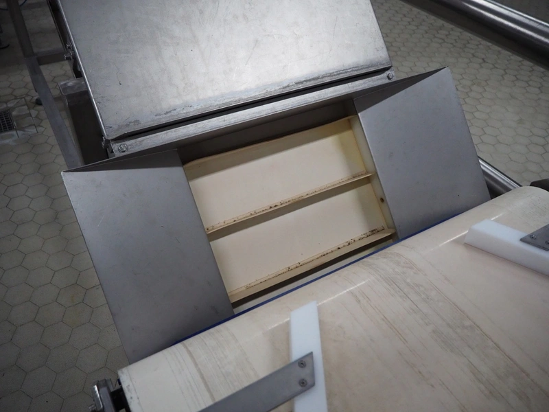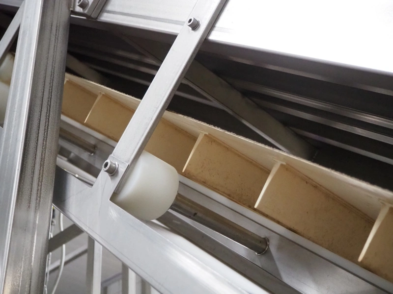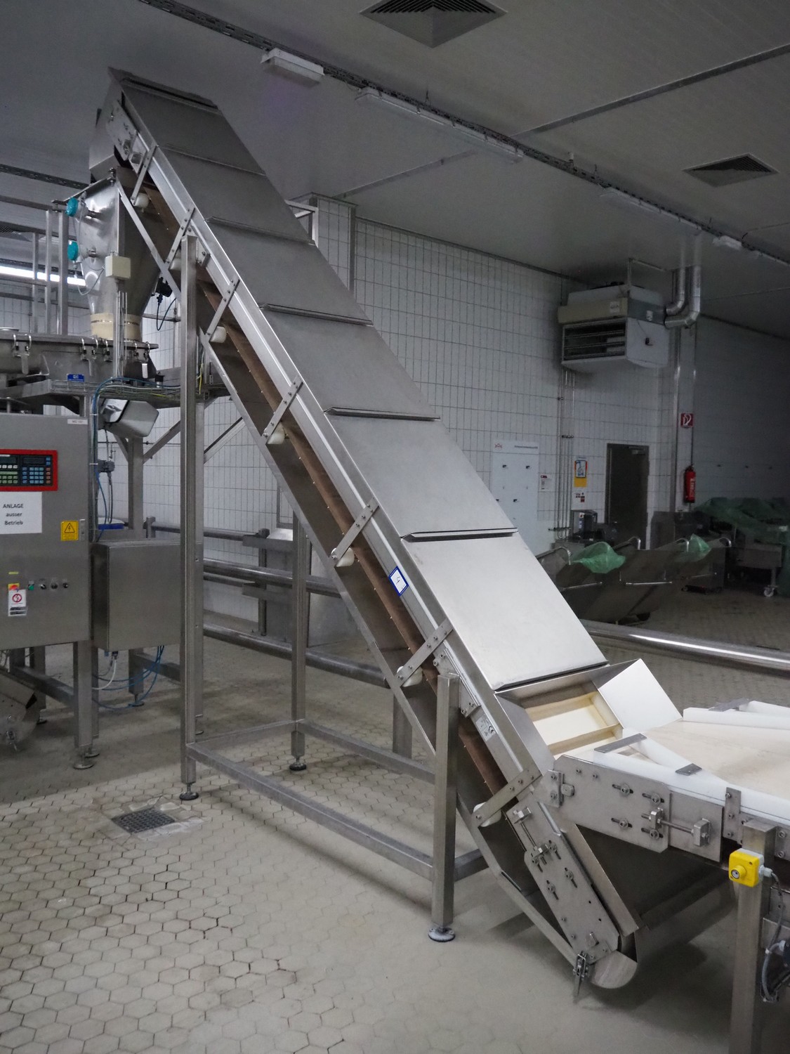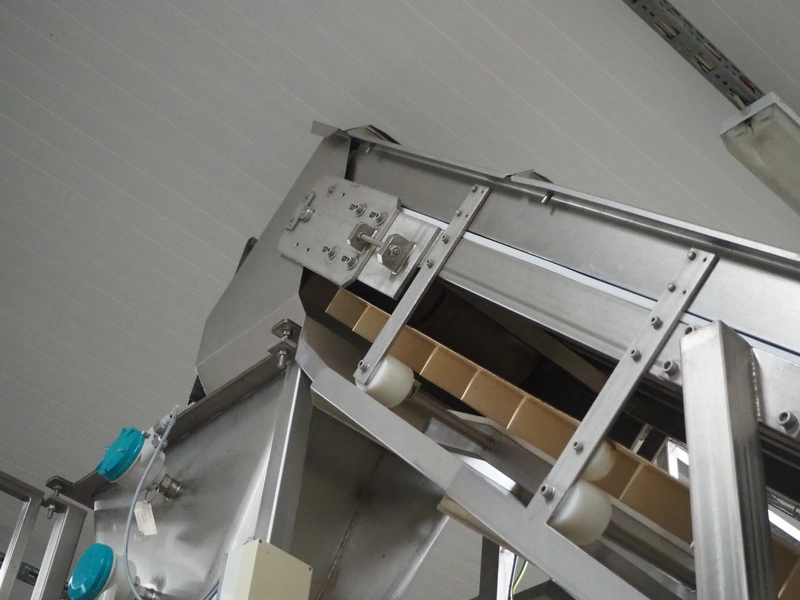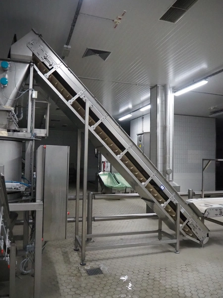ATIS GmbH elevating belt with dividers, divider height: 60 mm, distance between dividers: 155 mm, belt width: 495 mm, elevating height: 4200 mm, total dimensions: 3900 mm x 900 mm x 4200 mm.