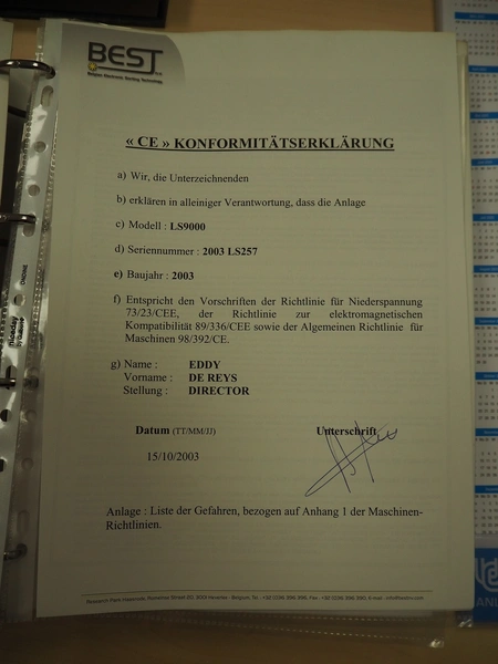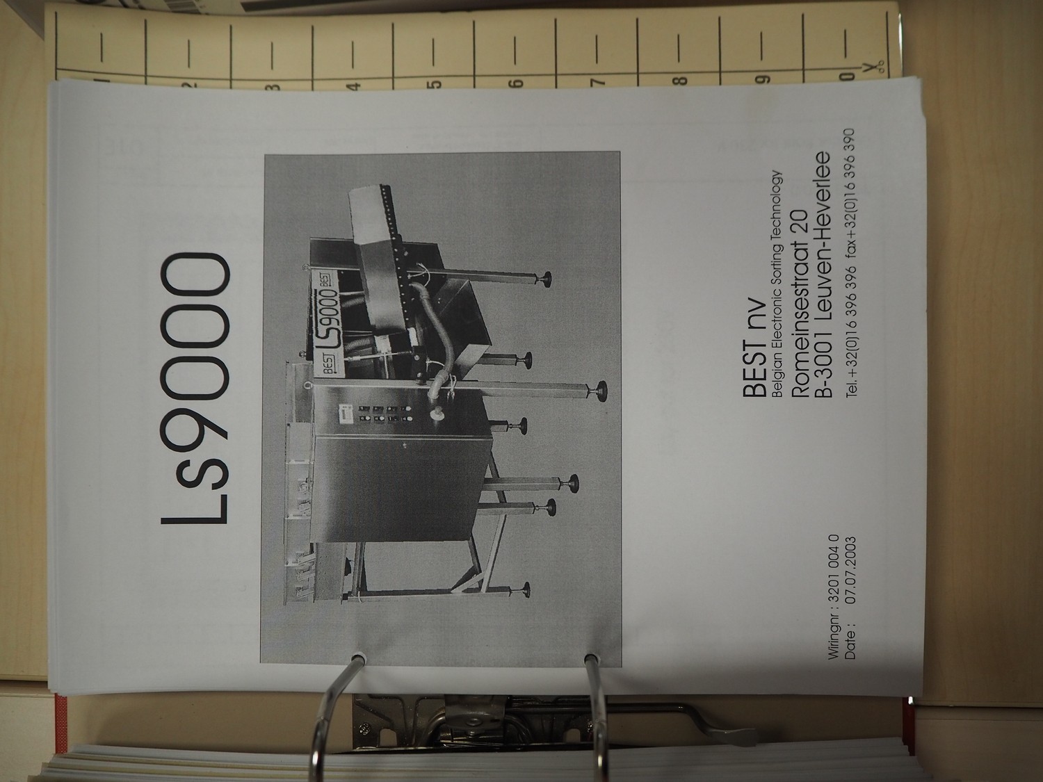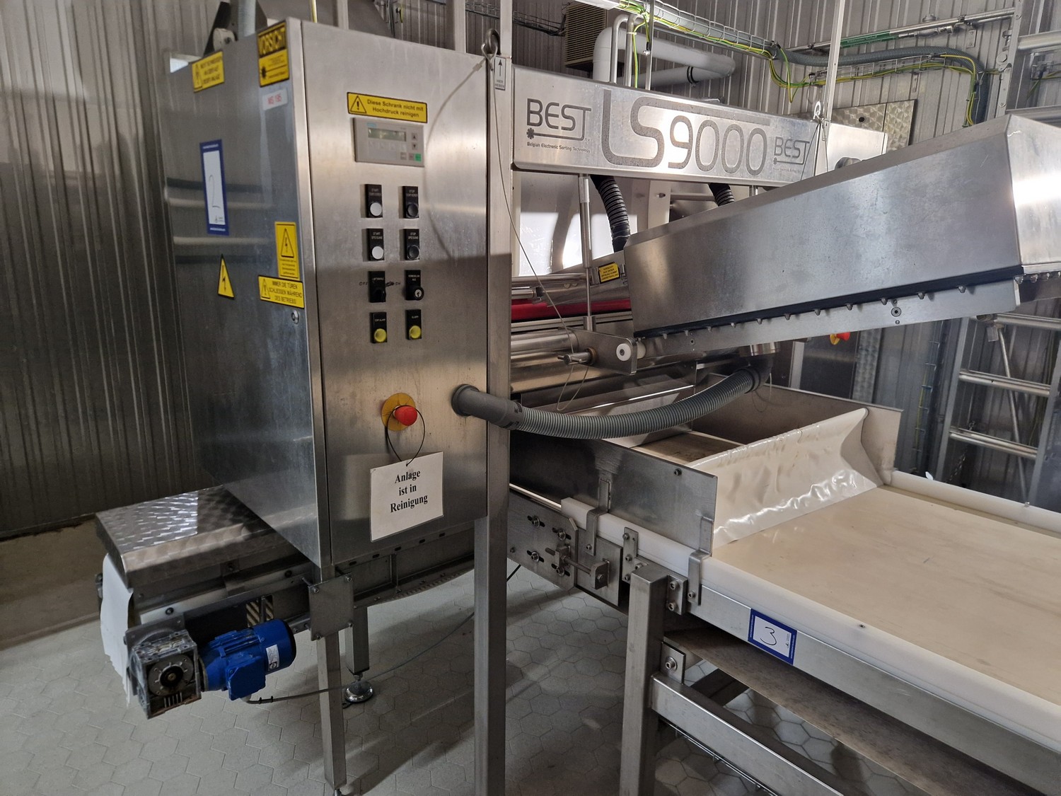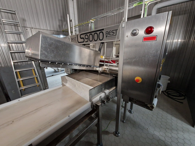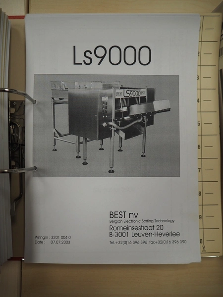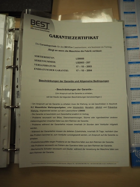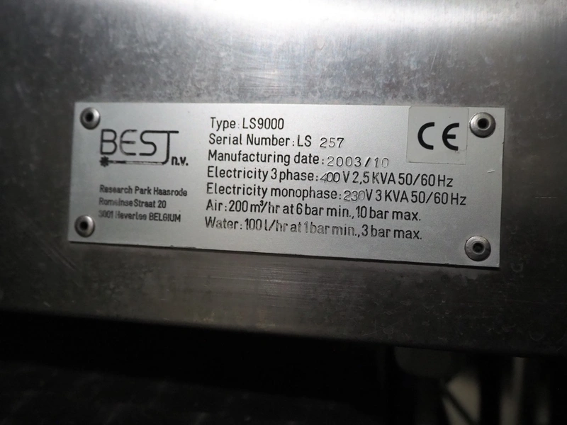 BEST n.v. optical sorting machine, type: LS9000, serial number: LS 257, year of construction: 2003/10, 400 V, 3 Ph, 50/60 Hz, 2.5 KVAm air: 200 m³/hr at 6 bar per minute, maximum 10 bar, water: 100 liter per hour at 1 bar per minute, maximum: 3 bar, with infeed vibrating gutter, gutter width: 610 mm, total dimensions: 3550 mm x 2600 mm x 2360 mm. Including M.T.A. SRL water chiller, type: TAE 020, serial number: 2200022525, year of construction: 2003, 400 V, 3 Ph, 50 Hz, refrigerant: R407C, 2.000 kg, dimensions: 540 mm x 1100 mm x 1150 mm.