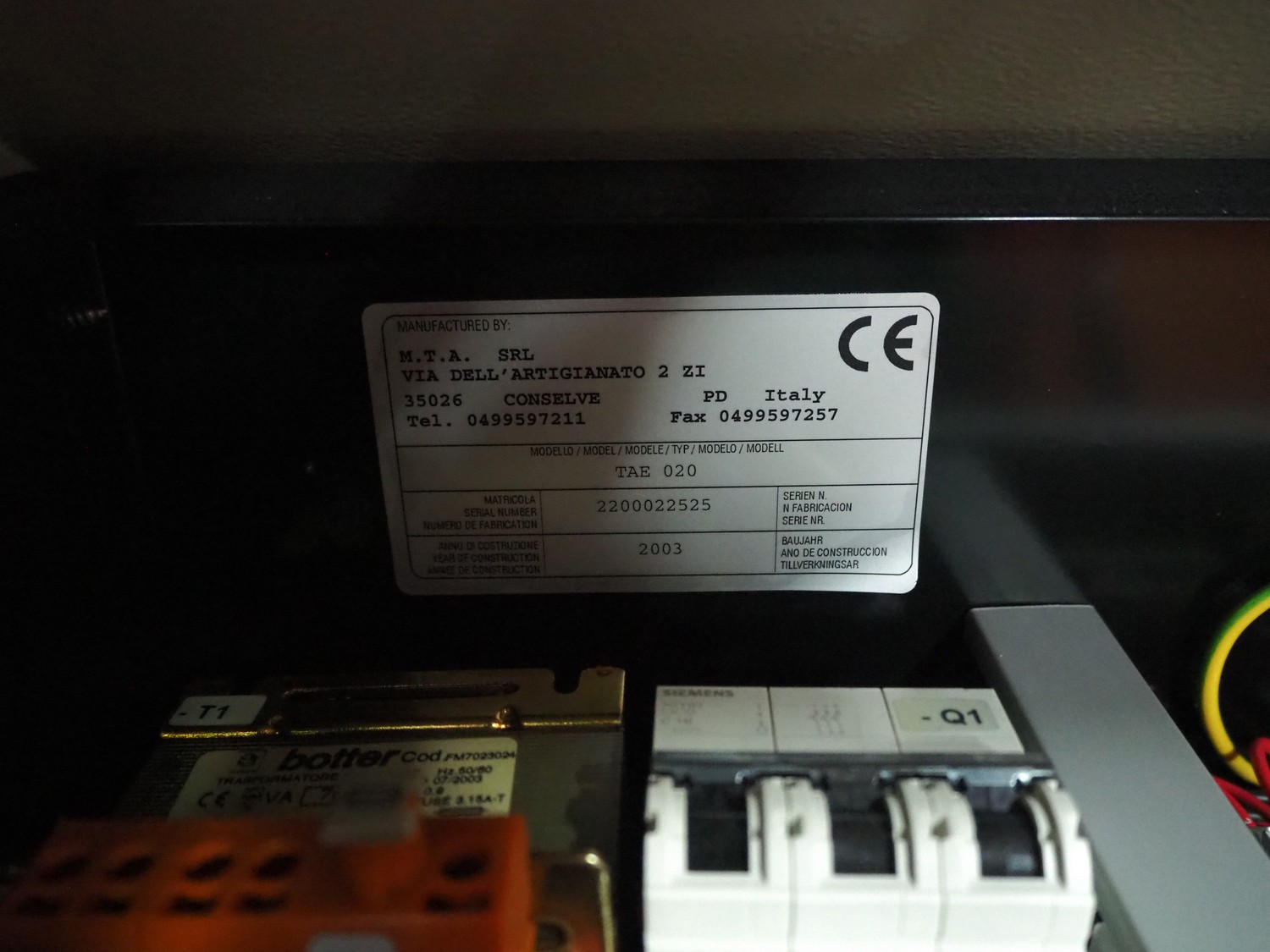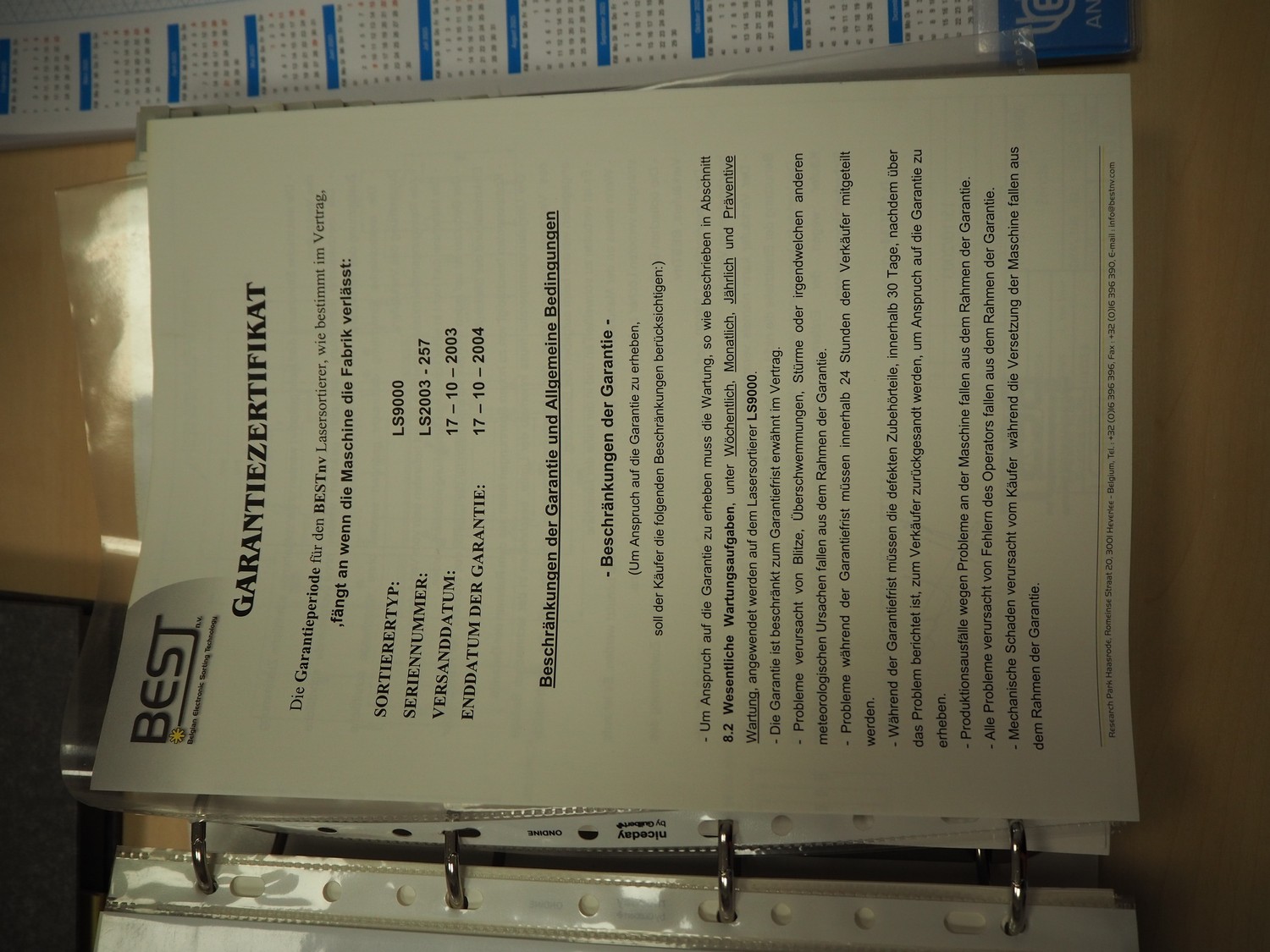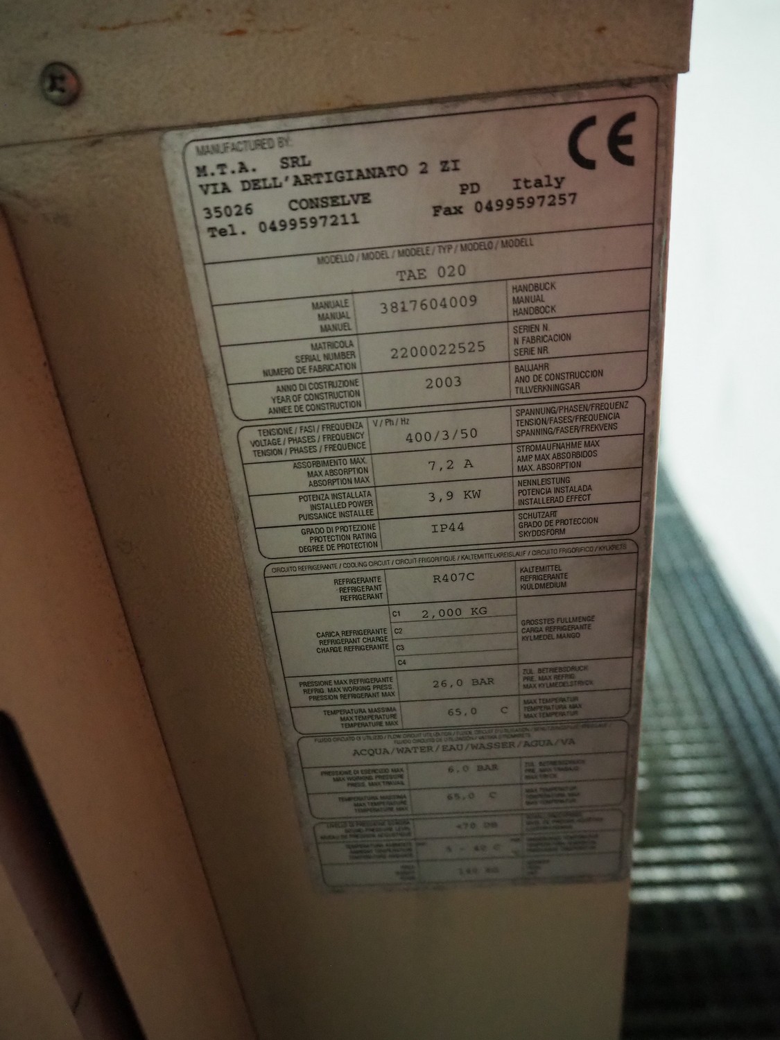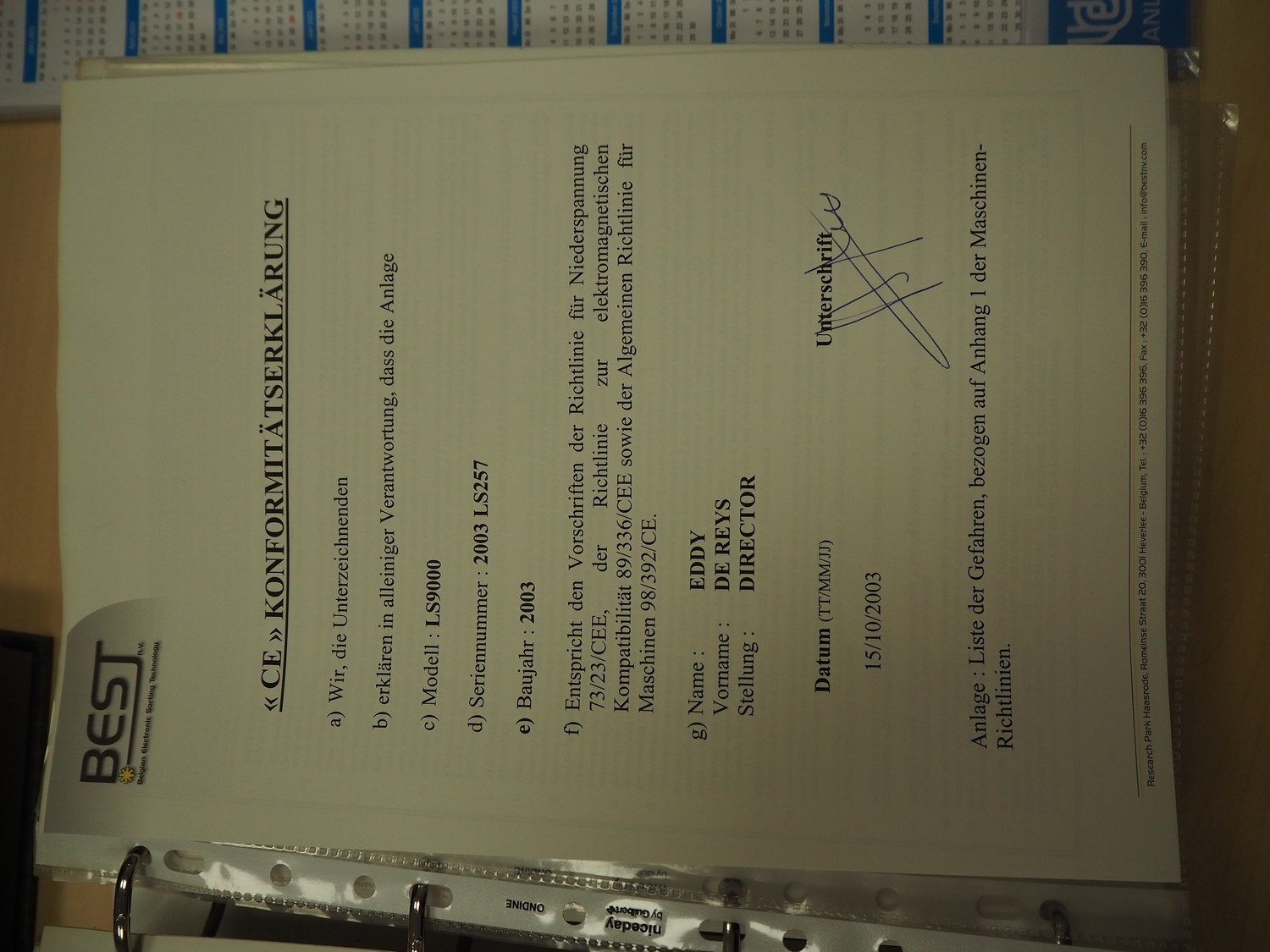 BEST n.v. optical sorting machine, type: LS9000, serial number: LS 257, year of construction: 2003/10, 400 V, 3 Ph, 50/60 Hz, 2.5 KVAm air: 200 m³/hr at 6 bar per minute, maximum 10 bar, water: 100 liter per hour at 1 bar per minute, maximum: 3 bar, with infeed vibrating gutter, gutter width: 610 mm, total dimensions: 3550 mm x 2600 mm x 2360 mm. Including M.T.A. SRL water chiller, type: TAE 020, serial number: 2200022525, year of construction: 2003, 400 V, 3 Ph, 50 Hz, refrigerant: R407C, 2.000 kg, dimensions: 540 mm x 1100 mm x 1150 mm.