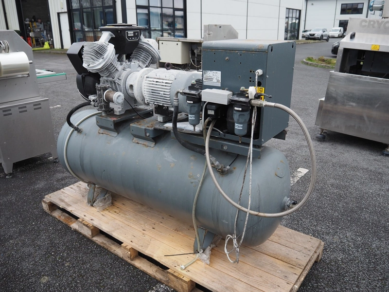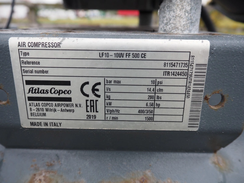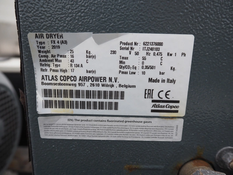 Atlas Copco air compressor, type: LF10-10UV FF 500 CE, serial number: ITR1424450, year of construction: 2019, 400 V, 3 Ph, 50 Hz, 6.58 kW, machine weight: 280 kg, maximum bar: 10 bar, Air dryer type: FX 4 (A3), serial number: ITJ248183, year of construction: 2019, 230 V, 1 Ph, 50 Hz, 0.475 kW, weight: 25 kg, refrigerant type: R 134 A, maximum: 17 bar, total dimensions: 1800 mm x 660 mm x 1300 mm.