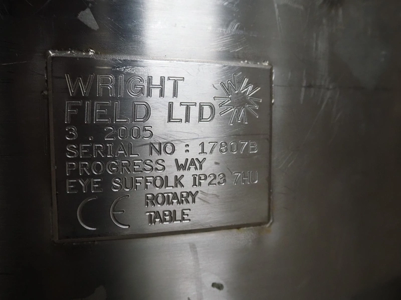 Wright Field LTD turning table, serial number: 17807B, year of construction: 3.2005, 23 Ip, s/s frame, diameter table: 990 mm, total dimensions: 1020 mm x 1020 mm x 870 mm.