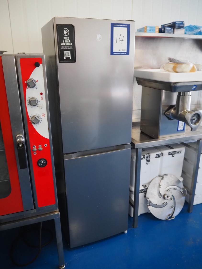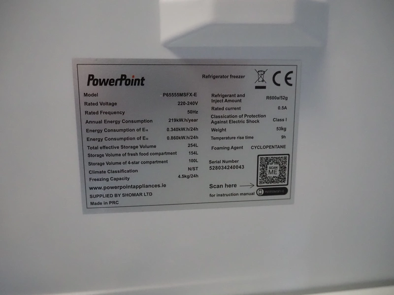 PowerPoint refrigerator / freezer combi, model: P65555MSFX-E, serial number: 528034240043, 220-240 V, 50 Hz, refrigerant: R600a / 52 gram, volume fresh food compartment: 154 liter, volume 4-star compartment: 100 liter, dimensions: 550 mm x 550 mm x 1750 mm.