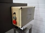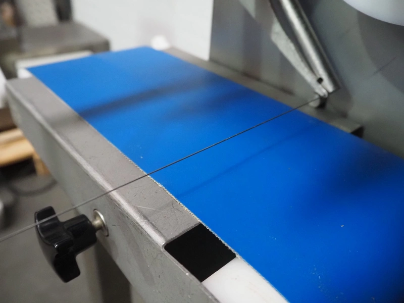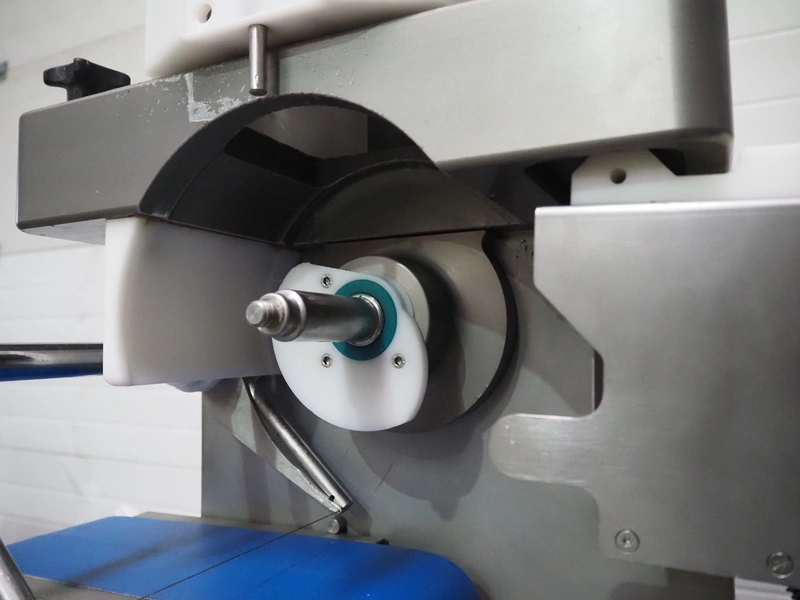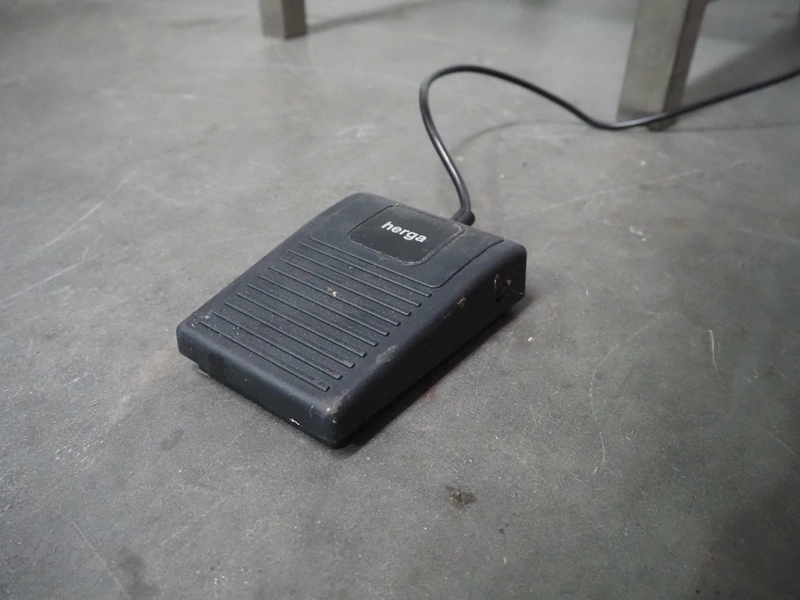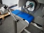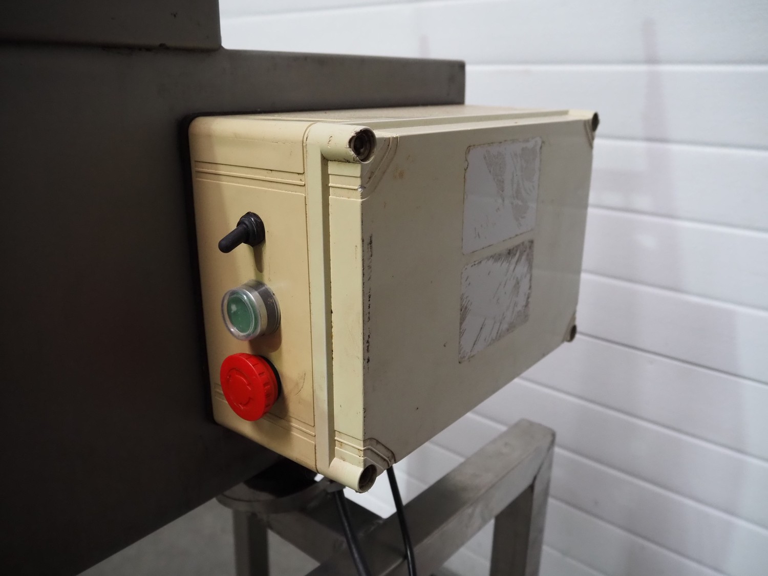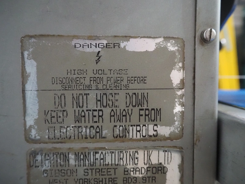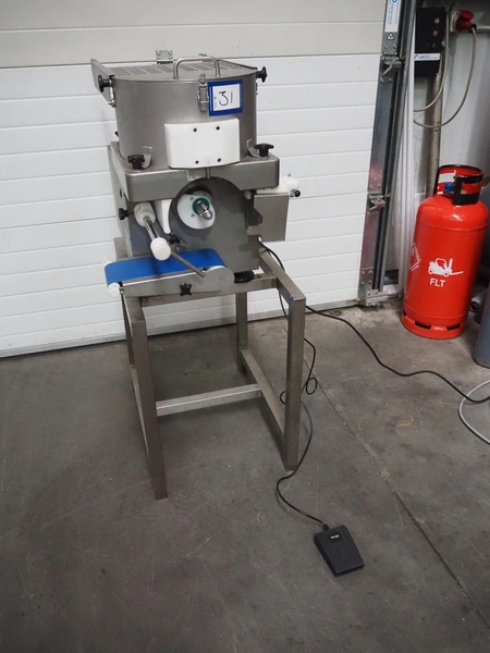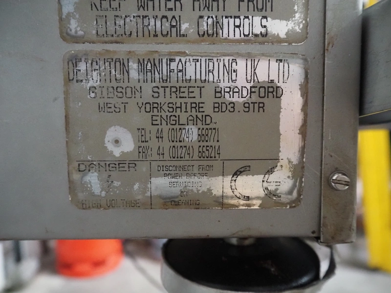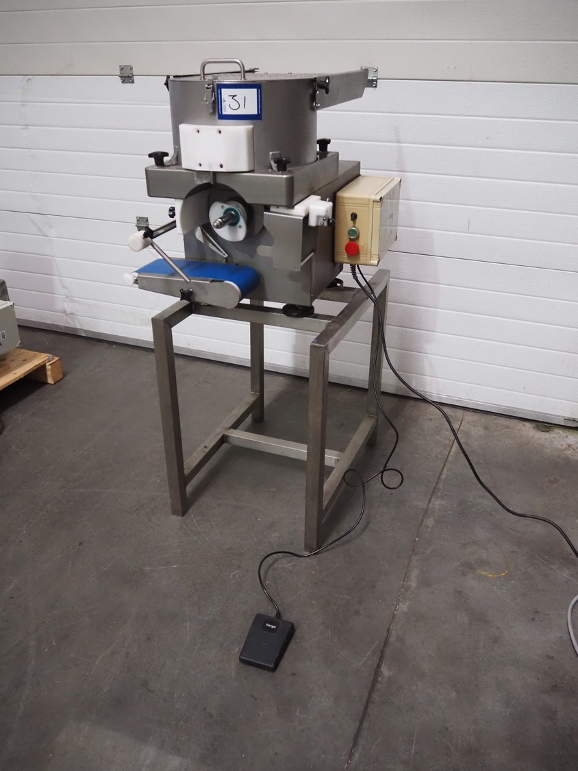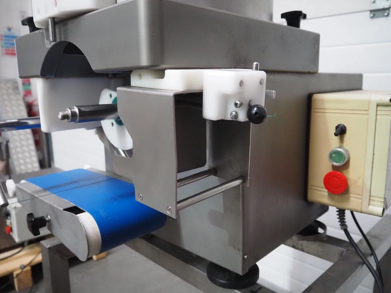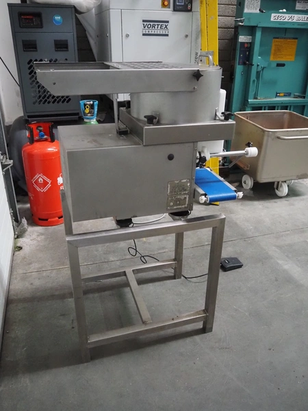 Deighton Manufacturing UK LTD mobile hamburger forming machine, plastic outfeed belt, belt width: 120 mm, total dimensions: 850 mm x 620 mm x 1320 mm. Incomplete, missing form roll.
