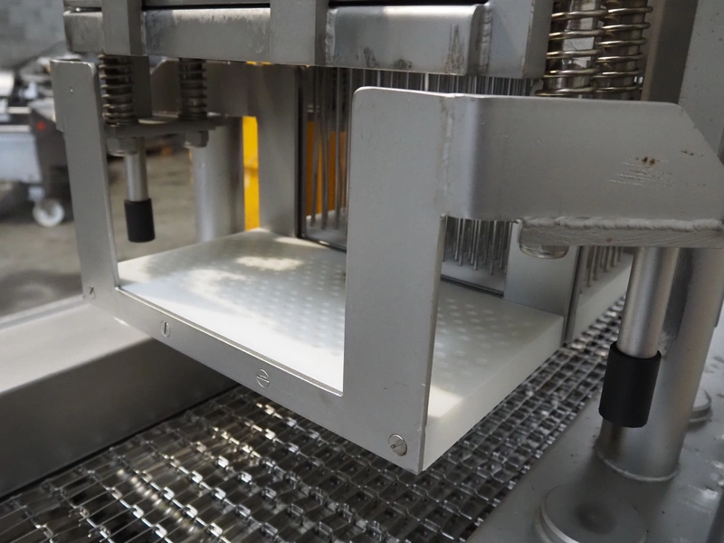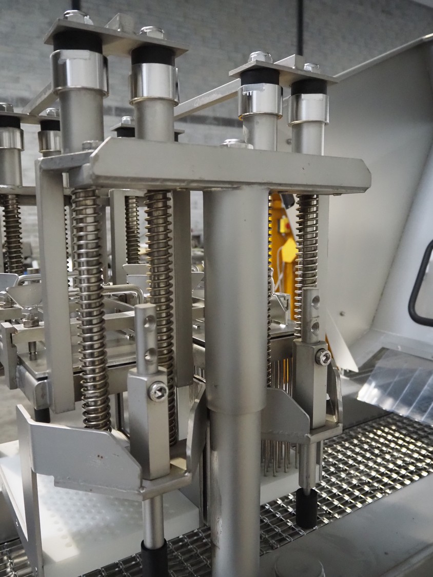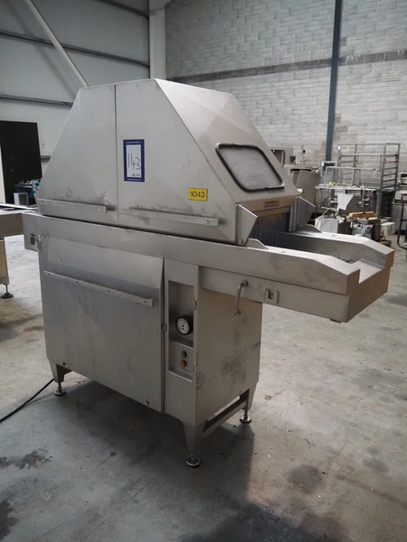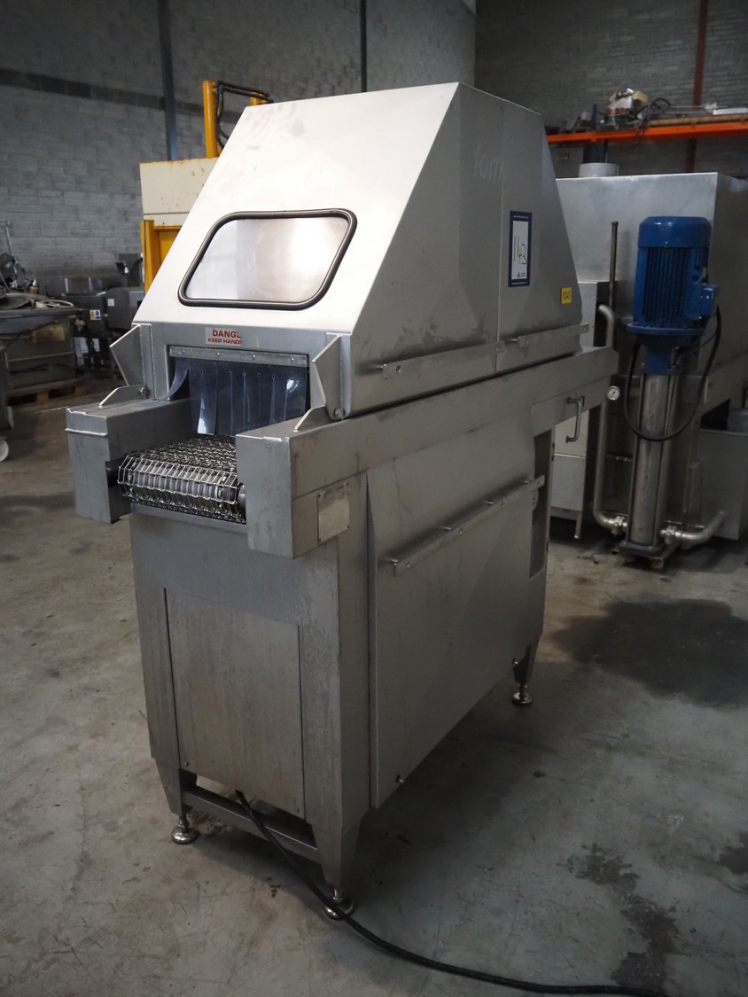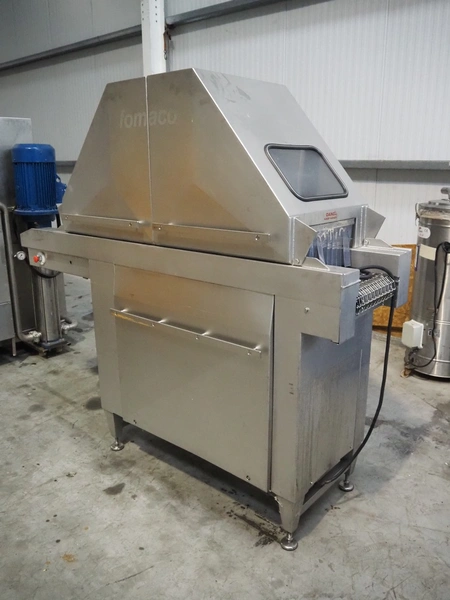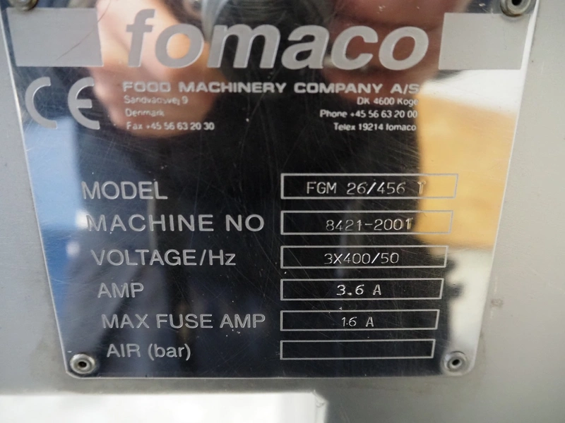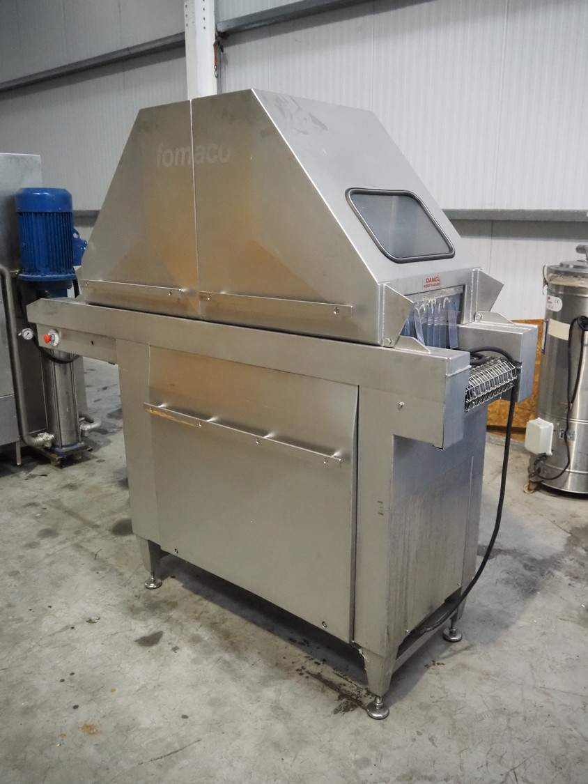 Fomaco injector, model: FGM 26/456 T, machine number: 8421-2001, 400 V, 3 Ph, 50 Hz, 3.6/1.6 A, 228 needles, s/s belt, belt width: 335 mm, clearance: 340 mm x 150 mm, total dimensions: 2150 mm x 700 mm x 1900 mm.