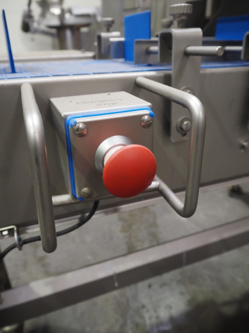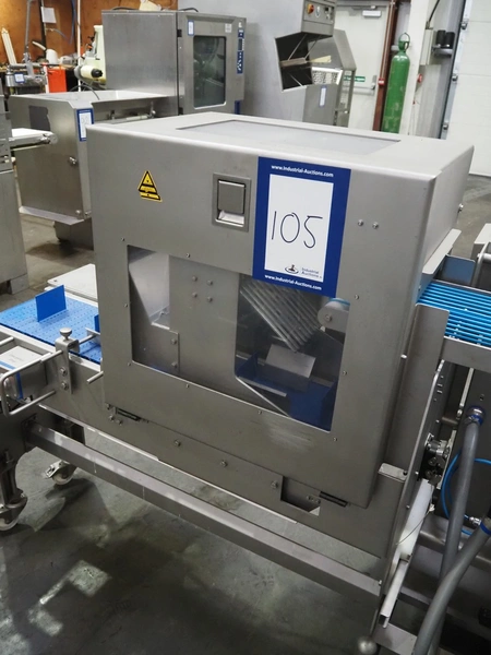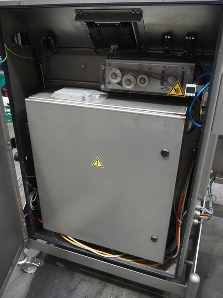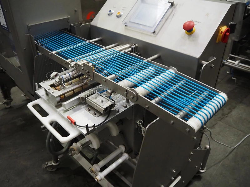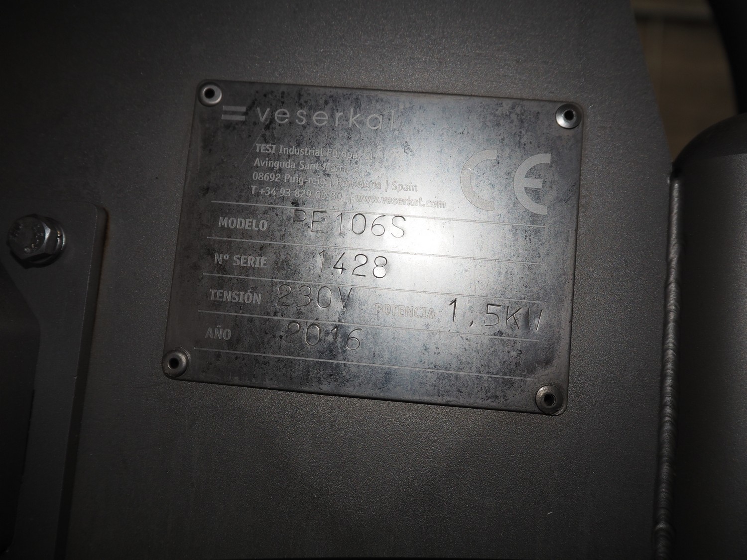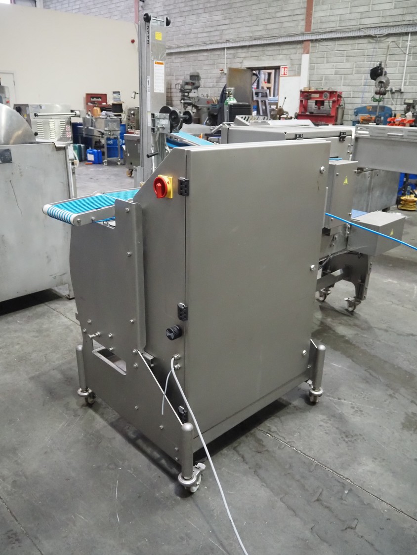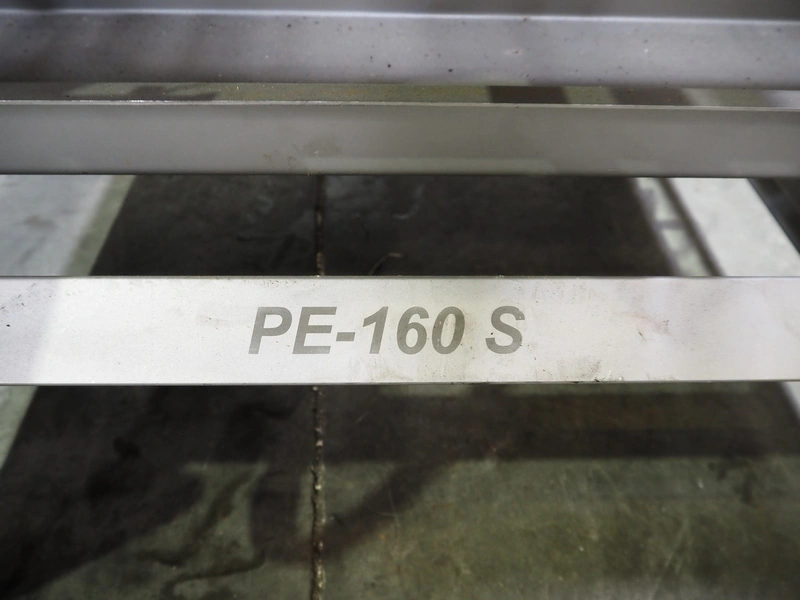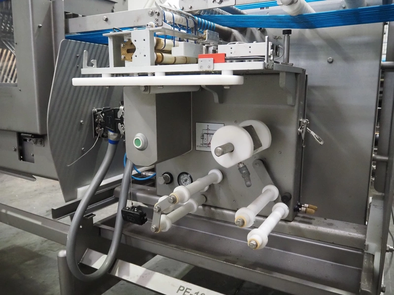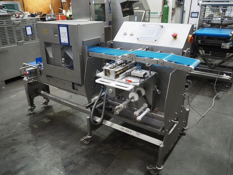 Veserkal bottom labeller, model: PE106S, serial number: 1428, year of construction: 2016, 230 V, 1.5 kW, plastic wire belt, belt width: 170 mm, plastic belt with dividers, belt width: 225 mm, dividers height: 70 mm, distance between dividers: 190 mm, total dimensions: 2240 mm x 860 mm x 1280 mm.