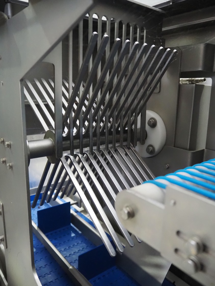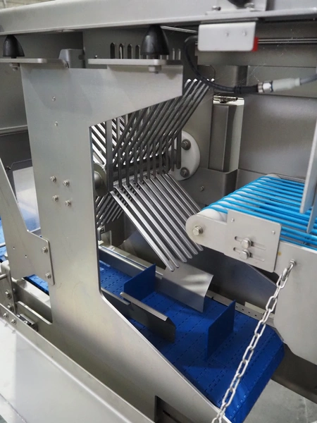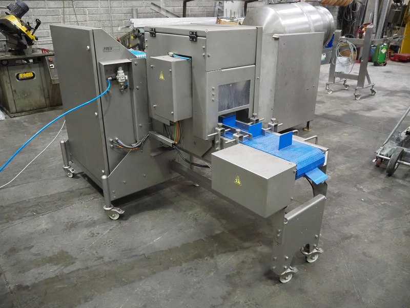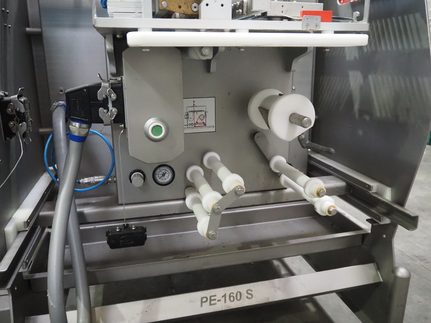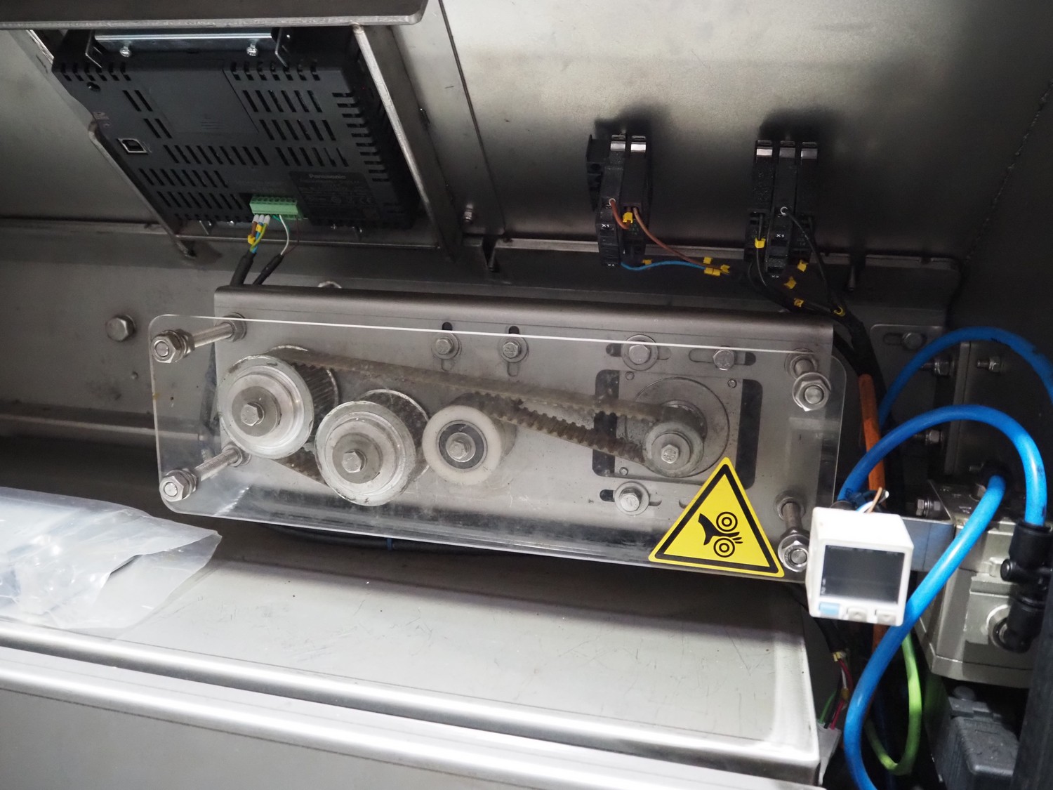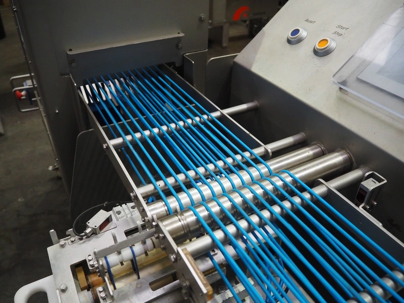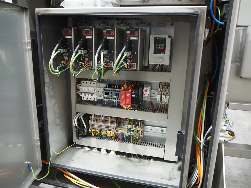 Veserkal bottom labeller, model: PE106S, serial number: 1428, year of construction: 2016, 230 V, 1.5 kW, plastic wire belt, belt width: 170 mm, plastic belt with dividers, belt width: 225 mm, dividers height: 70 mm, distance between dividers: 190 mm, total dimensions: 2240 mm x 860 mm x 1280 mm.