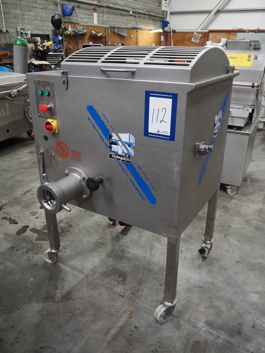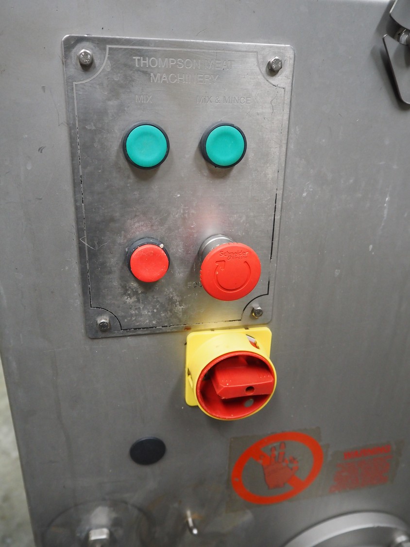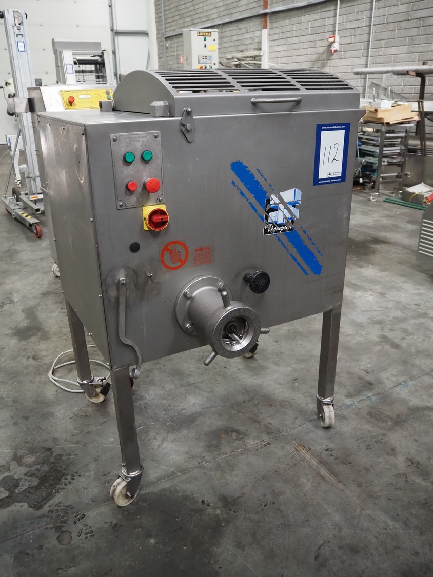 Thompson Meat Machinery grinder, type: 900-MM, serial number: 900-455, year of construction: 6/03, 240 V, 50 Hz, 20.2 A, 3.7 kW, 1430 rpm, diameter plate: 100 mm, total dimensions: 1000 mm x 900 mm x 1400 mm. Without plates and knives.