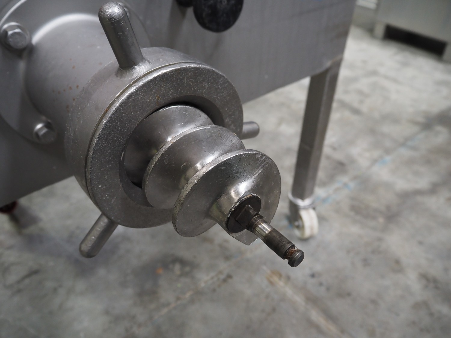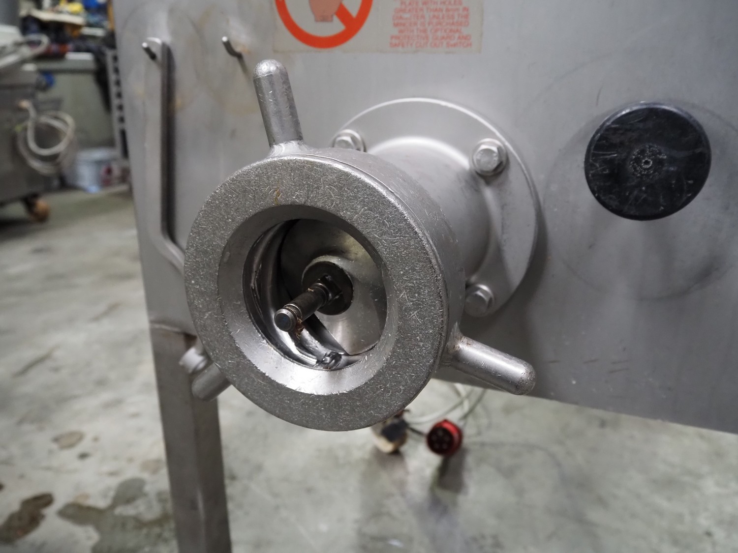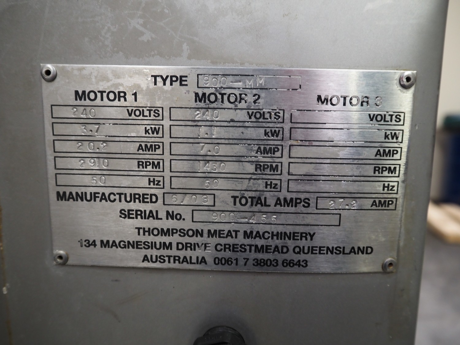 Thompson Meat Machinery grinder, type: 900-MM, serial number: 900-455, year of construction: 6/03, 240 V, 50 Hz, 20.2 A, 3.7 kW, 1430 rpm, diameter plate: 100 mm, total dimensions: 1000 mm x 900 mm x 1400 mm. Without plates and knives.