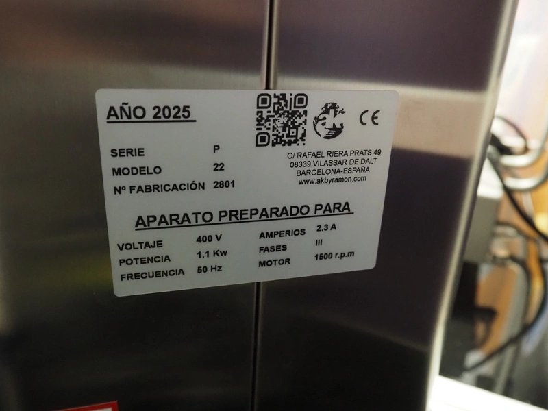 Ramon grinder, serie: P, model: 22, number: 2801, year of construction: 2025, 400 V, 3 Ph, 50 Hz, 2.3 A, 1.1 kW, 1500 rpm, diameter plate: 83 mm, total dimensions: 470 mm x 310 mm x 480 mm.