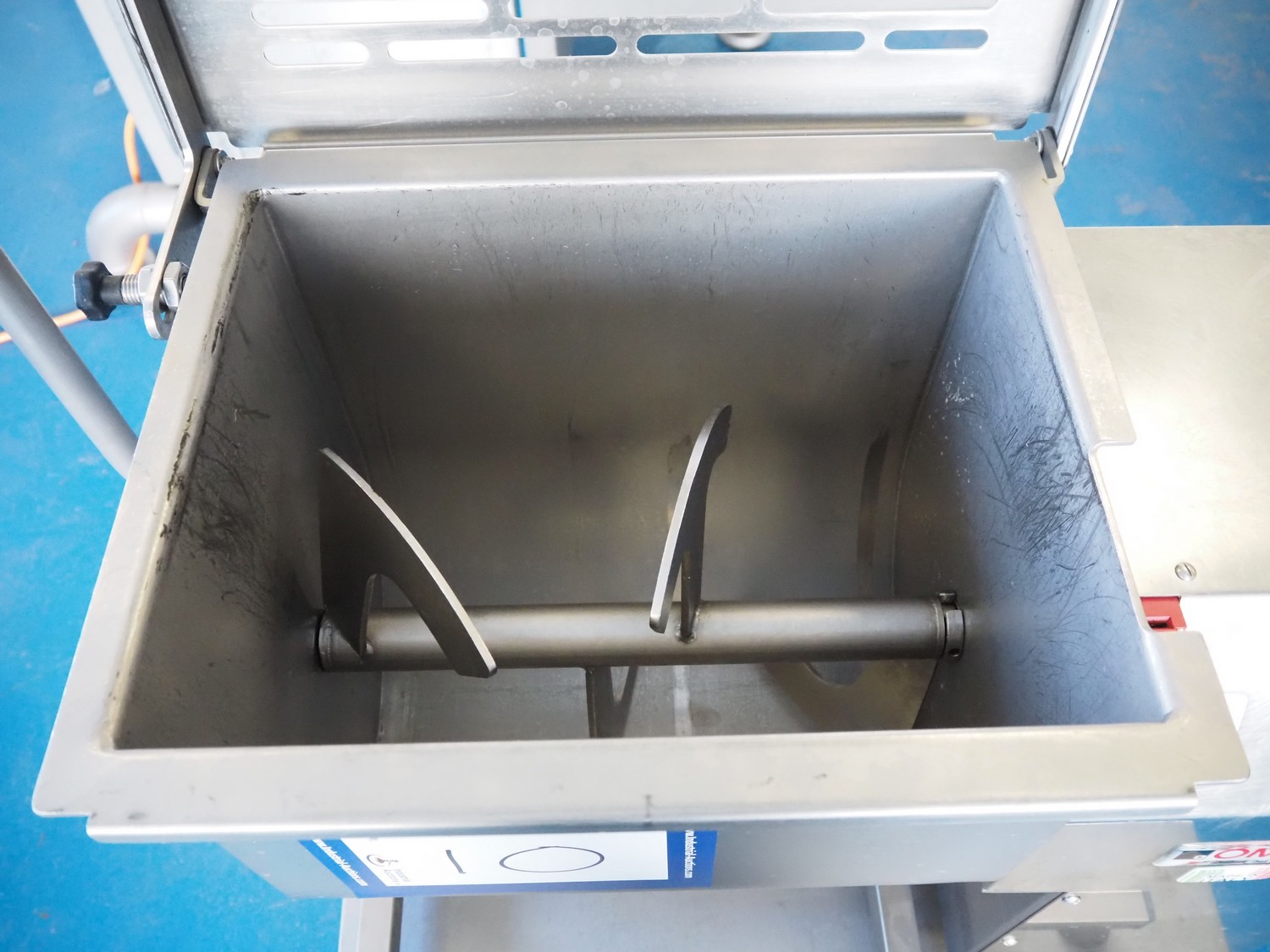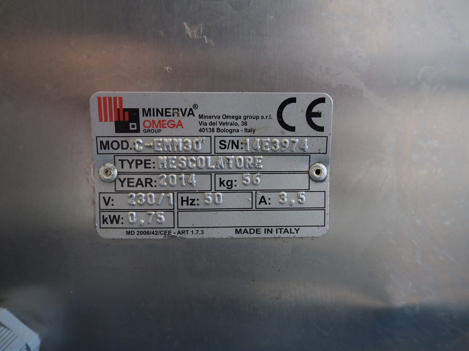 Minerva Omega group s.r.l. paddle mixer, model: C-EMM30, type: MESCOLATORE, serial number: 14E3974, year of construction: 2014, 230 V, 1 Ph, 50 Hz, 3.5 A, 0.75 kW, volume: 30 liter, dimensions: 800 mm x 450 mm x 770 mm.