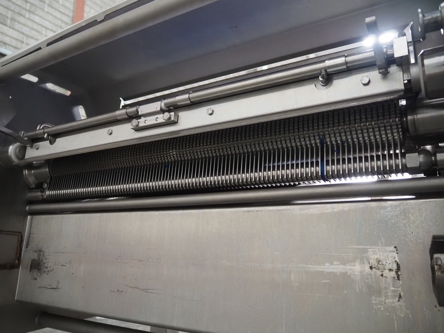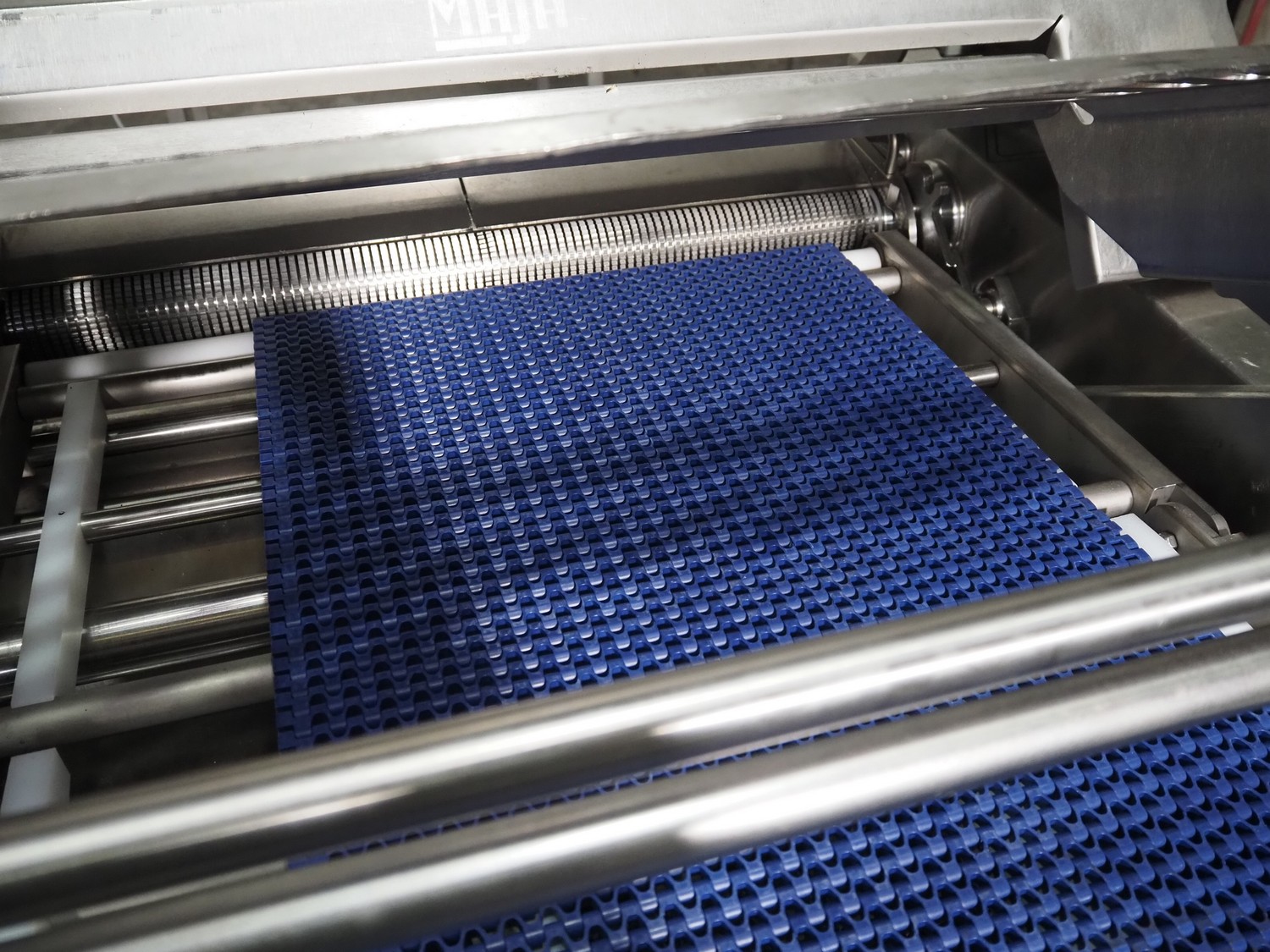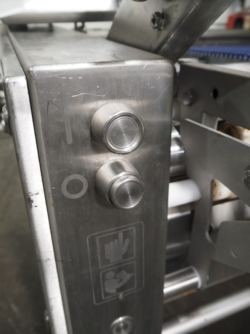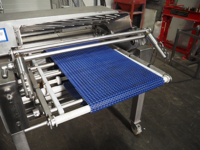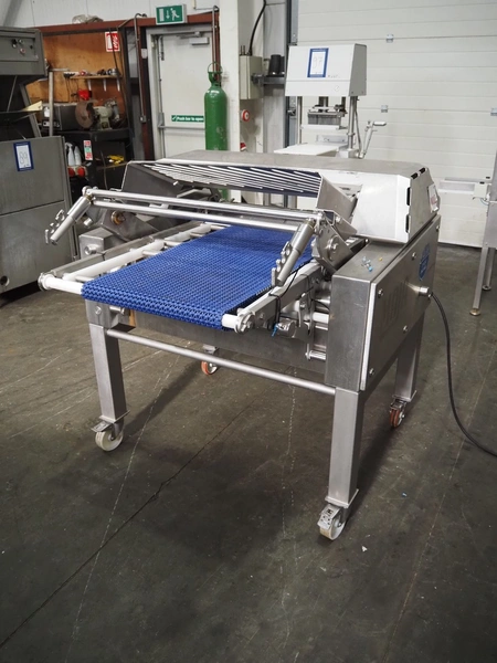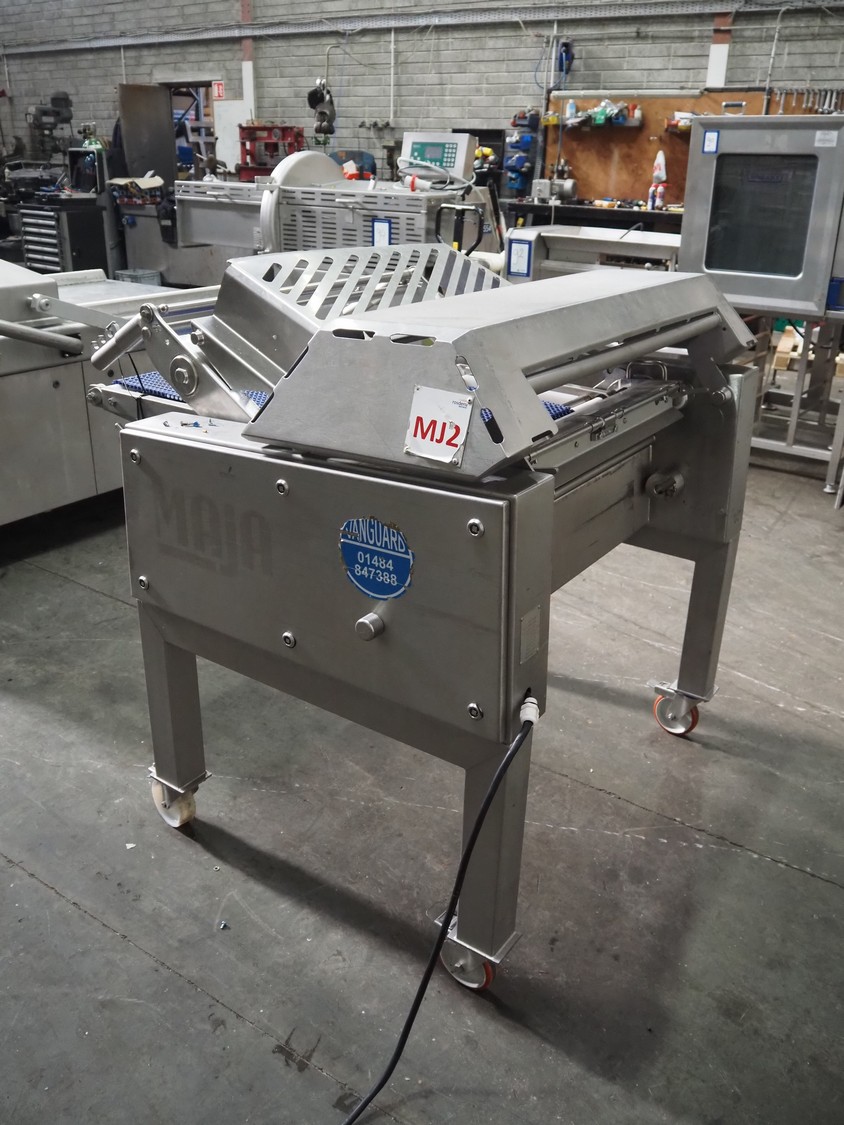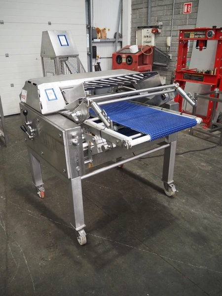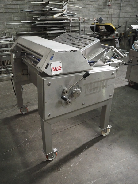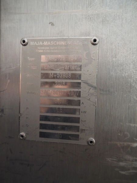 Maja-Maschinenfabrik mobile skinning and derinding machine, type: BXAplus 754, serial number: M-53908, year of construction: 2018, 400 V, 3 Ph, 50 Hz, 3.57 A, 1.5 kW, weight: 415 kg, plastic mesh belt, belt width: 500 mm, working width: 750 mm, total dimensions: 1200 mm x 1250 mm x 1250 mm. Incomplete, missing derinding roll and outfeed belt.
