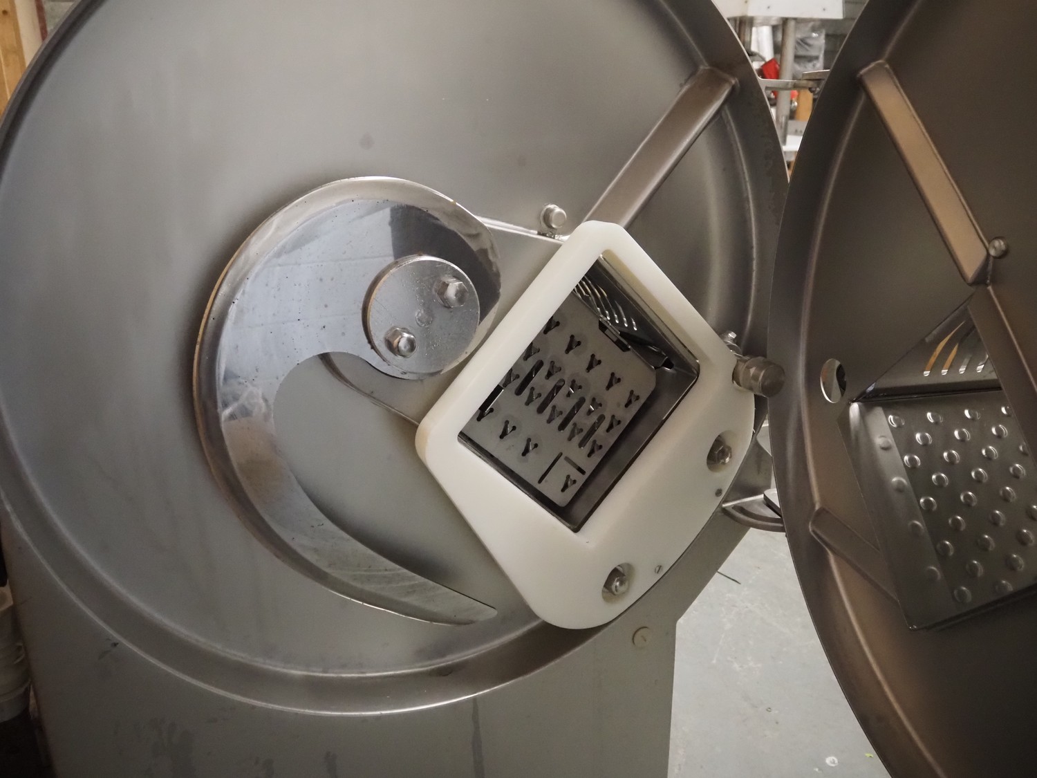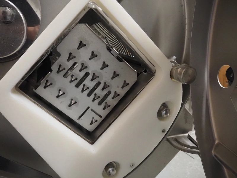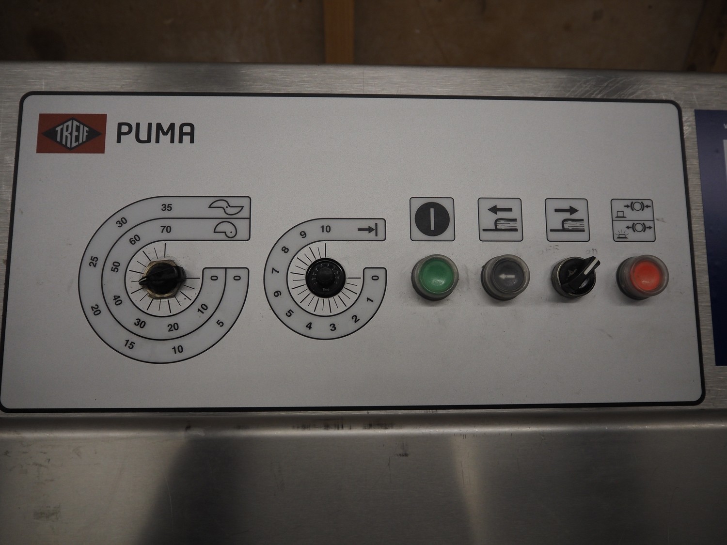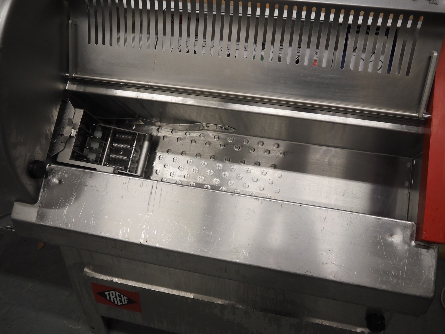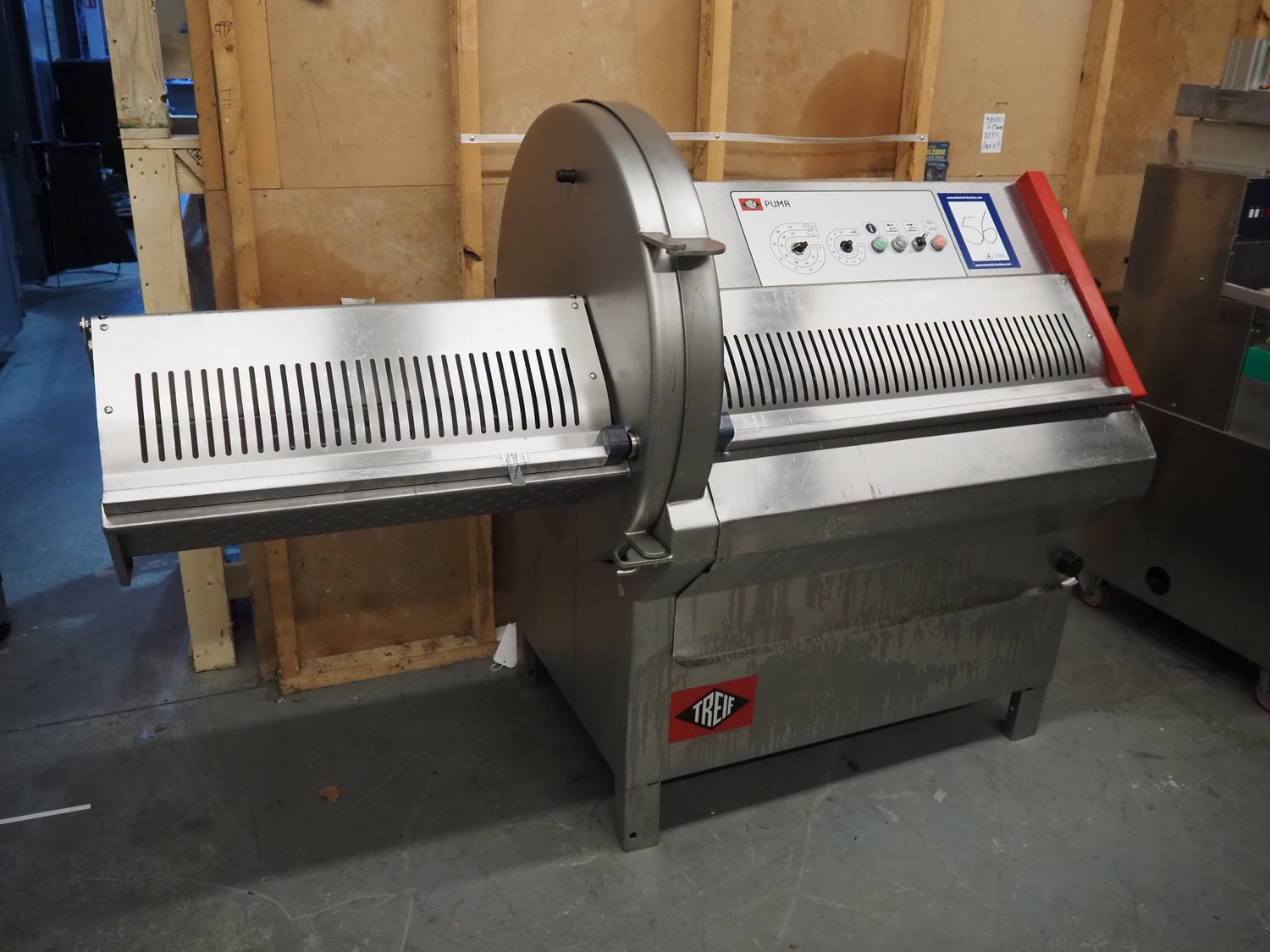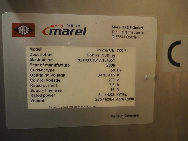 Treif Maschinenbau GmbH slicer, model: Puma CE 700 F, machine number: 192109.61817.101351, year of construction: 2006, 415 V, 3 Ph, 50 Hz, 16 A, 3.4 kW, weight: 285 kg, dimensions chamber: 250 mm x 230 mm, total dimensions: 1950 mm x 900 mm x 1420 mm.