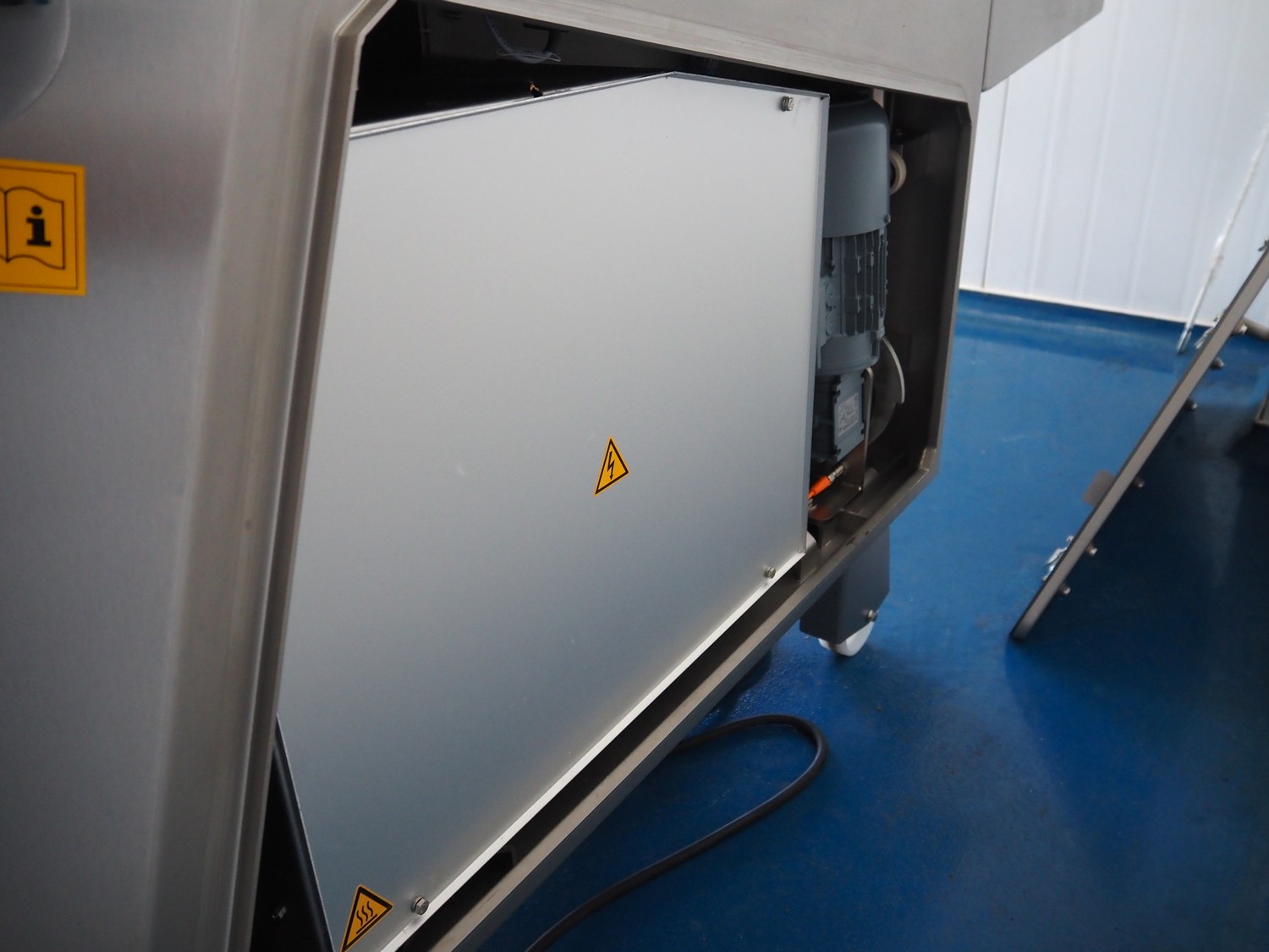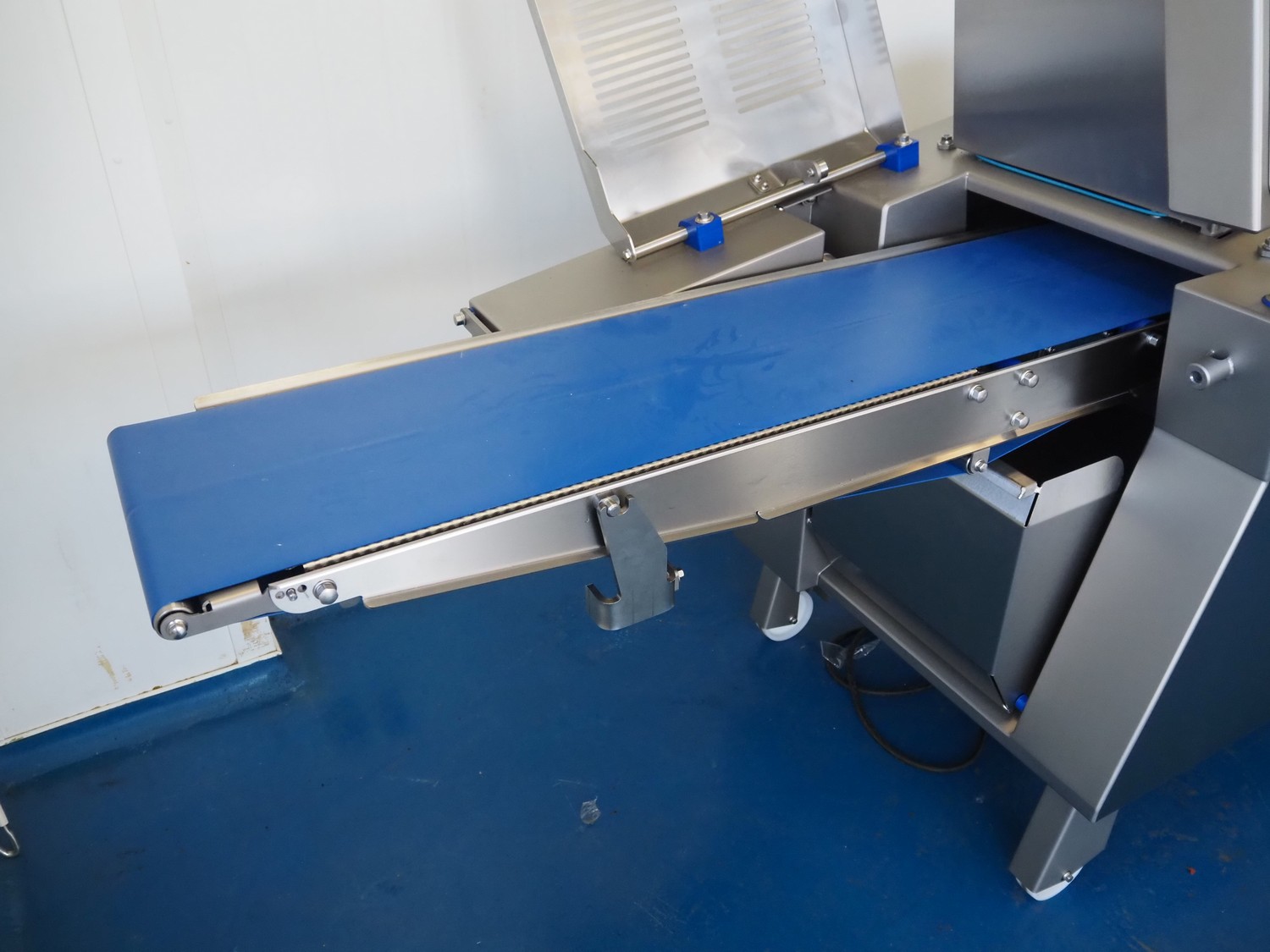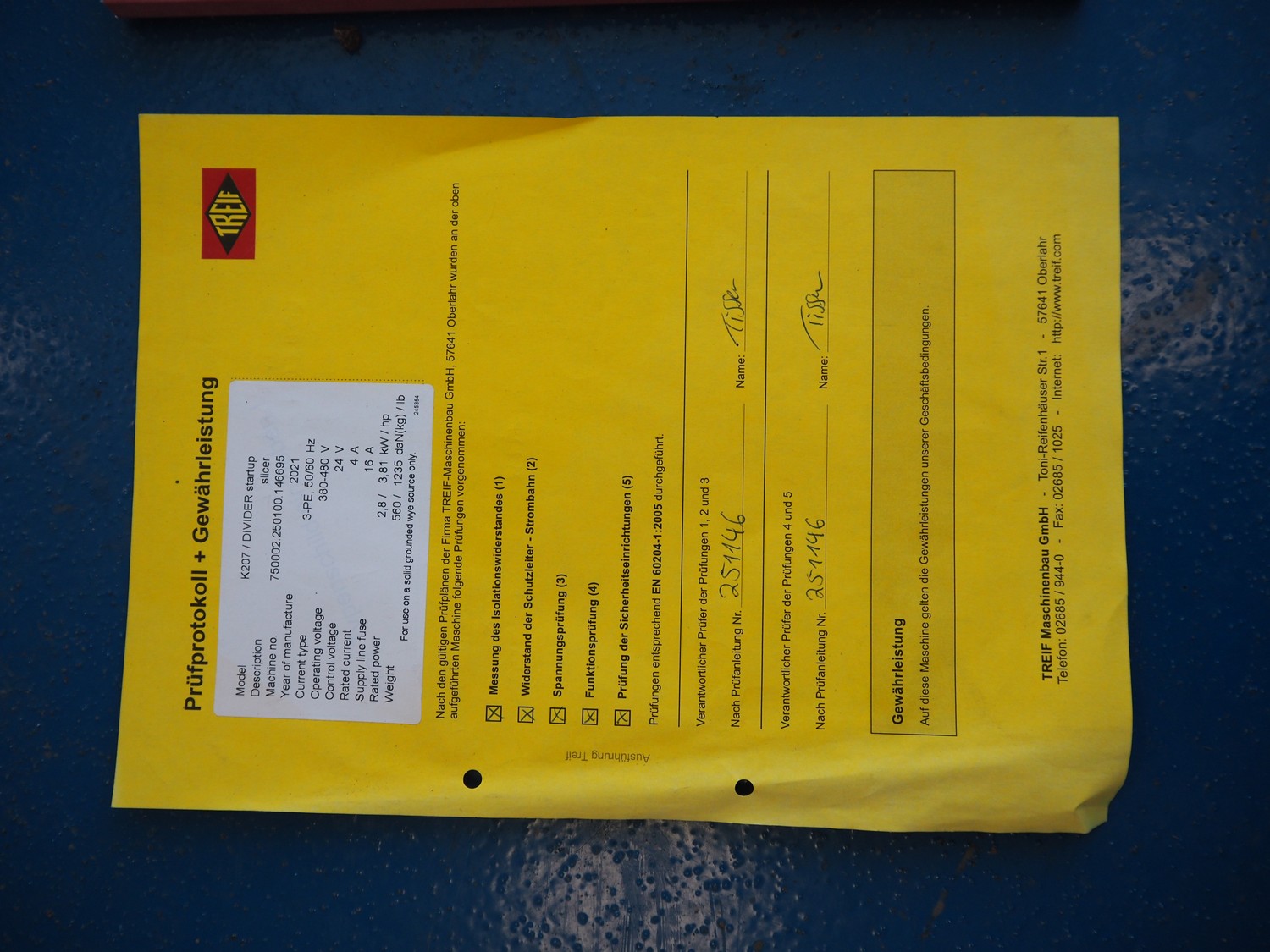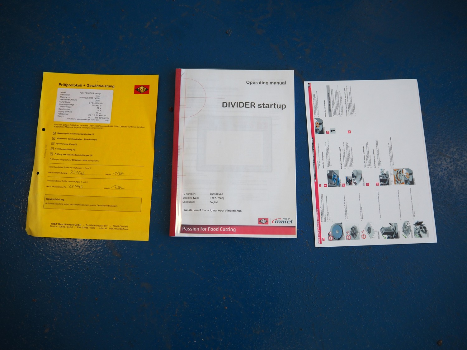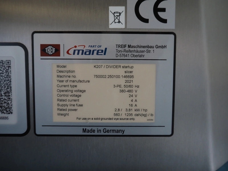 Treif Maschinenbau GmbH vertical slicer, model: K207 / DIVIDER startup, machine number: 750002.250100.146695, year of construction: 2021, 380-480 V, 3 Ph, 50/60 Hz, 16 A, 2.8 kW, weight: 560 kg, clearance: 280 mm x 180 mm, plastic belt, belt width: 360 mm, total dimensions: 2300 mm x 1100 mm x 2000 mm.