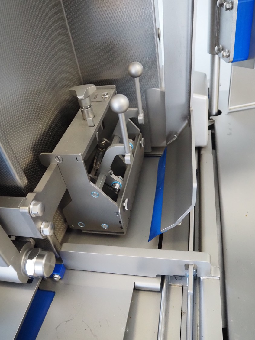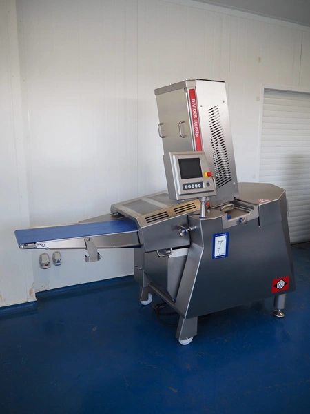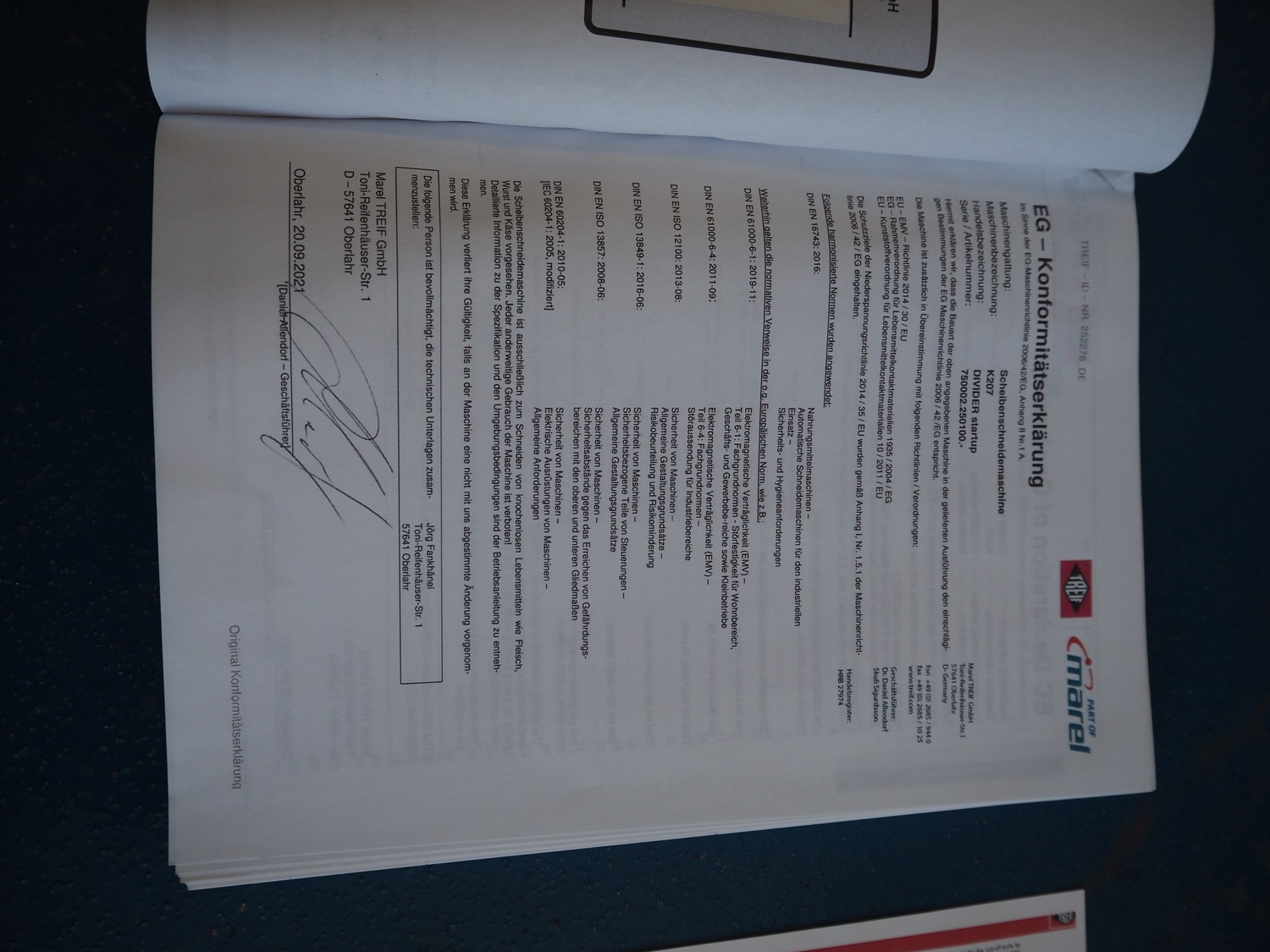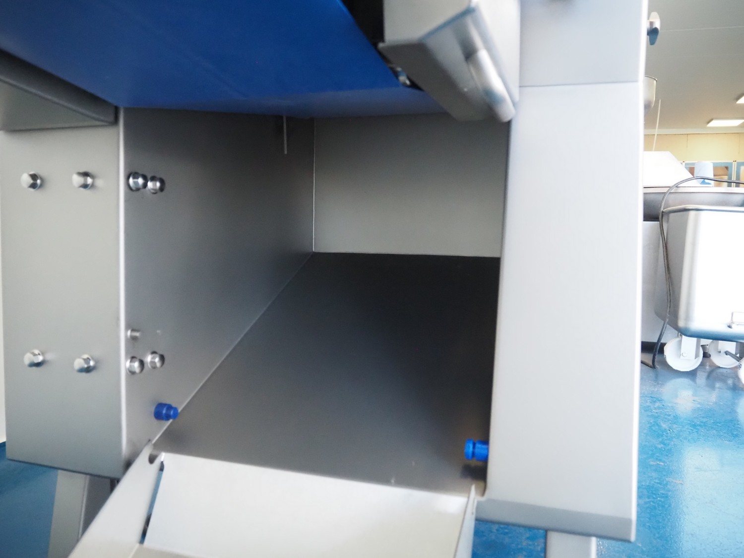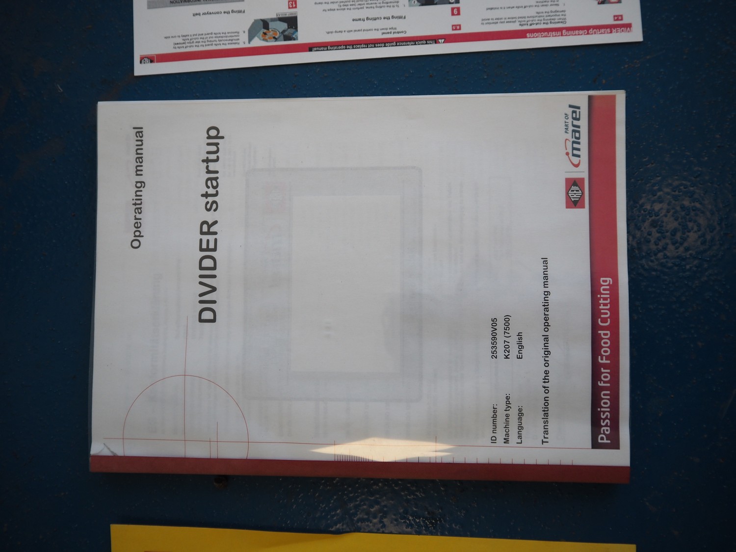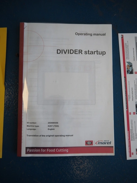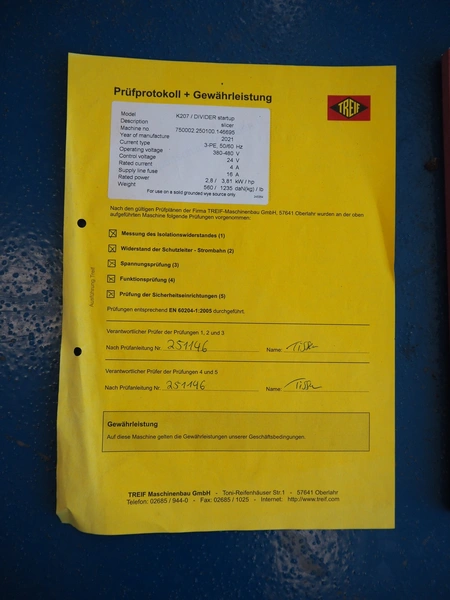 Treif Maschinenbau GmbH vertical slicer, model: K207 / DIVIDER startup, machine number: 750002.250100.146695, year of construction: 2021, 380-480 V, 3 Ph, 50/60 Hz, 16 A, 2.8 kW, weight: 560 kg, clearance: 280 mm x 180 mm, plastic belt, belt width: 360 mm, total dimensions: 2300 mm x 1100 mm x 2000 mm.
