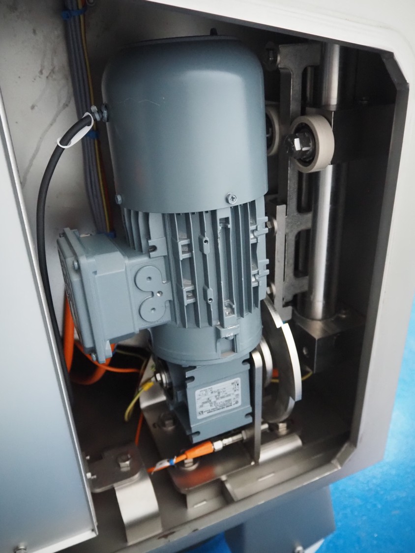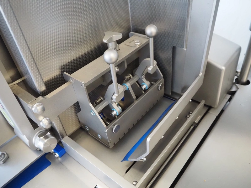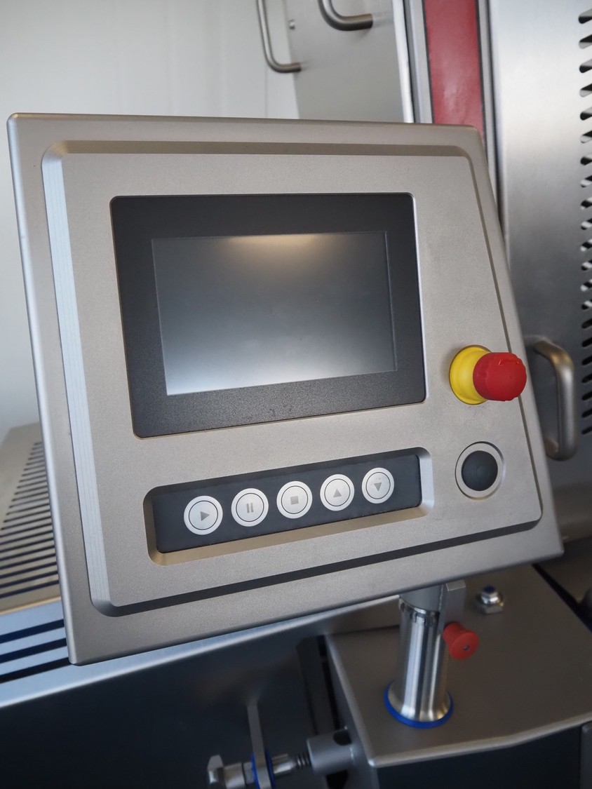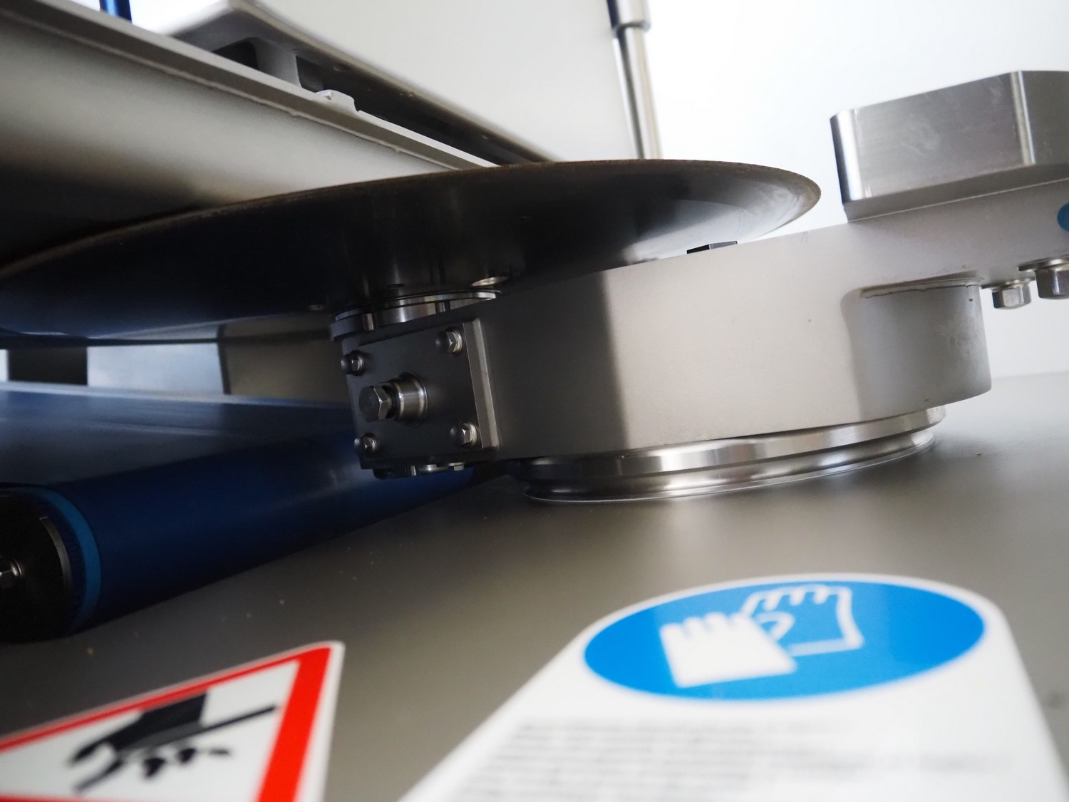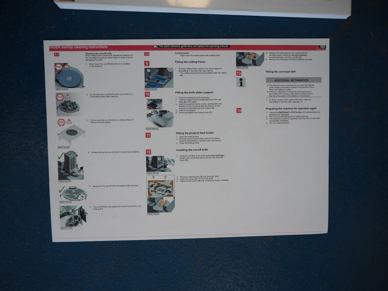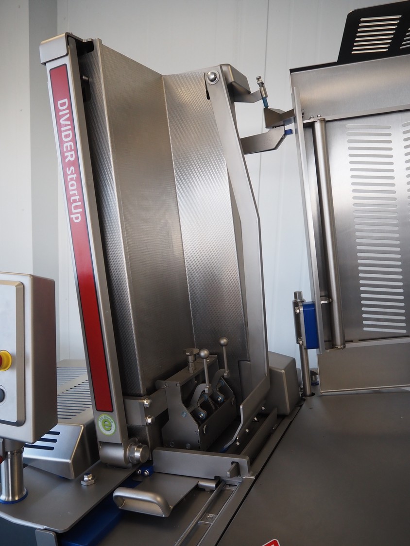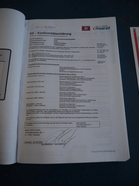 Treif Maschinenbau GmbH vertical slicer, model: K207 / DIVIDER startup, machine number: 750002.250100.146695, year of construction: 2021, 380-480 V, 3 Ph, 50/60 Hz, 16 A, 2.8 kW, weight: 560 kg, clearance: 280 mm x 180 mm, plastic belt, belt width: 360 mm, total dimensions: 2300 mm x 1100 mm x 2000 mm.