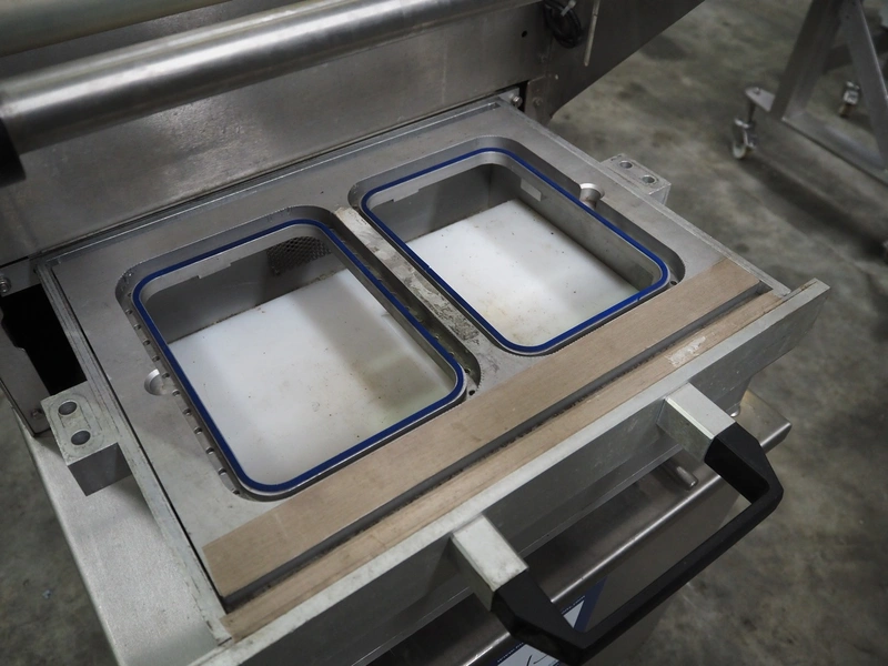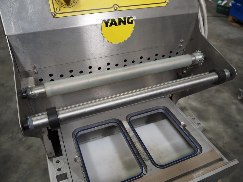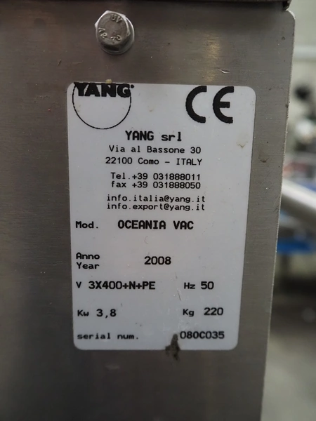 Yang srl mobile traysealer, model: OCEANIA VAC, serial number: 080C035, year of construction: 2008, 400 V, 3 Ph, 50 Hz, 3.8 kW, machine weight: 220 kg, dye: (2x) 225 mm x 155 mm, total dimensions: 1050 mm x 700 mm x 1370 mm.