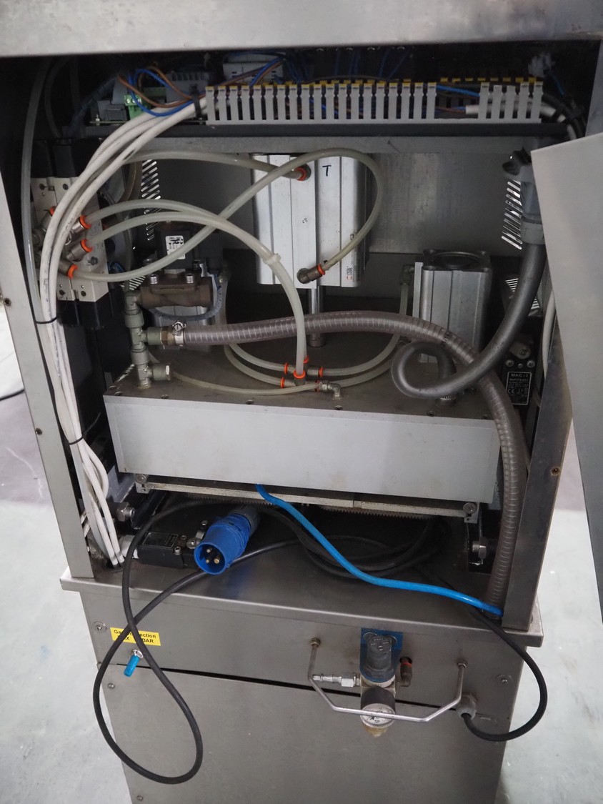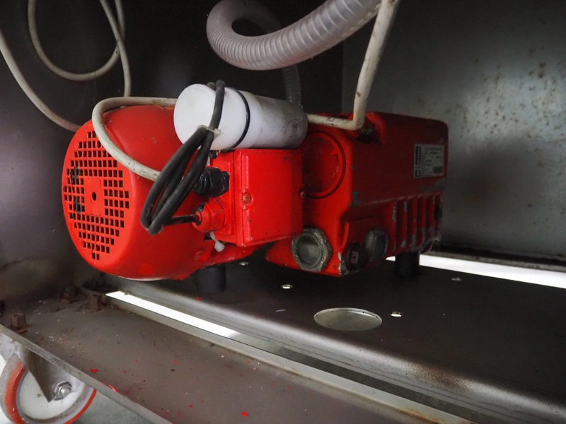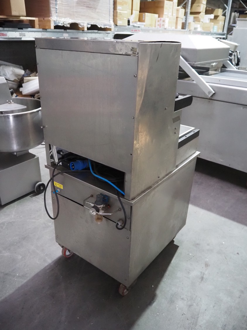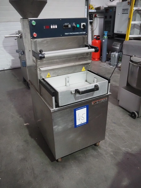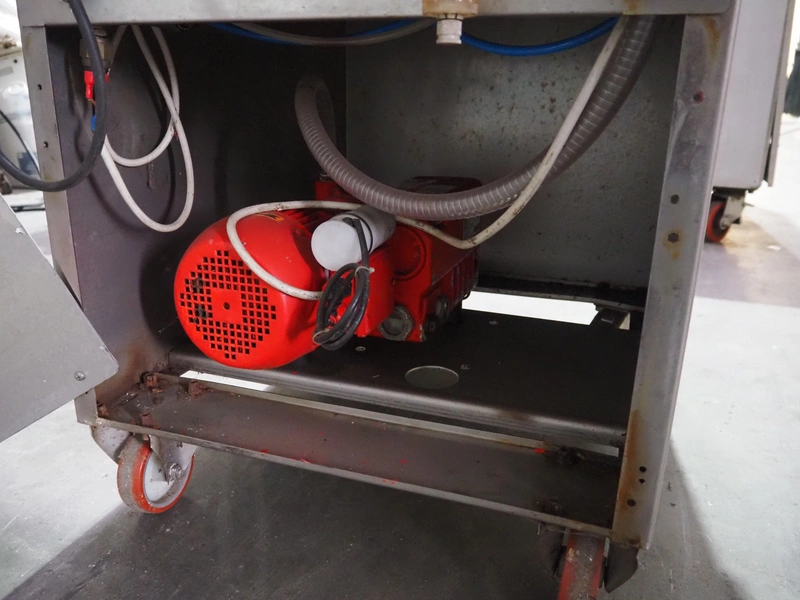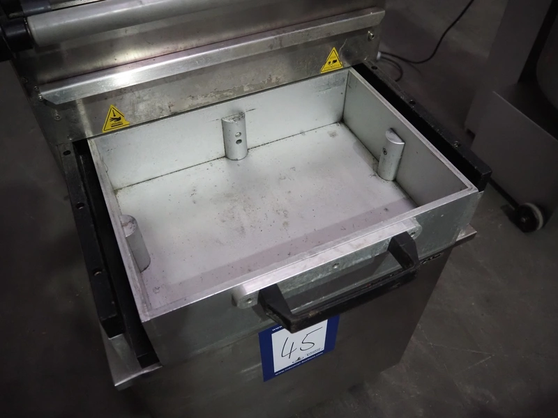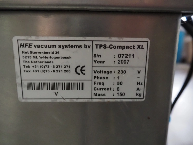 HFE Vacuum Systems bv mobile traysealer, model: TPS COMPACT XL, serial number: 07211, year of construction: 2007, 230 V, 1 Ph, 50 Hz, 8 A, weight: 150 kg, Busch vacuum pump, type: RA 0021 B 3S3 APZZ, year of construction: 2007, capacity: 21 m³ per hour, dye: (2x) 220 mm x 150 mm, film width: 410 mm, total dimensions: 850 mm x 560 mm x 1300 mm.