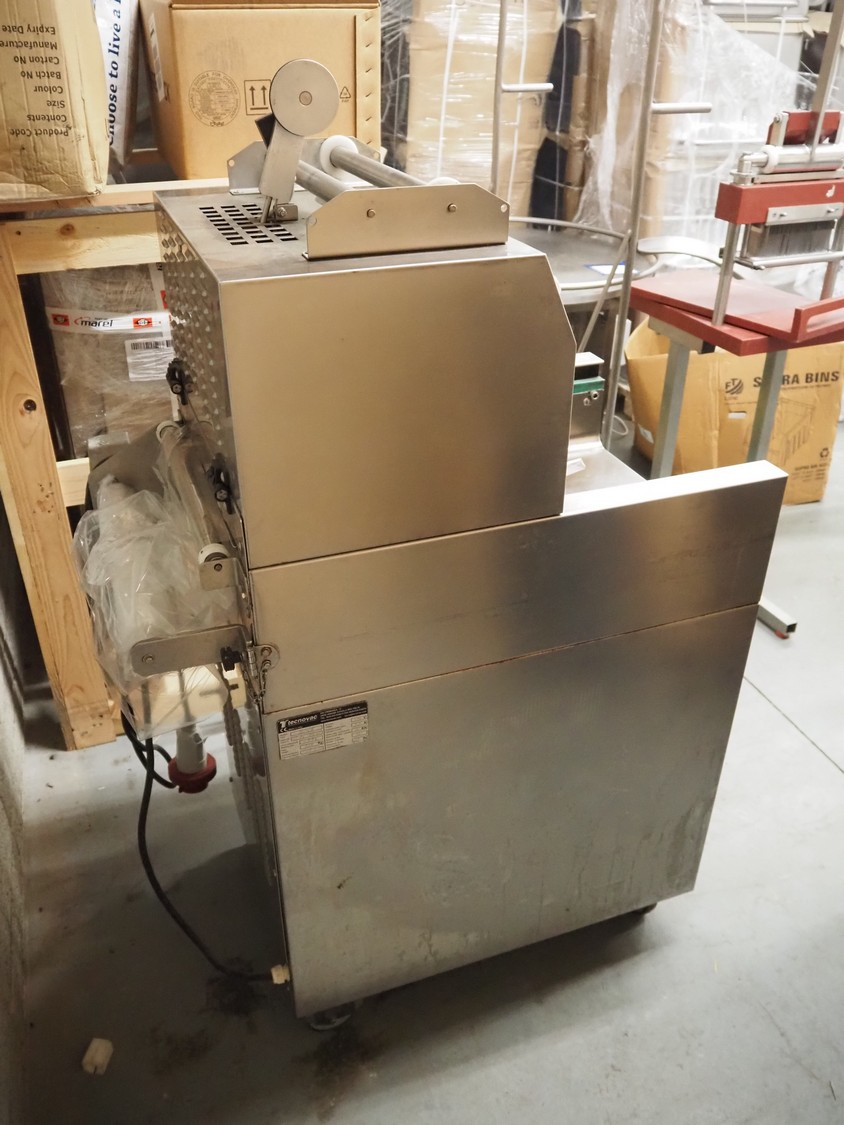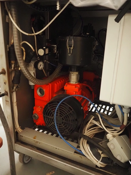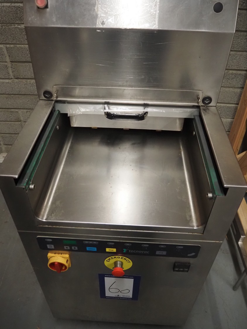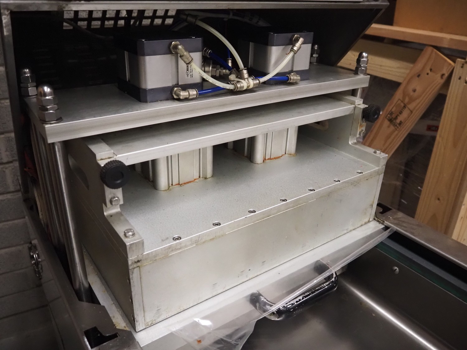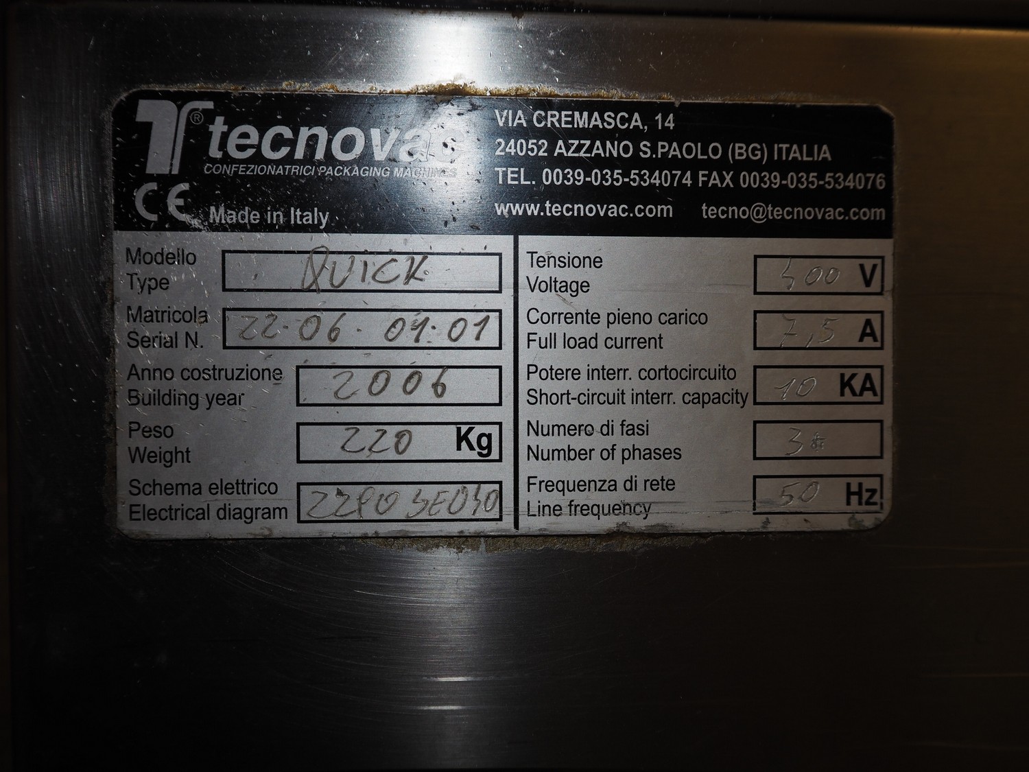 Tecnovac mobile traysealer, model: QUICK, serial number: 22-06-01-01, year of construction: 2006, 400 V, 3 Ph, 50 Hz, 7.5 A, weight: 220 kg, Busch vacuum pump, film width: 420 mm, total dimensions: 1000 mm x 600 mm x 1550 mm.