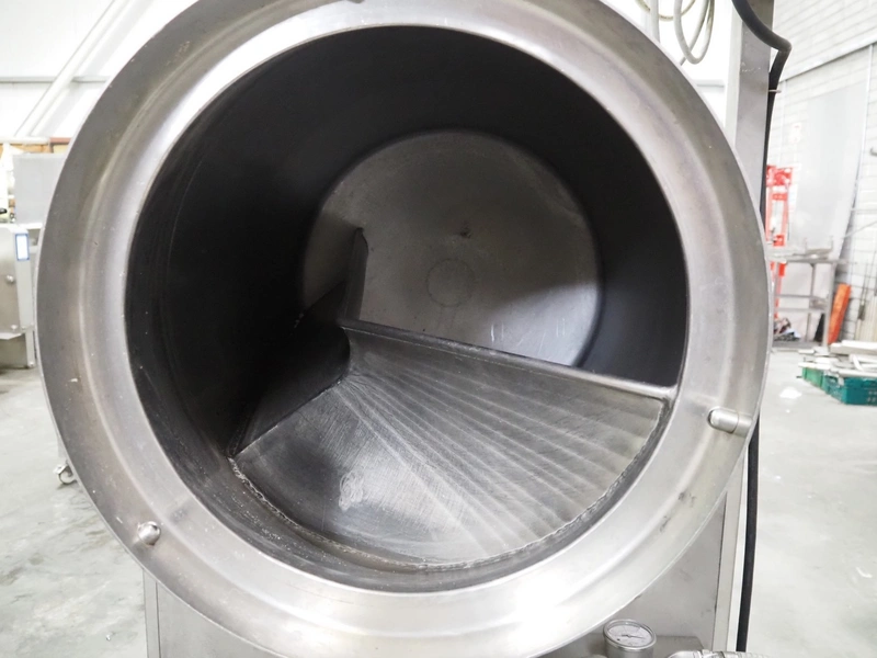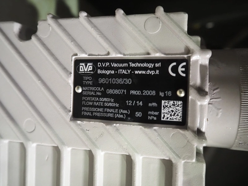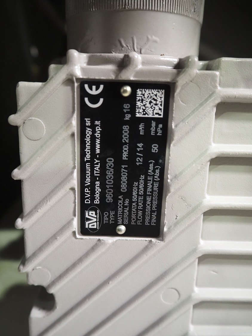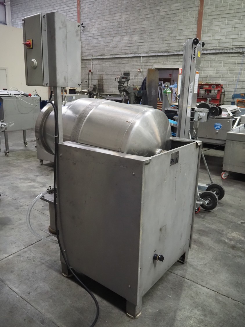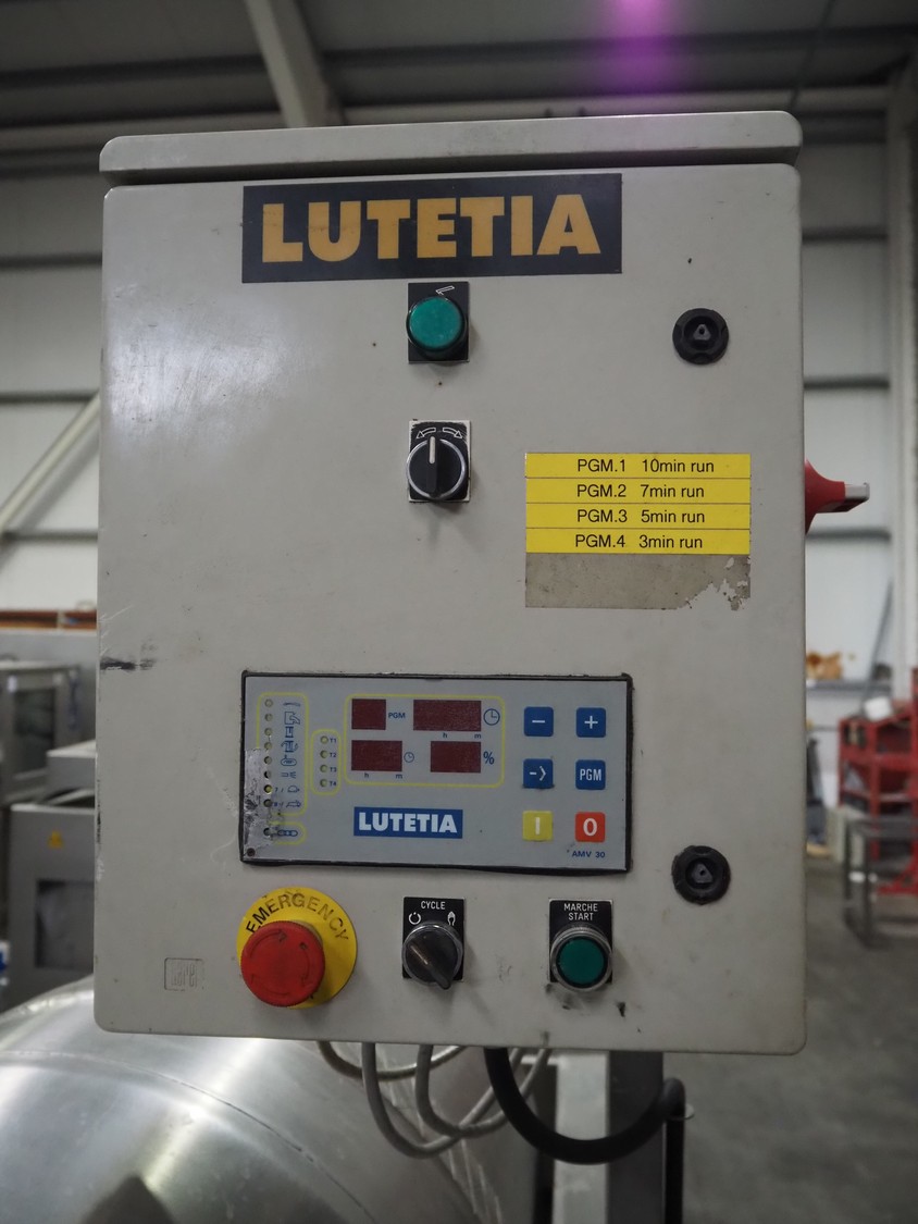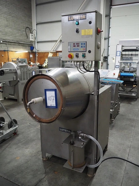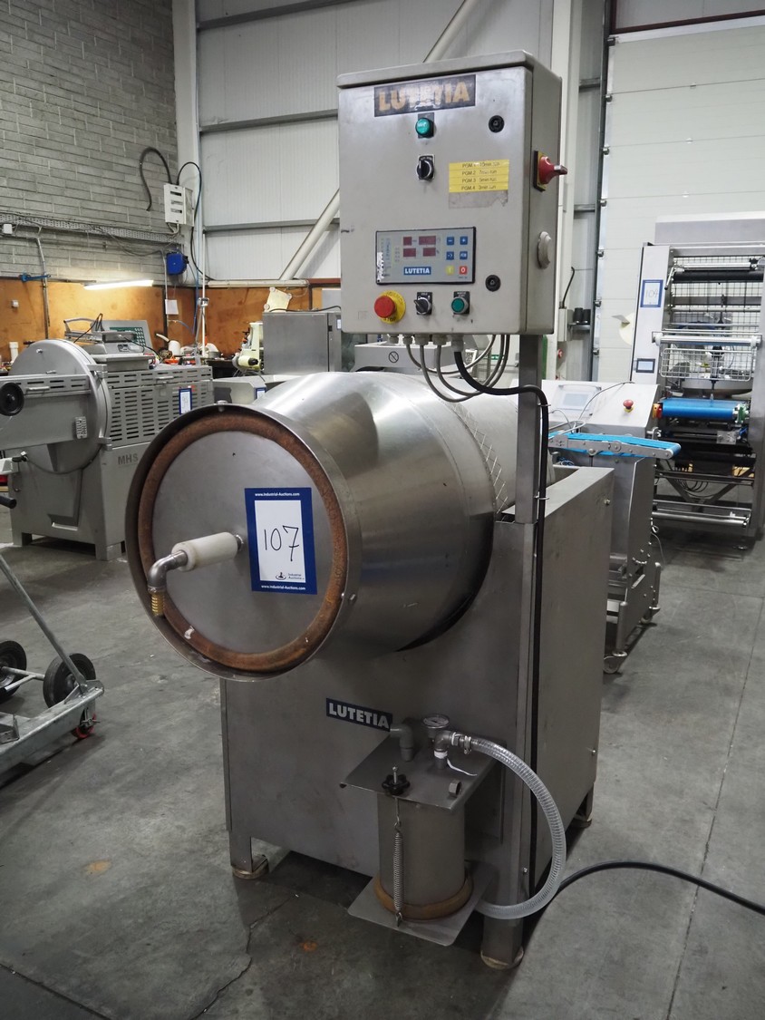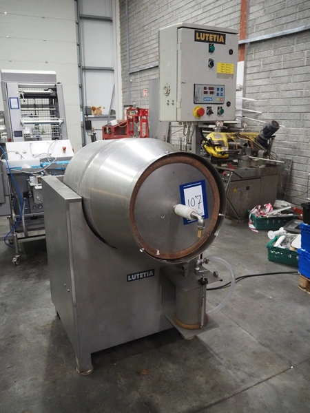 Lutetia vacuum tumbler, type: 0, number: 15931, year of construction: 2000, 415 V, 50 Hz, volume: 150 liter, D.V.P. vacuum Technology srl, type: 9601036/30, serial number: 0808071, year of construction: 2008, capacity: 12/14 m³ per hour, total dimensions: 1430 mm x 850 mm x 1980 mm.