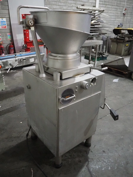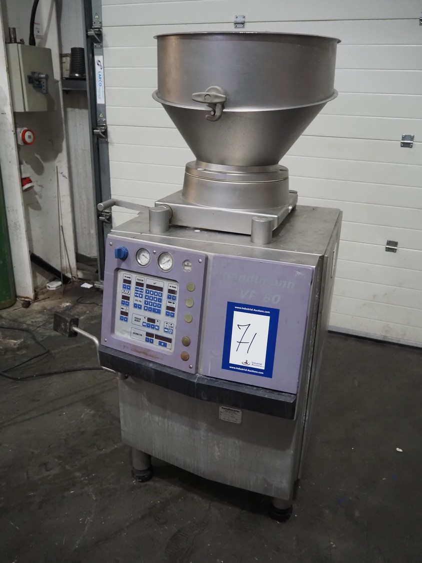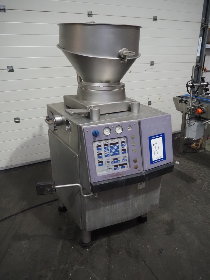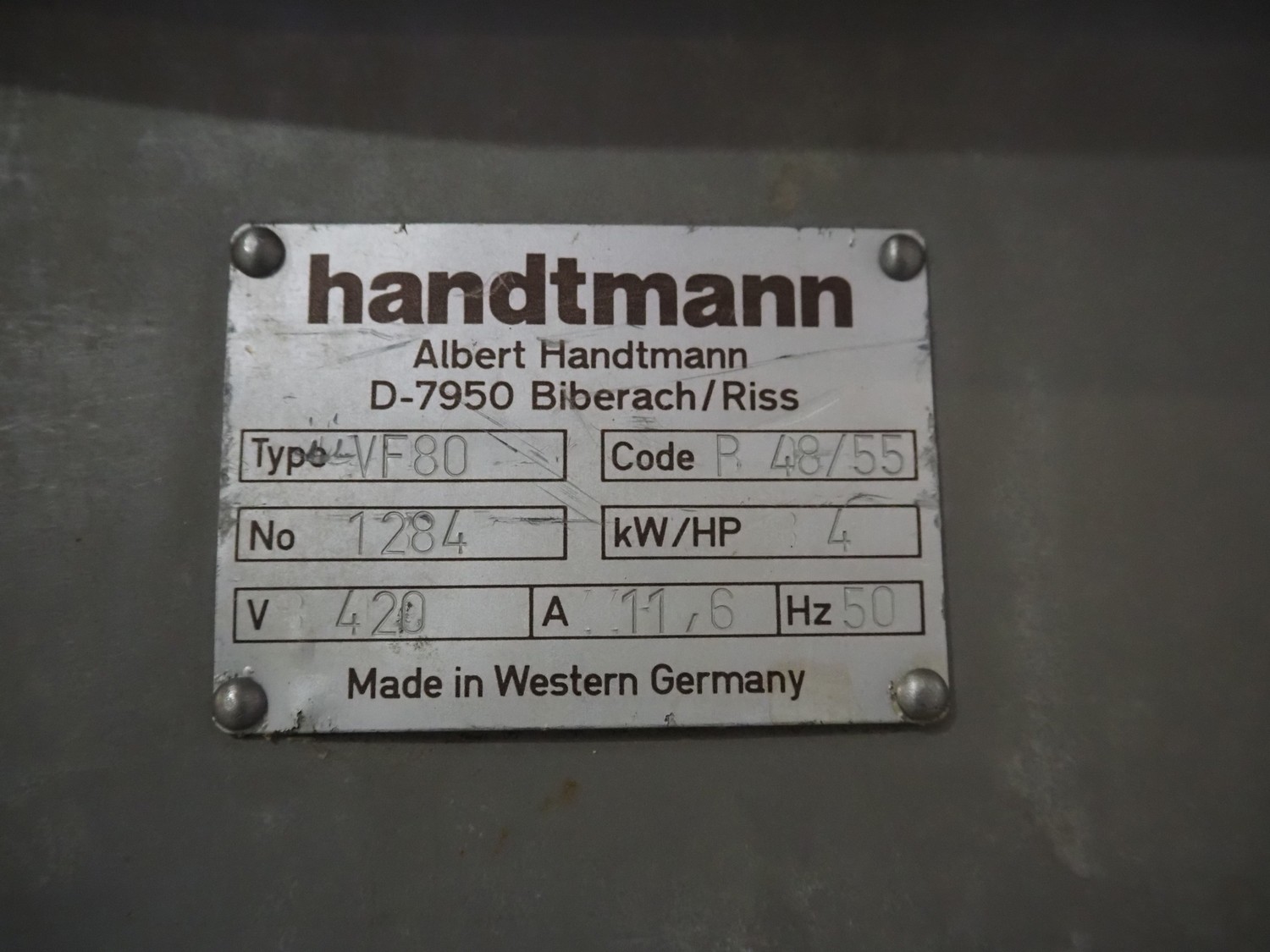 Handtmann vacuum filling machine, type: VF 80, number: 1284, 420 V, 50 Hz, 11.6 A, 4 kW, Rietschle vacuum pump, dimensions: 1000 mm x 830 mm x 1630 mm.