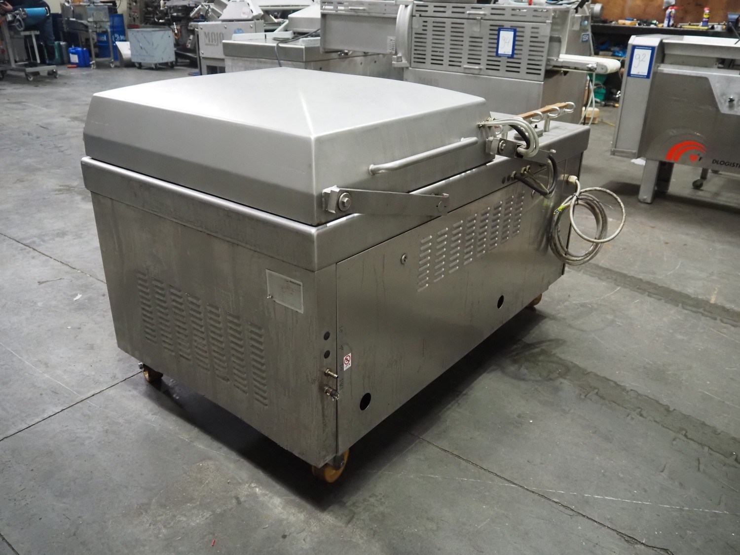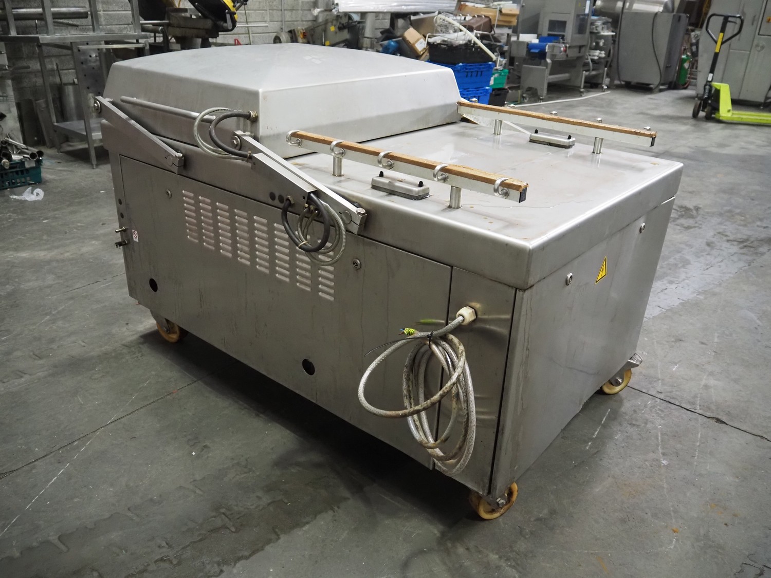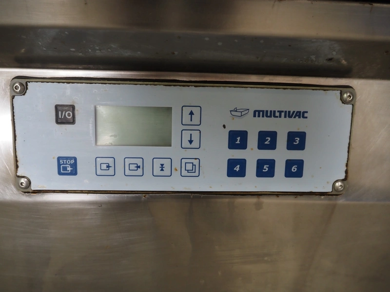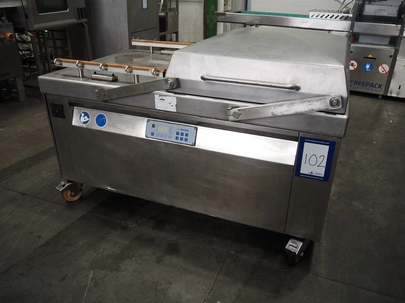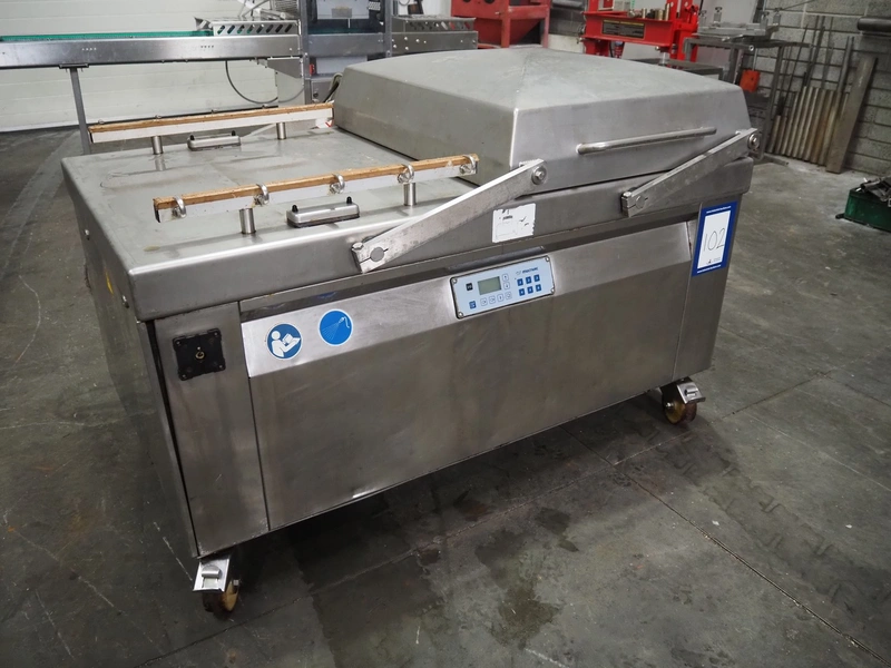 Multivac mobile double chamber vacuum machine, Busch vacuum pump, type: RA 0160 D 5Z1 VRXZ, year of construction: 2011, capacity: 160 m³ per hour, seal length: (2x) 670 mm, dimensions chamber: (2x) 670 mm x 740 mm, total dimensions: 1590 mm x 1010 mm x 1070 mm.
