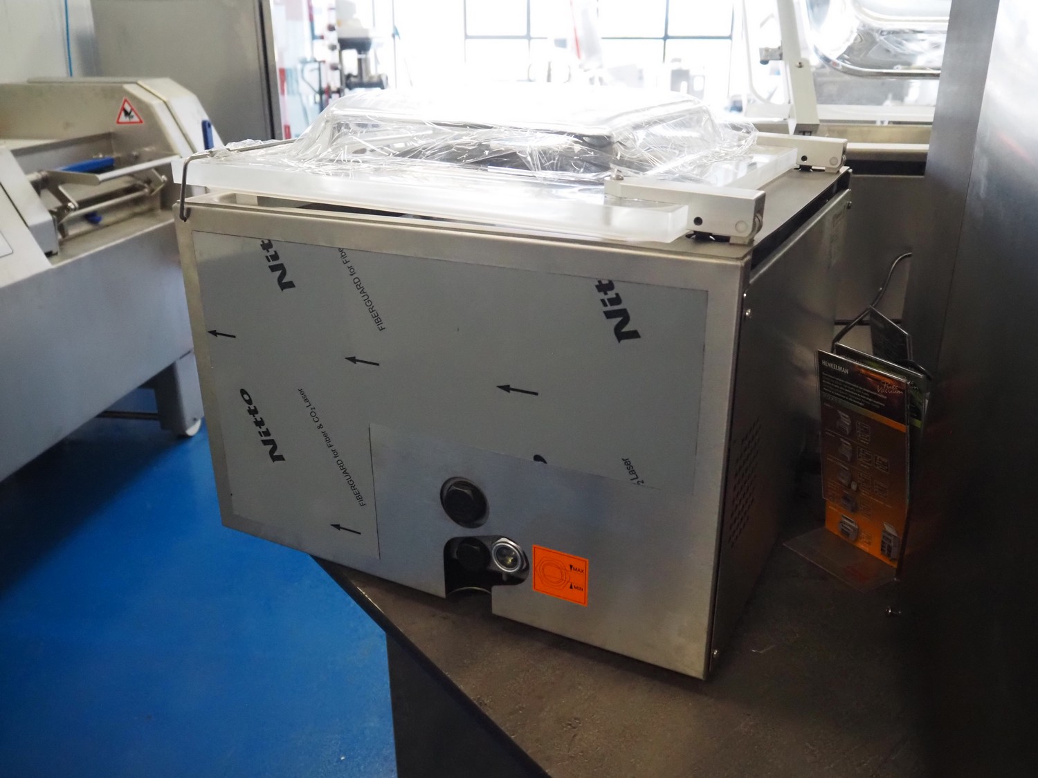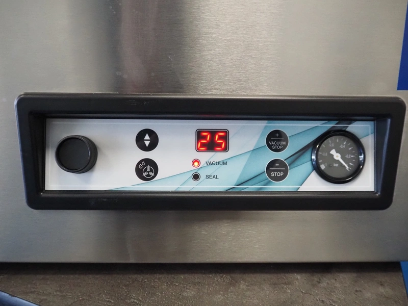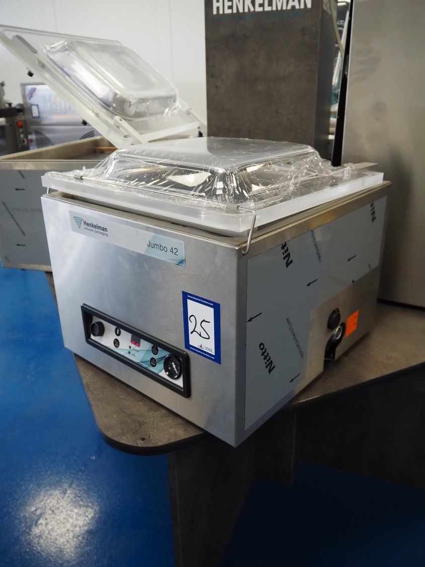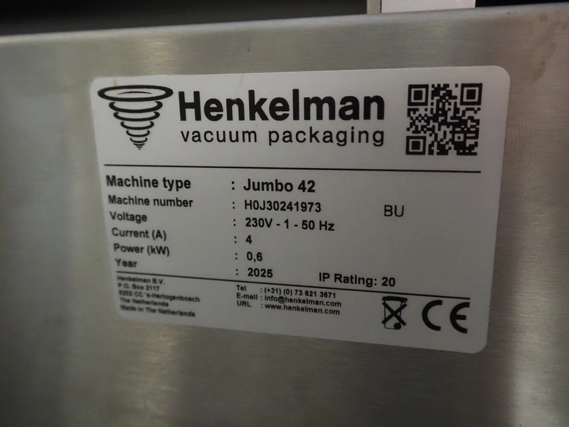 Henkelman vacuum machine, type: Jumbo 42, machine number: H0J30241973, year of construction: 2025, 230 V, 1 Ph, 50 Hz, 4 A, 0.6 kW, seal length: 430 mm, chamber dimensions: 430 mm x 370 mm, total dimensions: 520 mm x 500 mm x 450 mm. Incomplete, one seal bar missing.