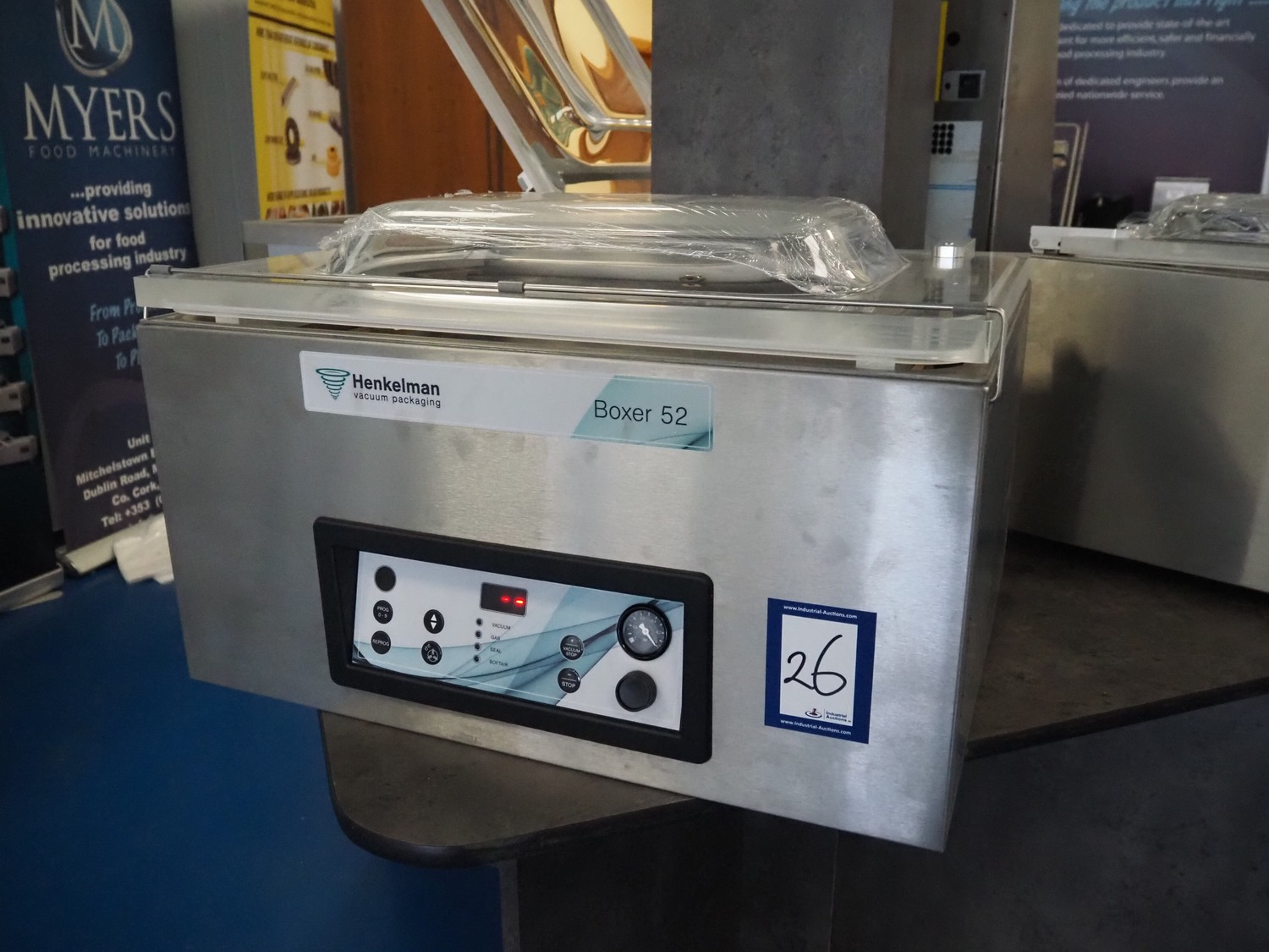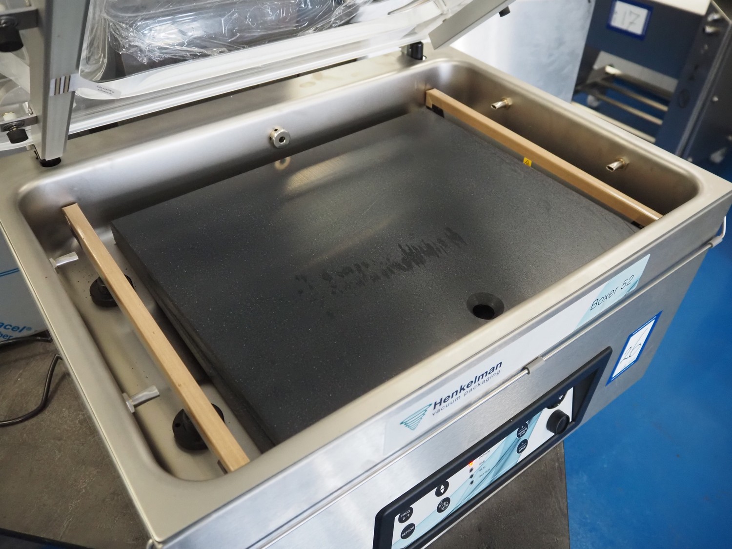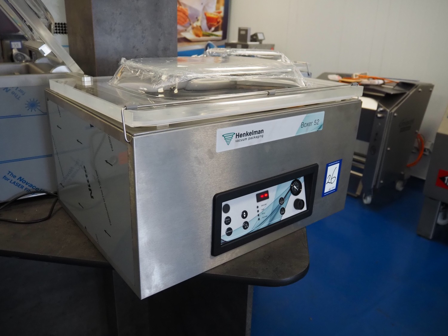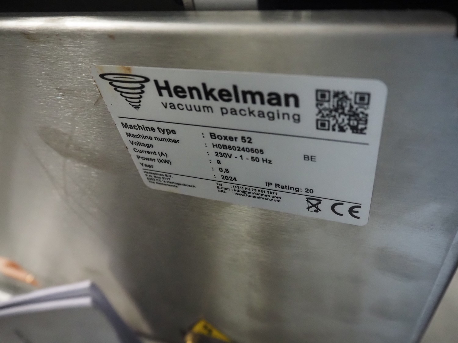 Henkelman vacuum machine, type: Boxer 52, machine number: H0B60240505, year of construction: 2024, 230 V, 1 Ph, 50 Hz, 8 A, 0.8 kW, seal length: (2x) 420 mm, chamber dimensions: 600 mm x 420 mm, total dimensions: 700 mm x 520 mm x 450 mm.
