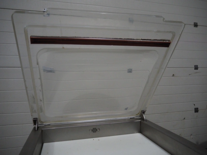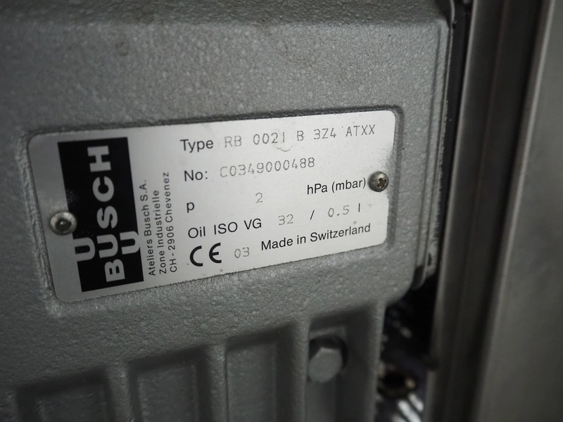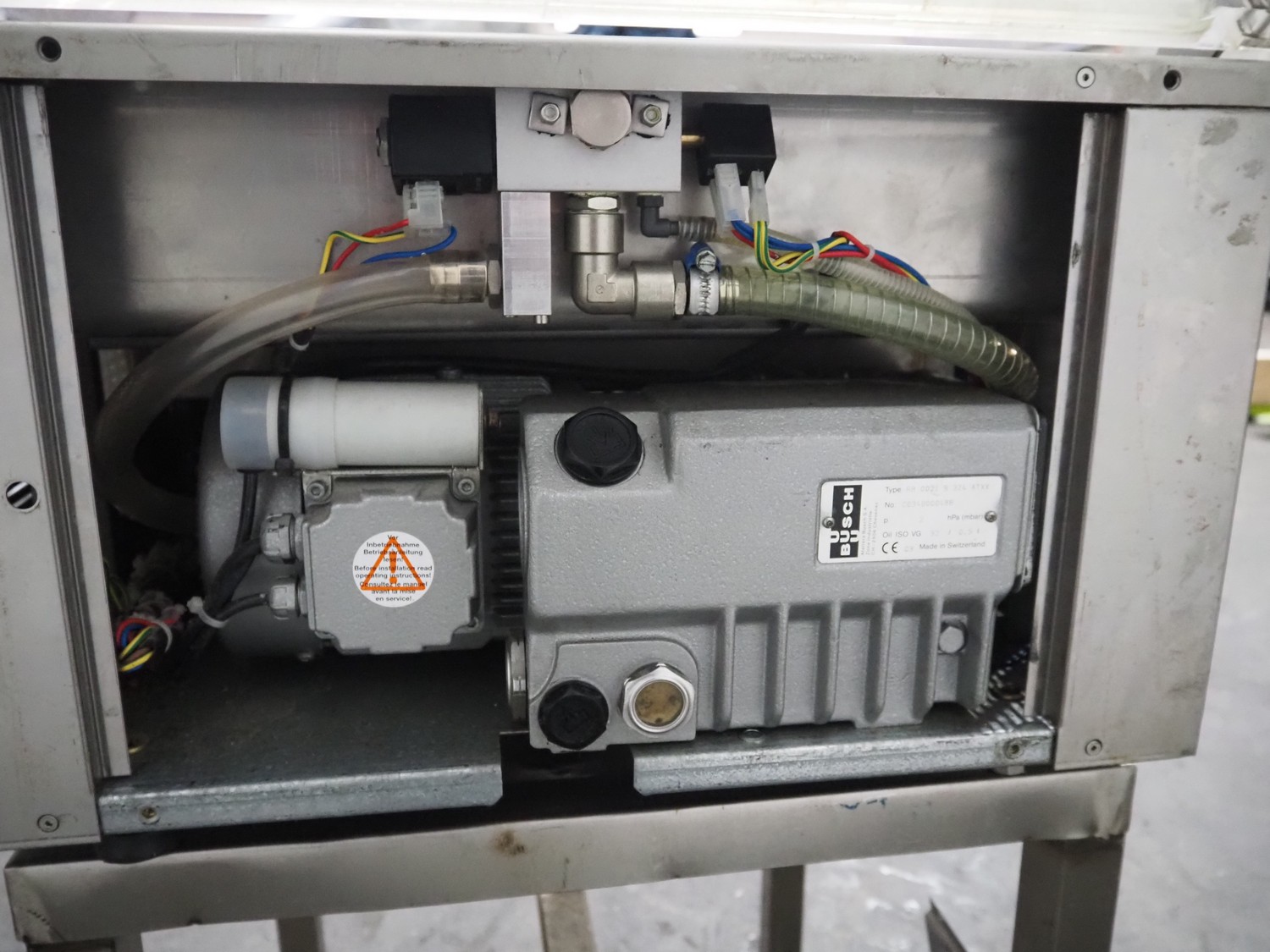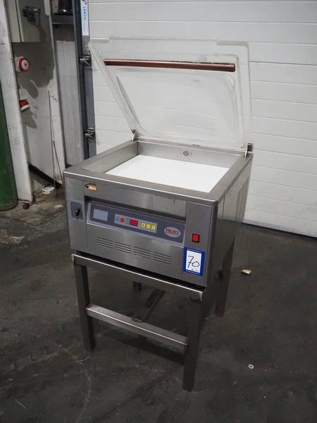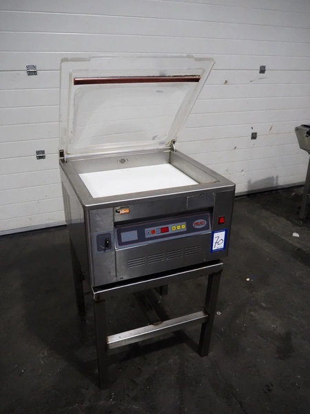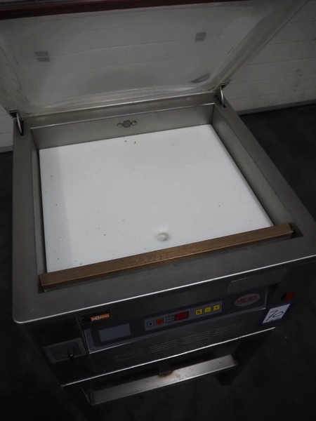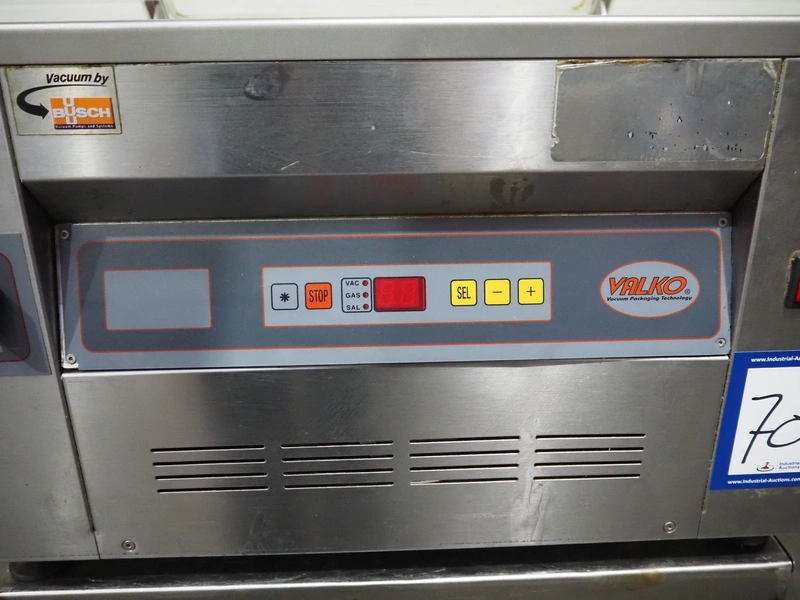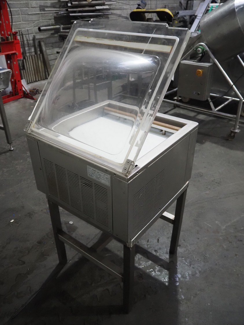 Valko s.r.l. vacuum machine on s/s frame, model: VC 20/50, number: 00623, year of construction: 2005, 230 V, 50 Hz, 0.9 kW, Busch vacuum pump, type: RB 0021 B 3Z4 ATXX, year of construction: 2003, capacity: 21 m³ per hour, seal length: 500 mm, dimensions chamber: 500 mm x 440 mm, total dimensions Valko s.r.l.: 600 mm x 600 mm x 380 mm, dimensions s/s frame: 570 mm x 570 mm x 570 mm.