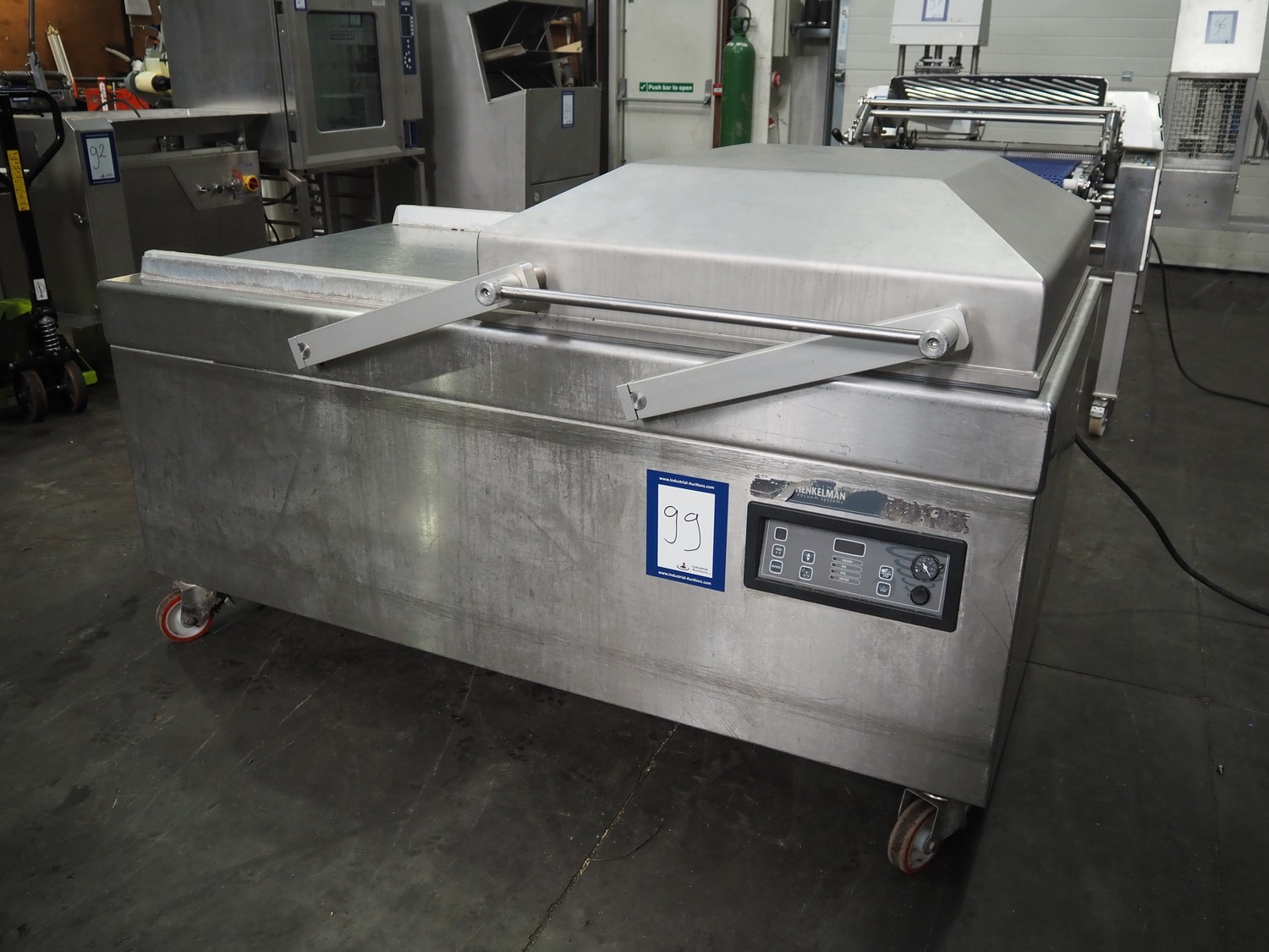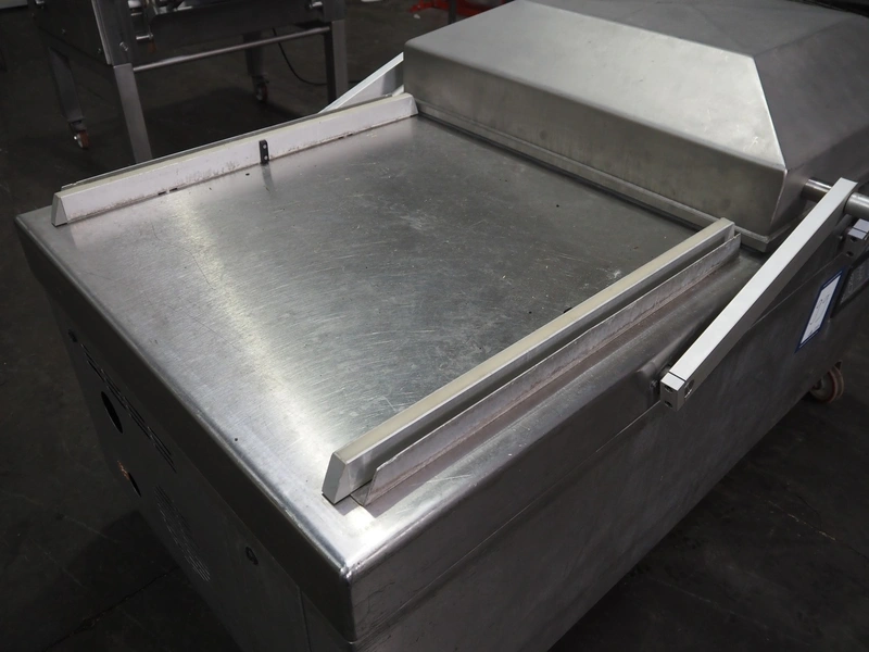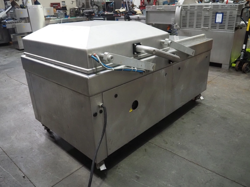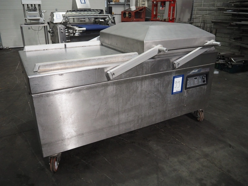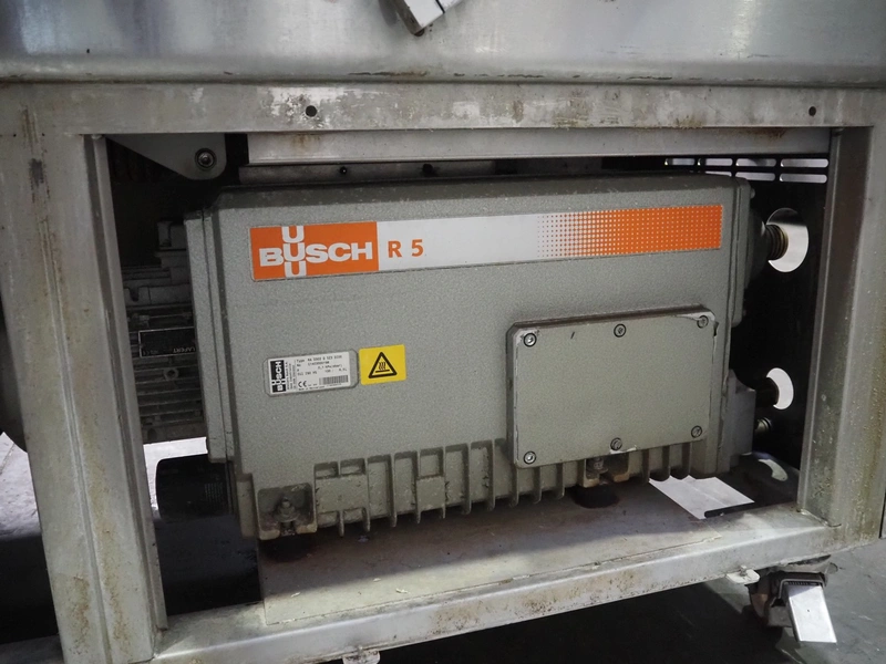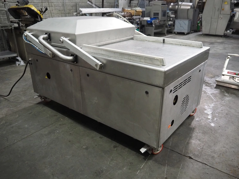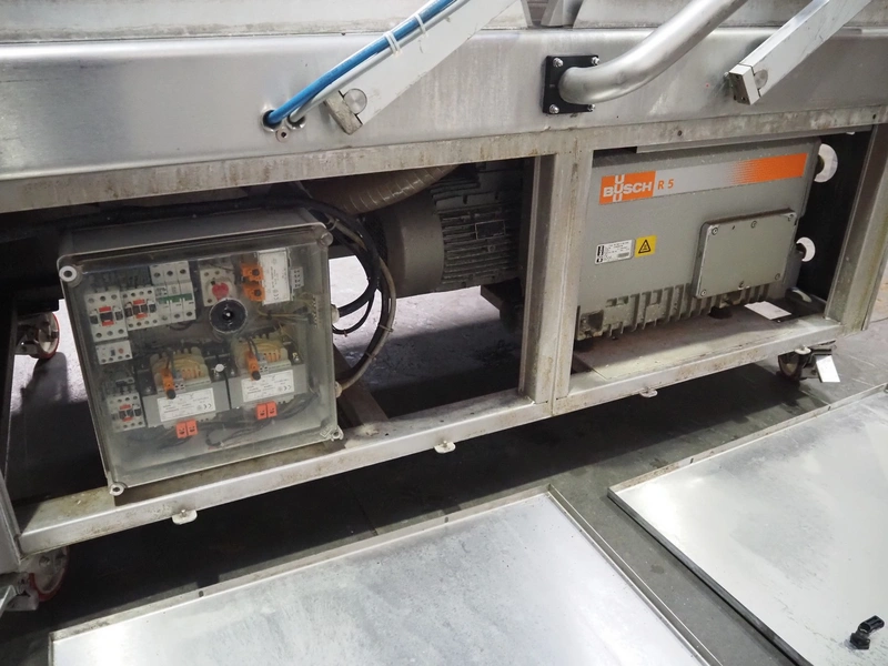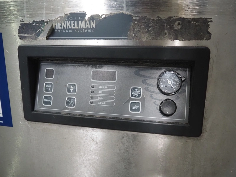 Henkelman mobile double chamber vacuum machine, Busch vacuum pump, type: RA 0302 D 5Z3 DIXX, year of construction: 2014, capacity: 300 m³ per hour, seal width: (2x) 840 mm, dimensions chamber: (2x) 840 mm x 830 mm, total dimensions: 1900 mm x 1200 mm x 1120 mm.