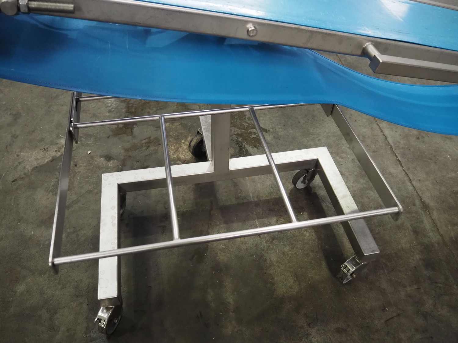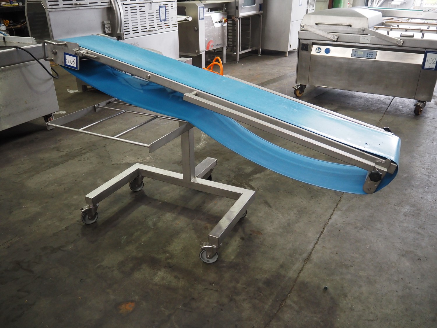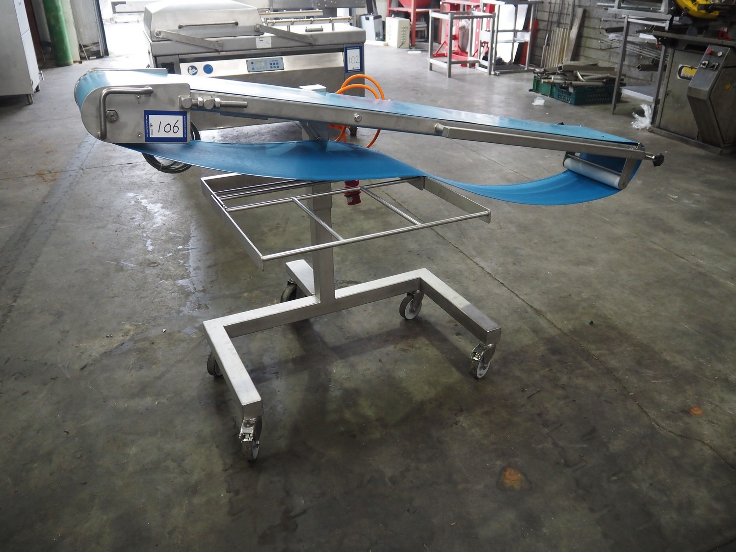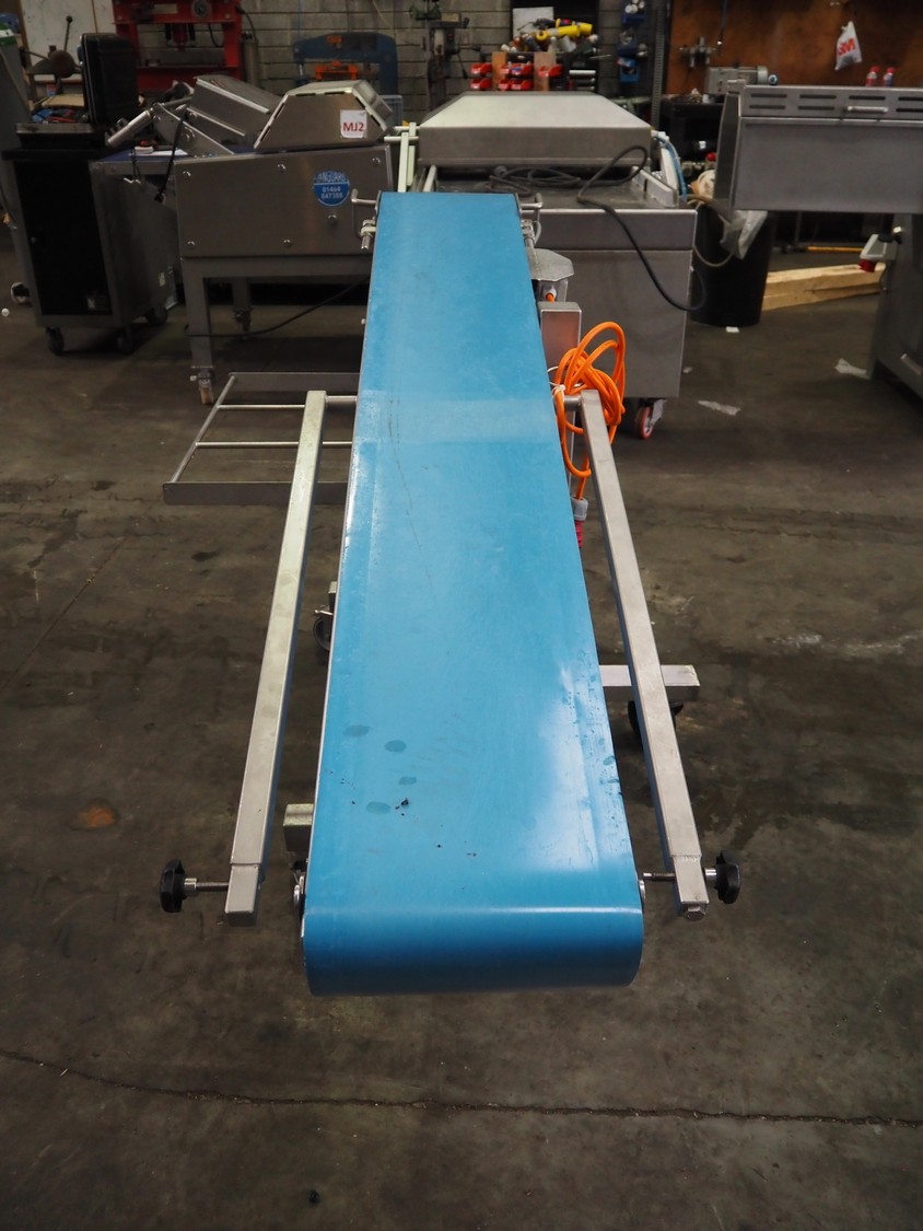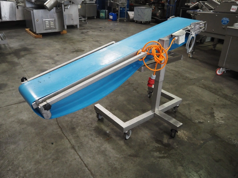 Mobile elevating belt, s/s frame, plastic belt, belt width: 290 mm, total dimensions: 1900 mm x 1020 mm x 1060 mm.