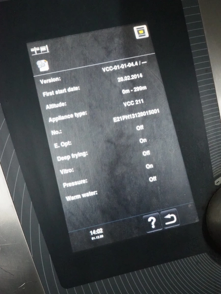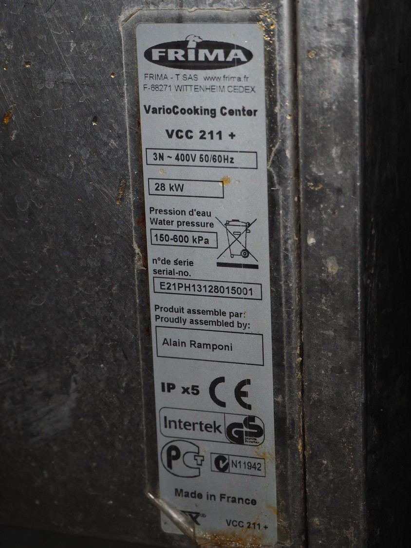 Frima VarioCooking Center, model: VCC 211+, serial number: E21PH13128015001, 400 V, 3 Ph, 50/60 Hz, 28 kW, dimensions: 1160 mm x 860 mm x 1120 mm.