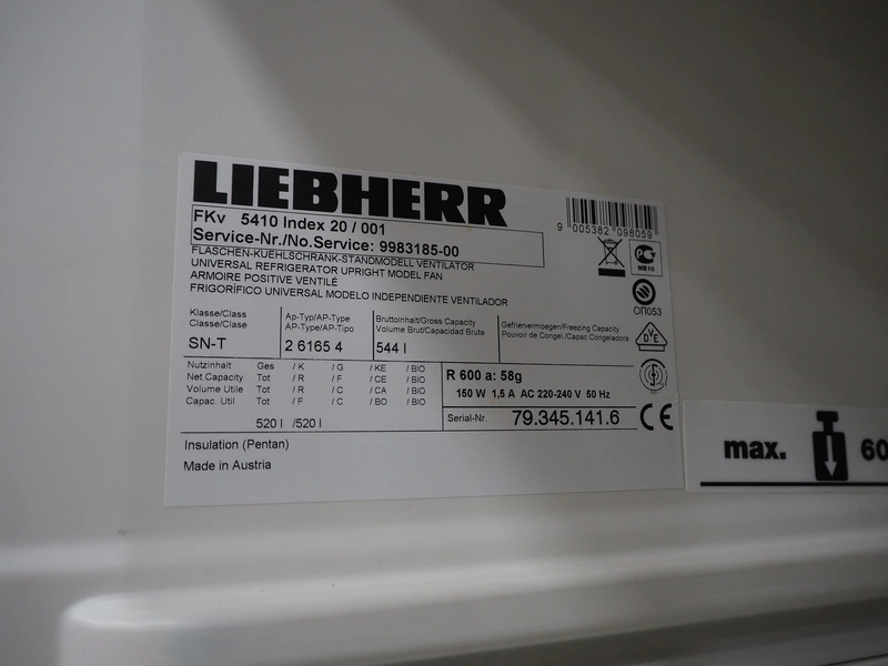 Liebherr refrigerator, model: 2 6165 4, serial number: 79.345.141.6, 220-240 V, 50 Hz, 1.5 A, 150 W, refrigerant: R 600 a / 58 gram, volume: 544 liter, 5 floors, floor dimensions: 550 mm x 610 mm, total dimensions: 760 mm x 750 mm x 1640 mm.