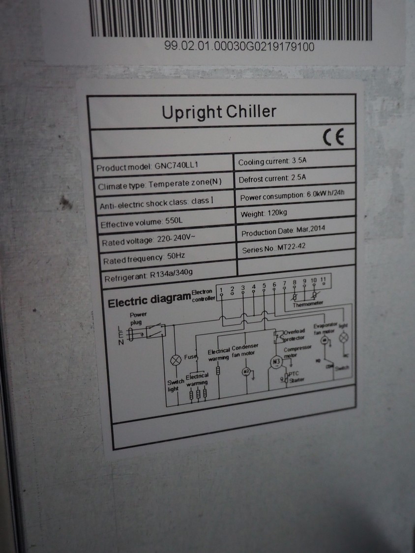 Metos mobile refrigerator, model: GNC740LL1, serial number: MT22-42, year of construction: 2014, 220-240 V, 50 Hz, 3.5 A, 6.0 kW, weight: 120 kg, refrigerant: R134a/340 gram, volume: 550 liter, 3 floors, floor dimensions: 620 mm x 530 mm, total dimensions: 880 mm x 750 mm x 2050 mm.