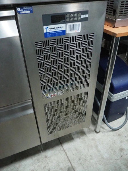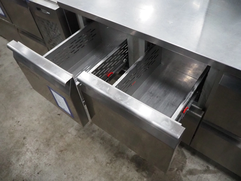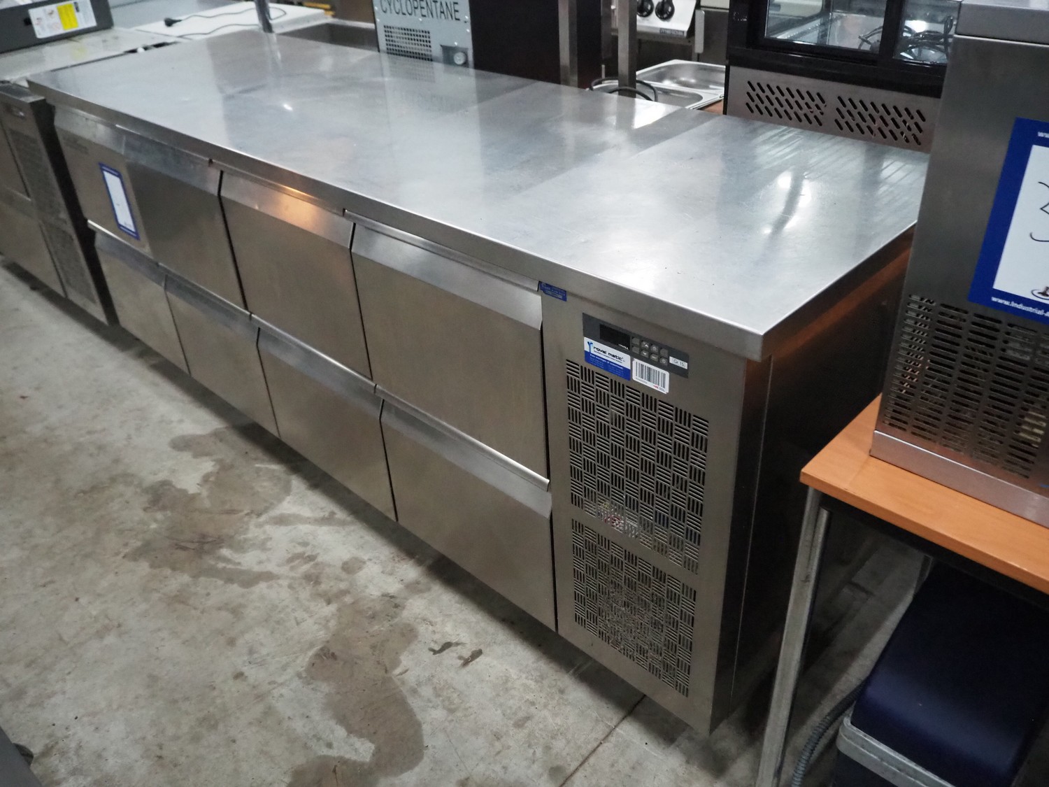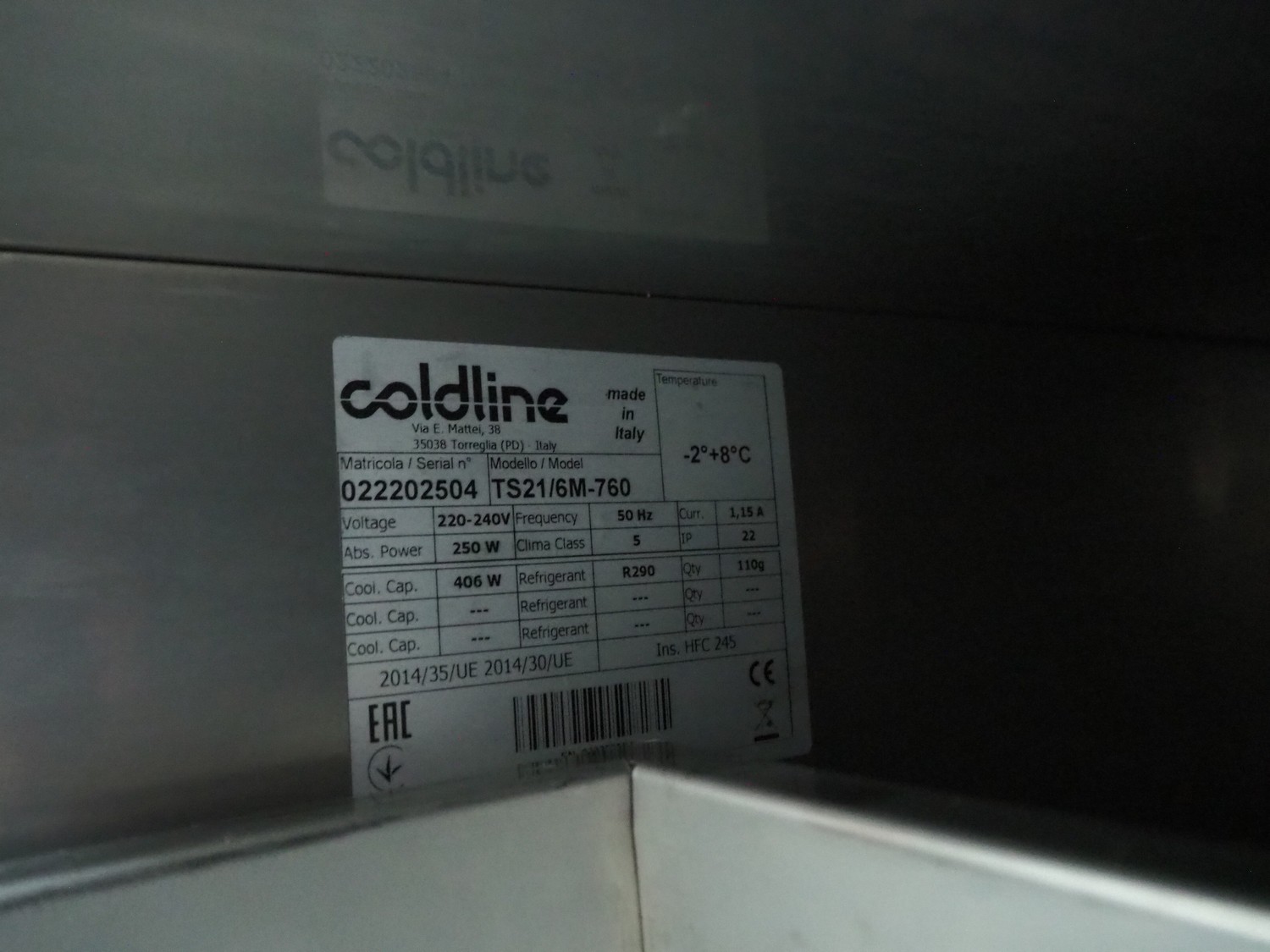 Coldline refrigeration counter, model: TS21/6M-760, serial number: 022202504, 220-240 V, 50 Hz, 1.15 A, refrigerant: R290/110 g, temperature range: -2-8 °C, dimensions: 700 mm x 2325 mm x 945 mm.