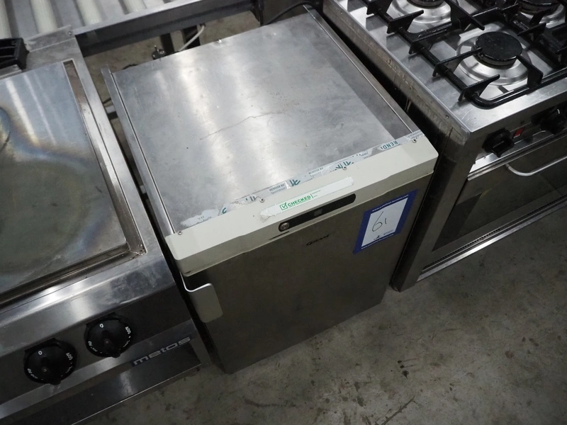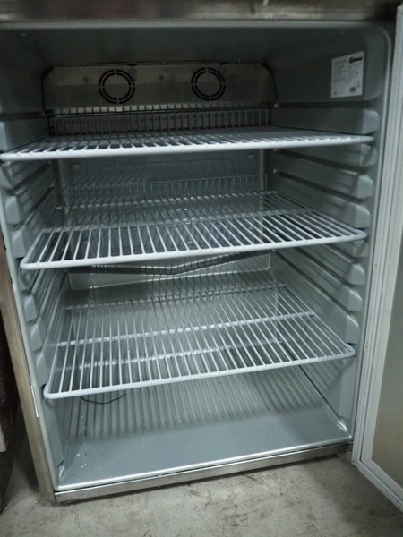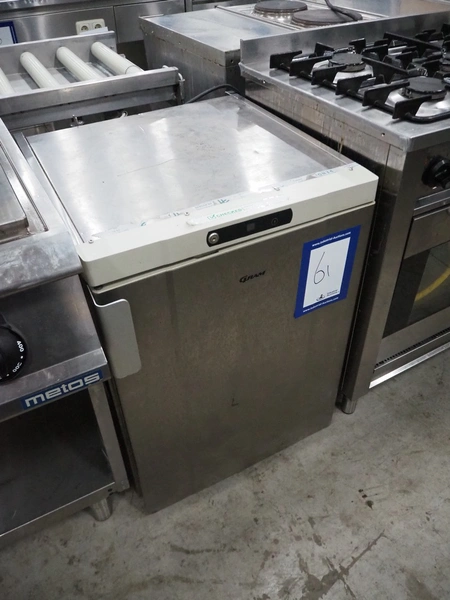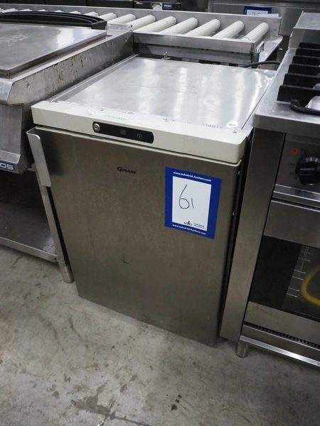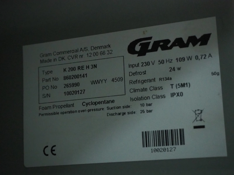 Gram Commercial A/S refrigerator, type: K 200 RE H 3N, serial number: 10020127, year of construction: 2009, 230 V, 50 Hz, 109 W, 0.72 A, 7 floors, 3 racks, dimensions racks: (3x) 430 mm x 530 mm, total dimensions: 670 mm x 590 mm x 840 mm.