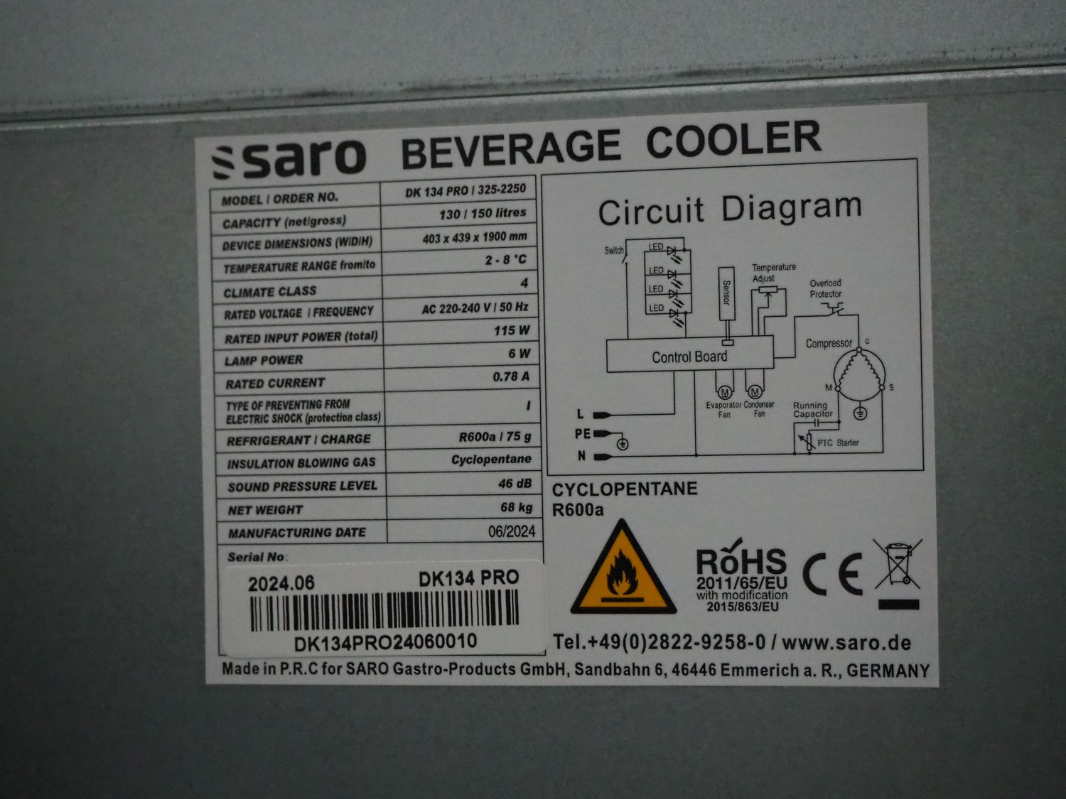 Saro refrigerator, model: DK 134 PRO / 325-2250, serial number: DK134PRO24060010, year of construction: 2024, 220-240 V, 50 Hz, 0.78 A, 115 W, refrigerant: R600a/75 g, 6 racks, dimensions racks: (6x) 305 mm x 290 mm, total dimensions: 420 mm x 310 mm x 1900 mm.