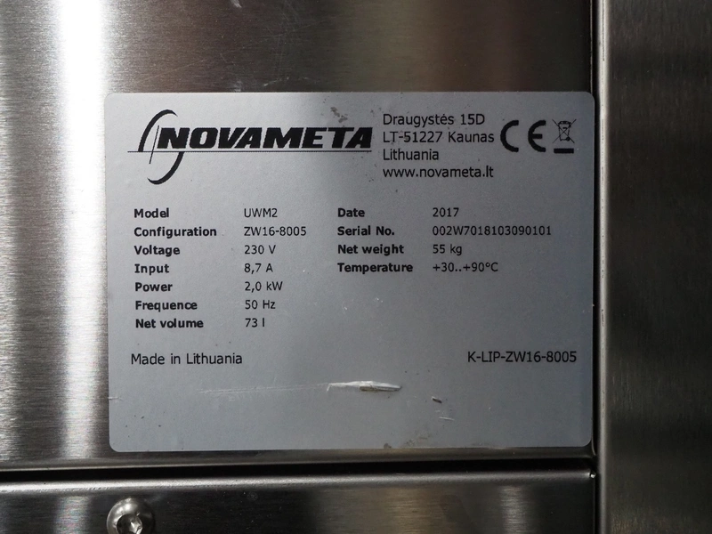 Novameta au bain-marie, model: UWM2, serial number: 002W7018103090101, year of construction: 2017, 230 V, 50 Hz, 8.7 A, 2.0 kW, volume: 73 liter, weight: 55 kg, dimensions: 680 mm x 1210 mm x 290 mm.