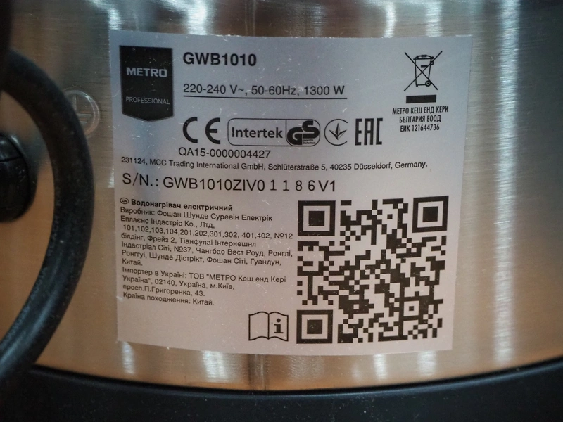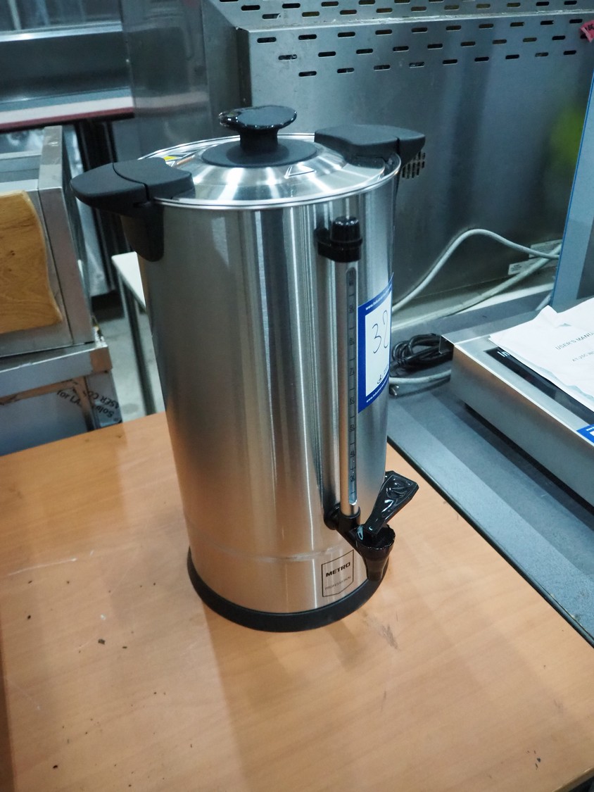 Metro coffee dispenser, model: GWB1010, serial number: GWB1010ZIV01186V1, 220-240 V, 50-60 Hz, 1300 W, volume: 10 litres, dimensions: 300 mm x 300 mm x 480 mm.