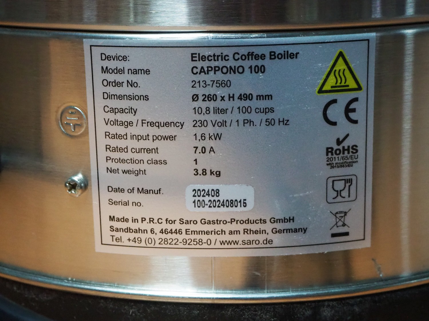 Saro Gastro-Products GmbH coffee boiler, model: CAPPONO 100, serial number: 100-202408015, year of construction: 202408, 230 V, 1 Ph, 50 Hz, 7.0 A, 1.6 kW, dimensions: 350 mm x 300 mm x 550 mm.