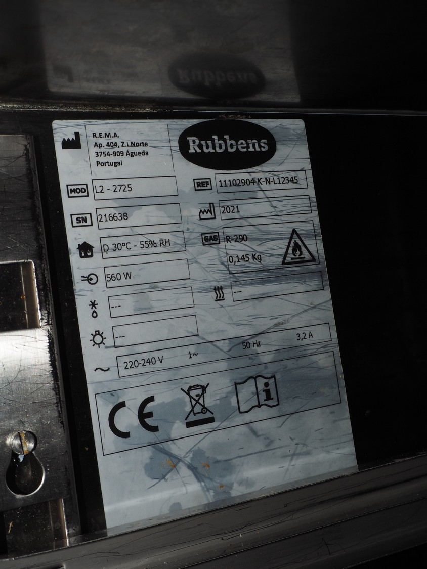 Rubbens refrigeration counter, model: L2-2725, serial number: 216638, year of construction: 2021, 220-240 V, 1 Ph, 50 Hz, 3.2 A, refrigerant: R290/0.145kg, dimensions: 710 mm x 2720 mm x 880 mm.