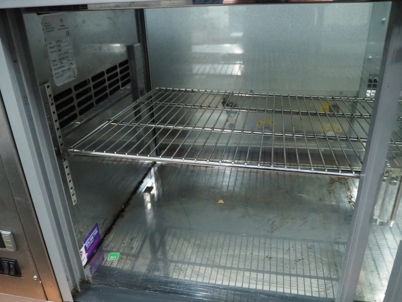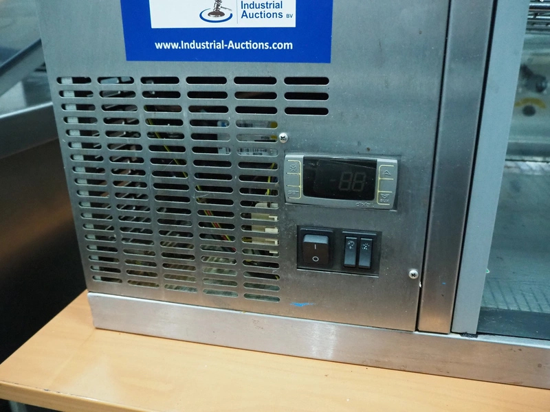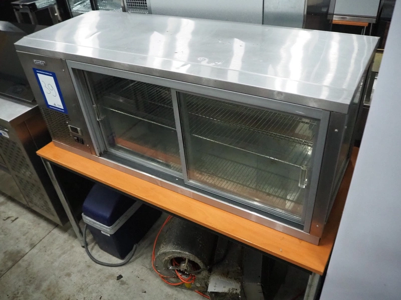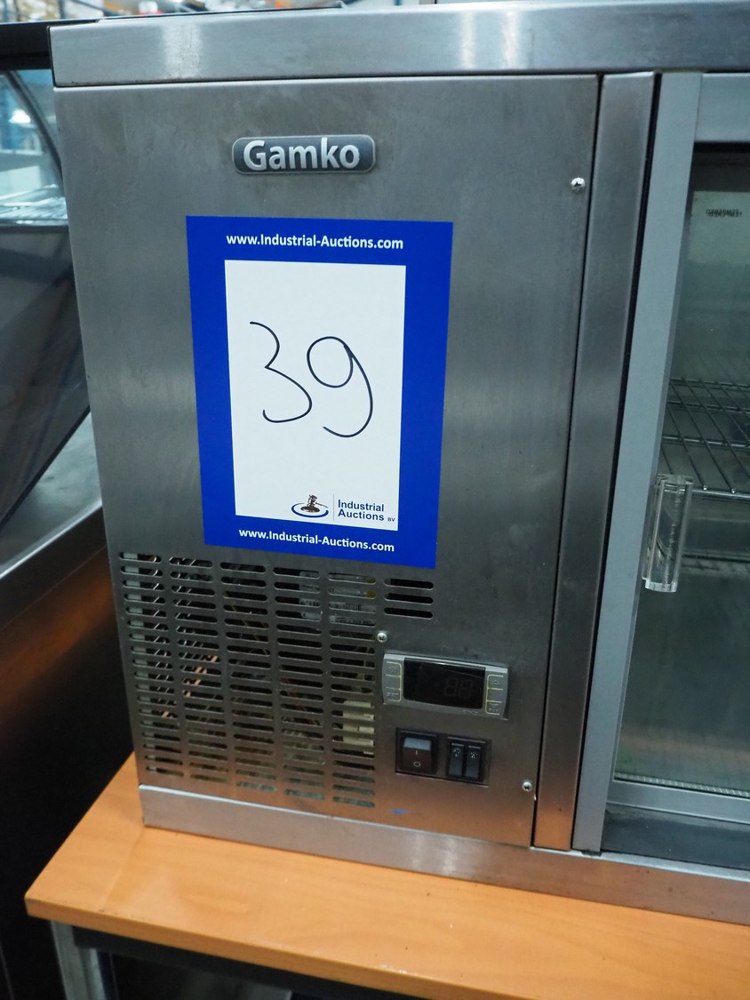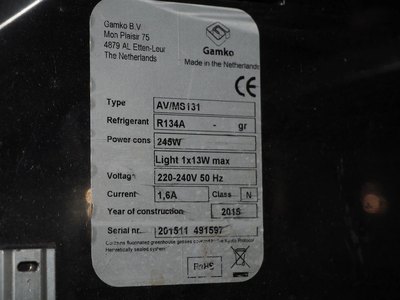 Gamko B.V. cooled showcase cabinet, type: AV/MS131, serial number: 201511 491597, year of construction: 2015, 220-240 V, 50 Hz, 1.6 A, 245 W, refrigerant: R134a, inside dimensions: 945 mm x 410 mm, total dimensions: 510 mm x 1310 mm x 535 mm. Missing door rail.