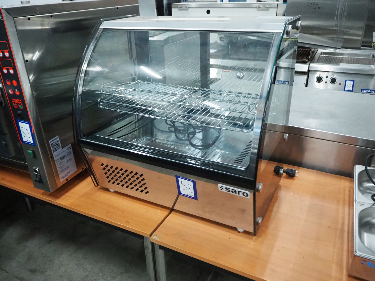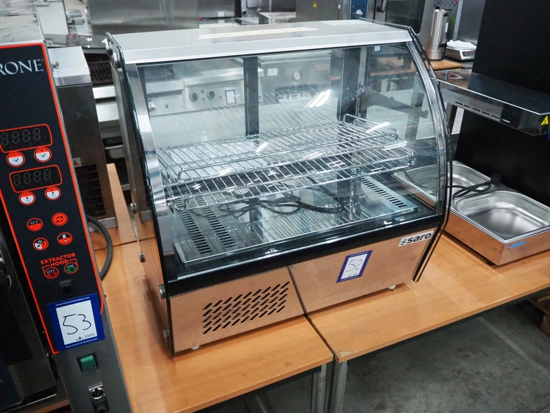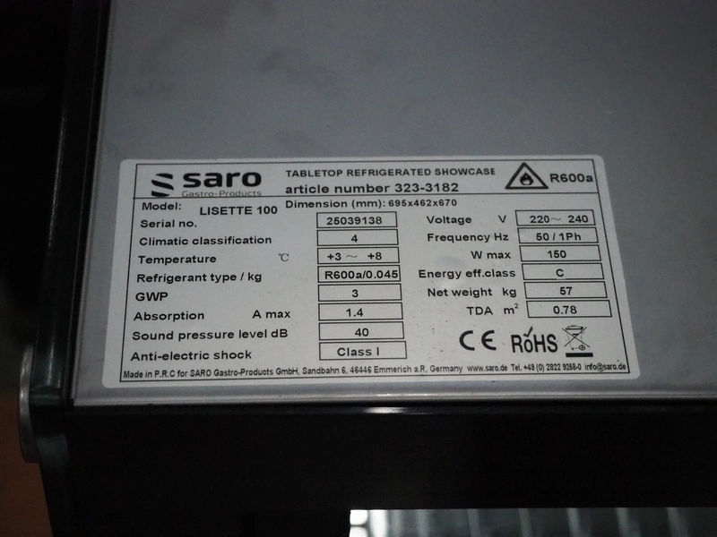 Saro tabletop refrigerated showcase, model: LISETTE 100, serial number: 25039138, 220-240 V, 1 Ph, 50 Hz, refrigerant: R600a/0.045 g, dimensions: 430 mm x 700 mm x 685 mm.
