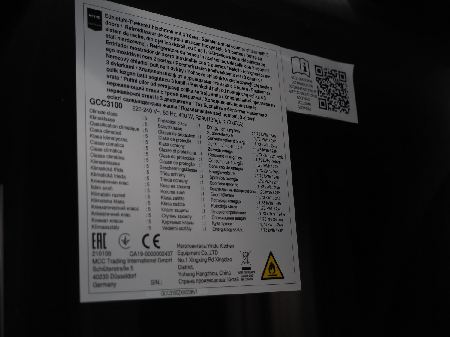 Metro refrigeration counter, type: GCC3100, serial number: GCC3100ZCII0038V1, 220-240 V, 50 Hz, 400 W, refrigerant: R290/130 g, dimensions: 700 mm x 1800 mm x 835 mm. New.